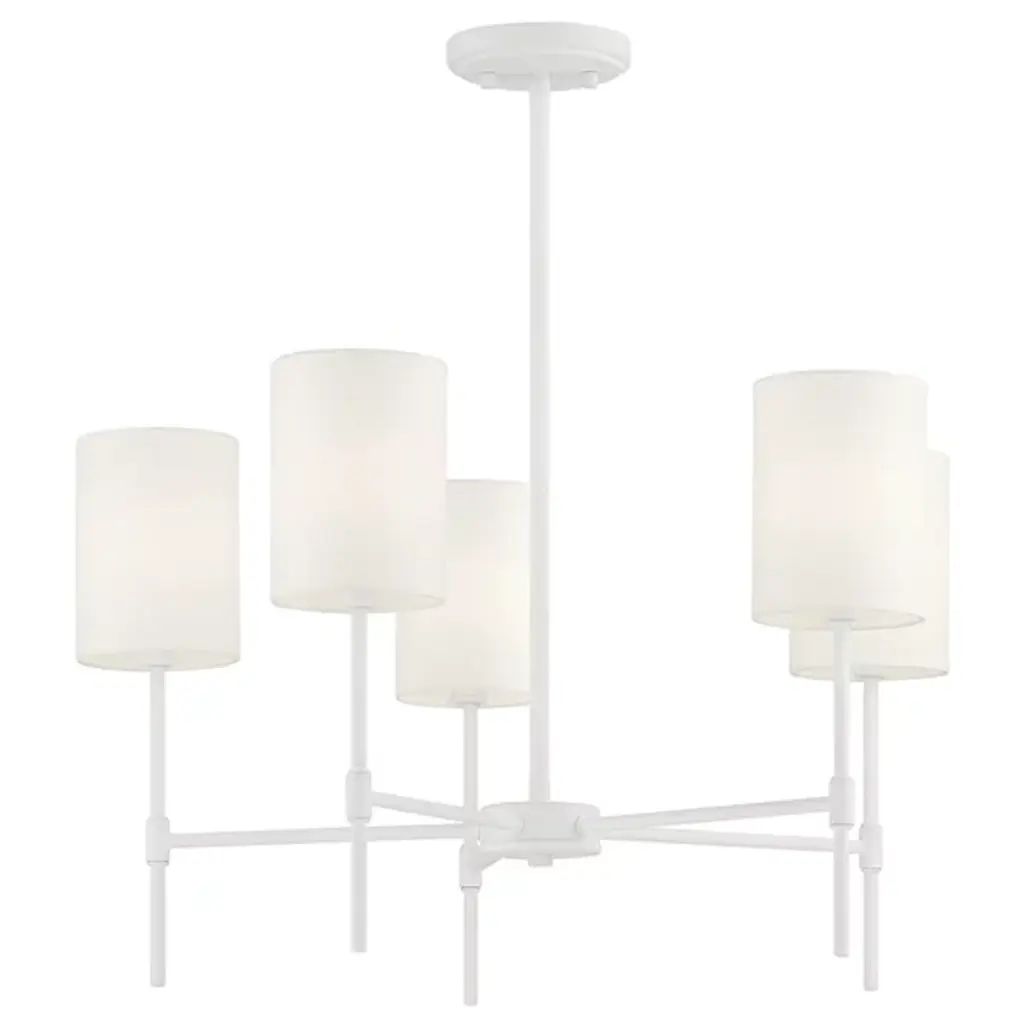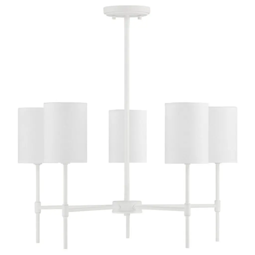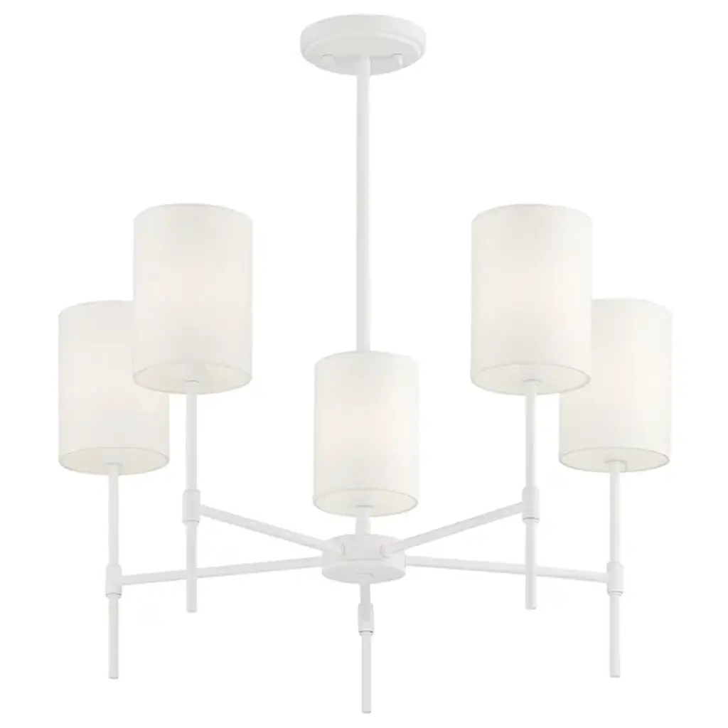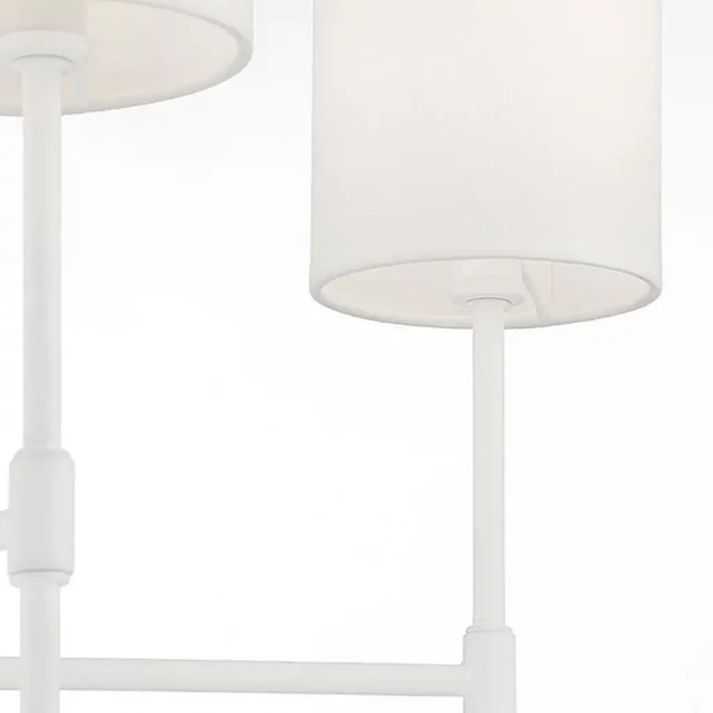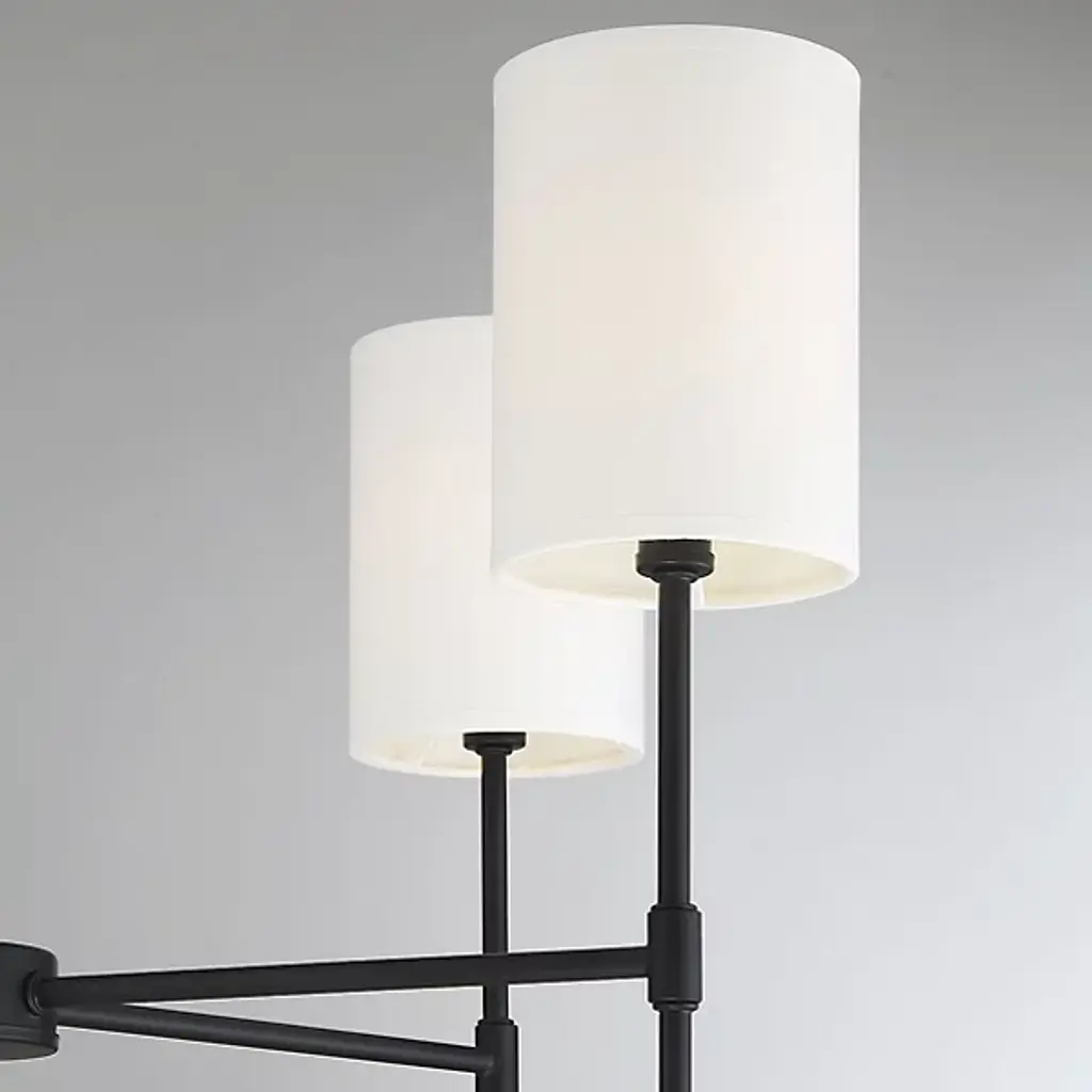 Step up your interior design with the sleek contemporary lines of the Emma Chandelier by Alder & Ore. It’s a sleek metal fixture that drops via a single stem from a stepped-disc ceiling mount. Several vertical arms are held in a parallel arrangement as they radiate out from a central hub. Each socket is covered by a cylindrical fabric shade, shedding light out from above while easing glare from the lamping into a warmer glow.