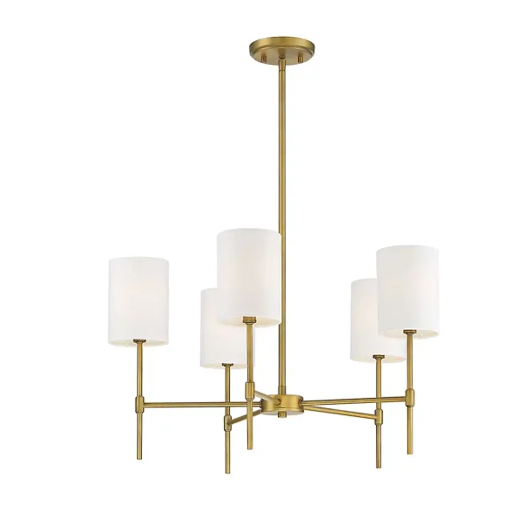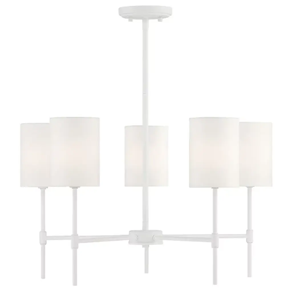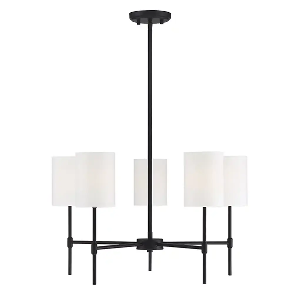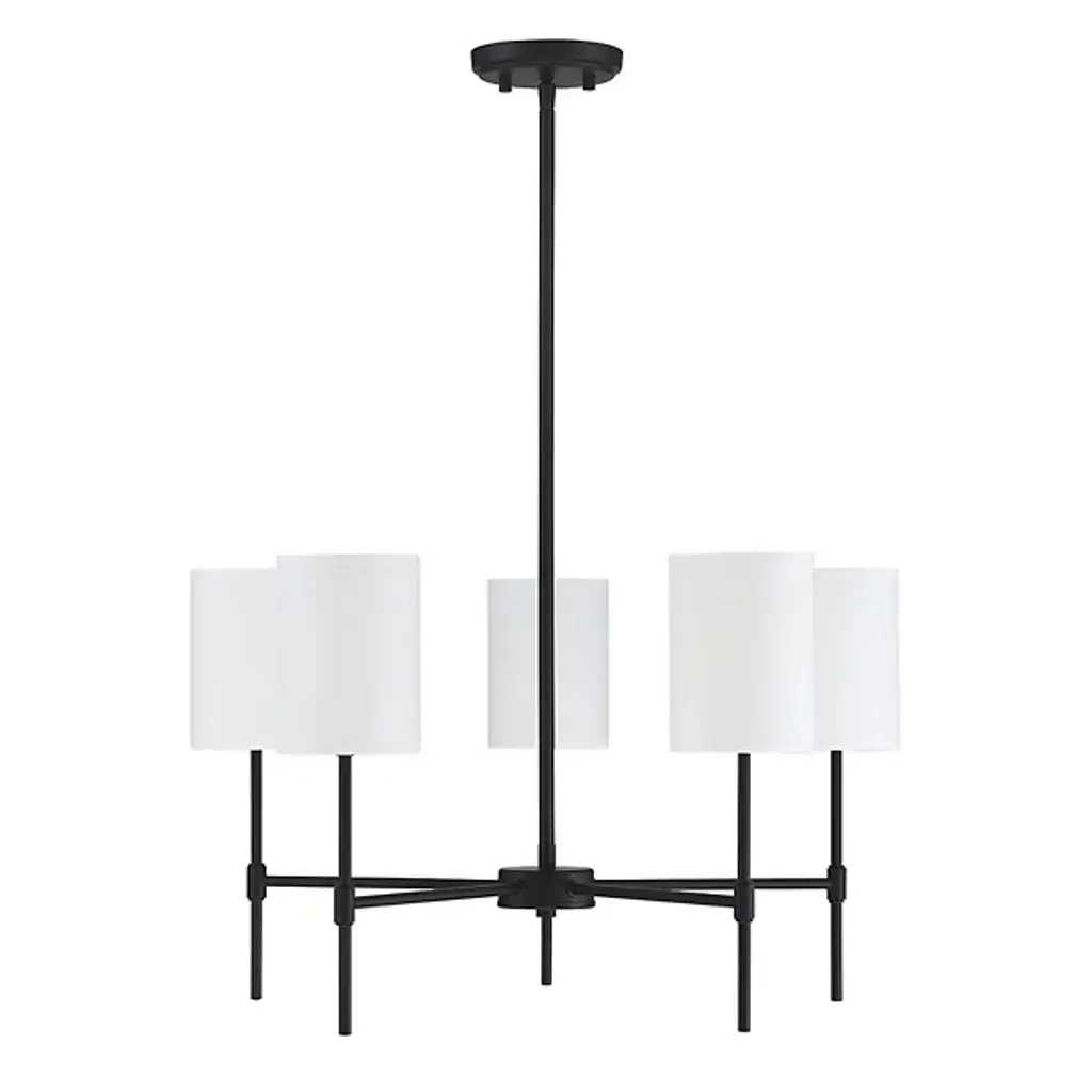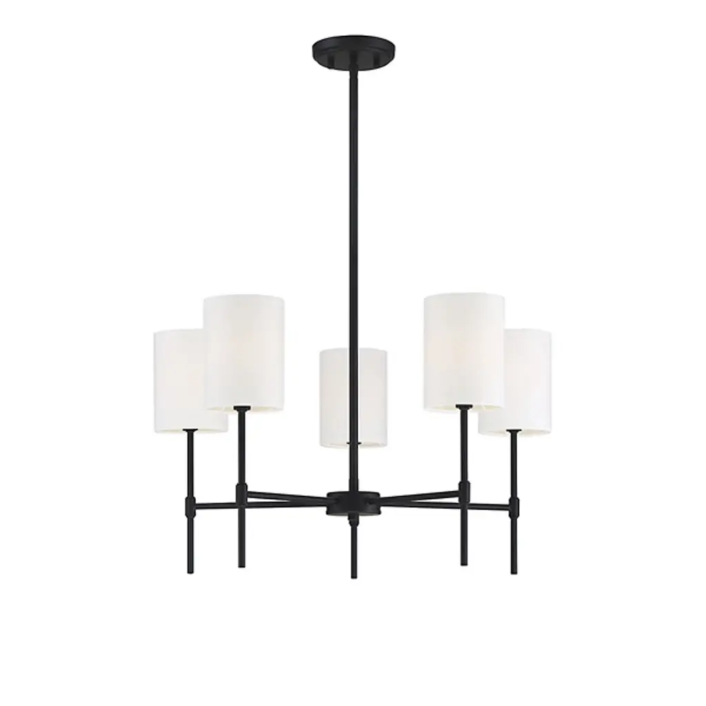 Step up your interior design with the sleek contemporary lines of the Emma Chandelier by Alder & Ore. It’s a sleek metal fixture that drops via a single stem from a stepped-disc ceiling mount. Several vertical arms are held in a parallel arrangement as they radiate out from a central hub. Each socket is covered by a cylindrical fabric shade, shedding light out from above while easing glare from the lamping into a warmer glow.