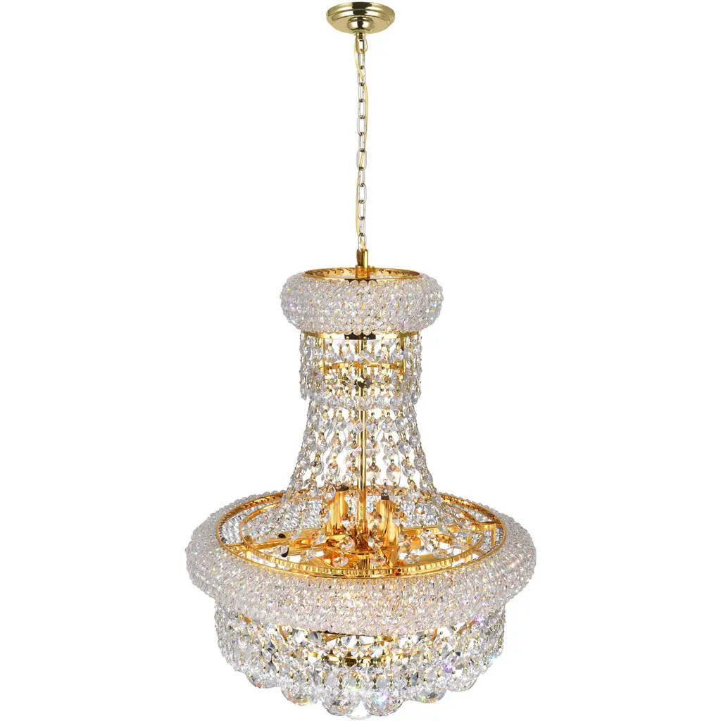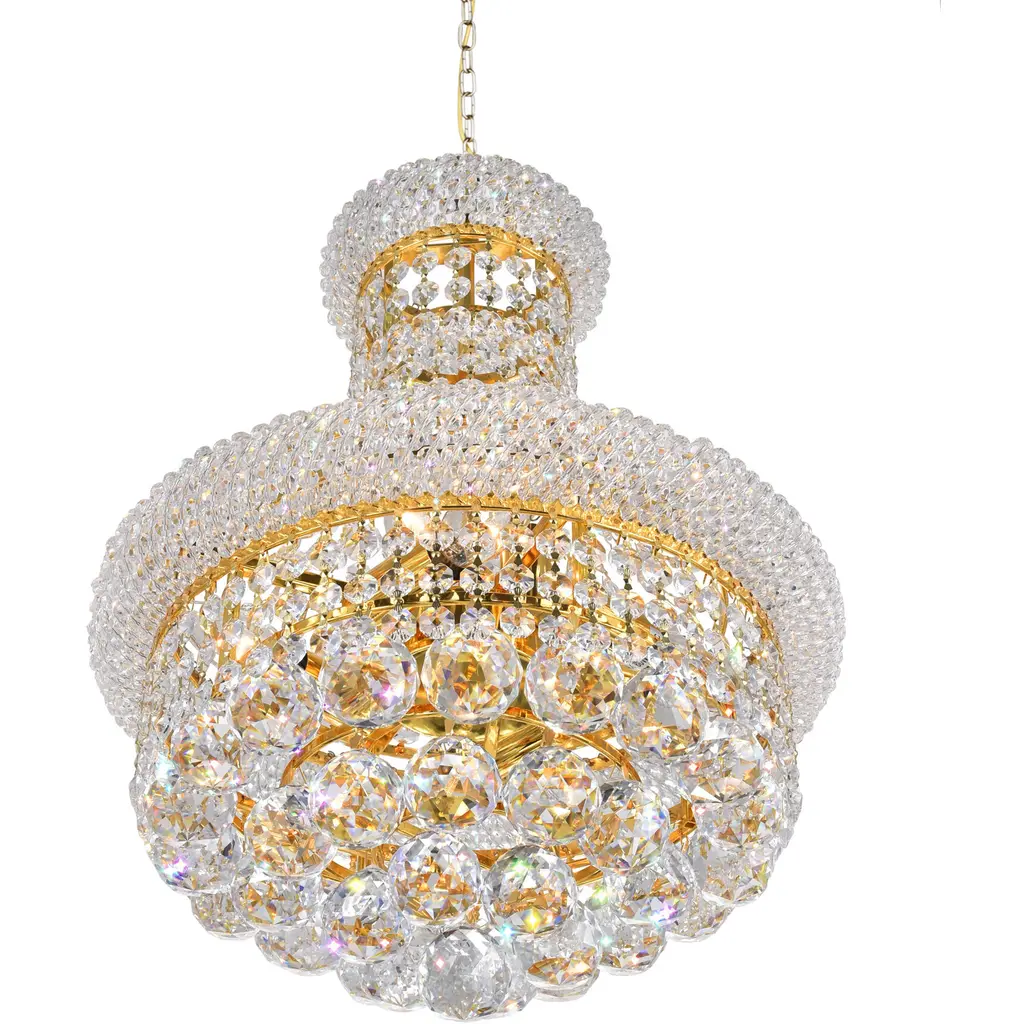The 8001P14G Pendant Light from our Empire Collection brings old-world grandeur into contemporary interiors. With a luxurious gold finish and cascading clear crystals, this 14-inch diameter pendant makes a dramatic statement despite its compact size. Featuring a 6-light design with an E12 candelabra base, it delivers an opulent glow perfect for powder rooms, foyers, or intimate dining spaces. The fixture is LED-compatible for energy-efficient lighting and is BACL Certified for safety and durability. Whether enhancing a traditional home or adding contrast to modern decor, this pendant ensures timeless elegance with every sparkle.