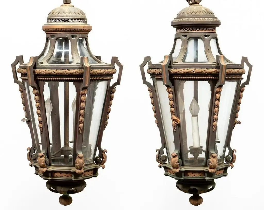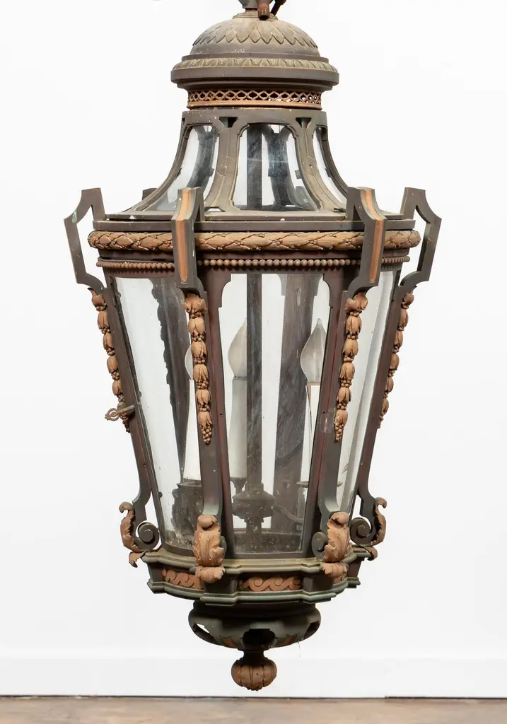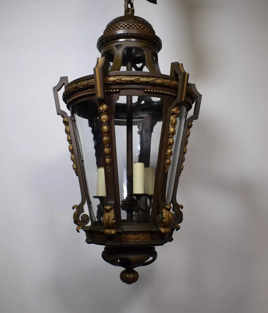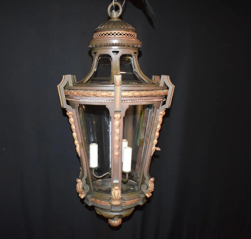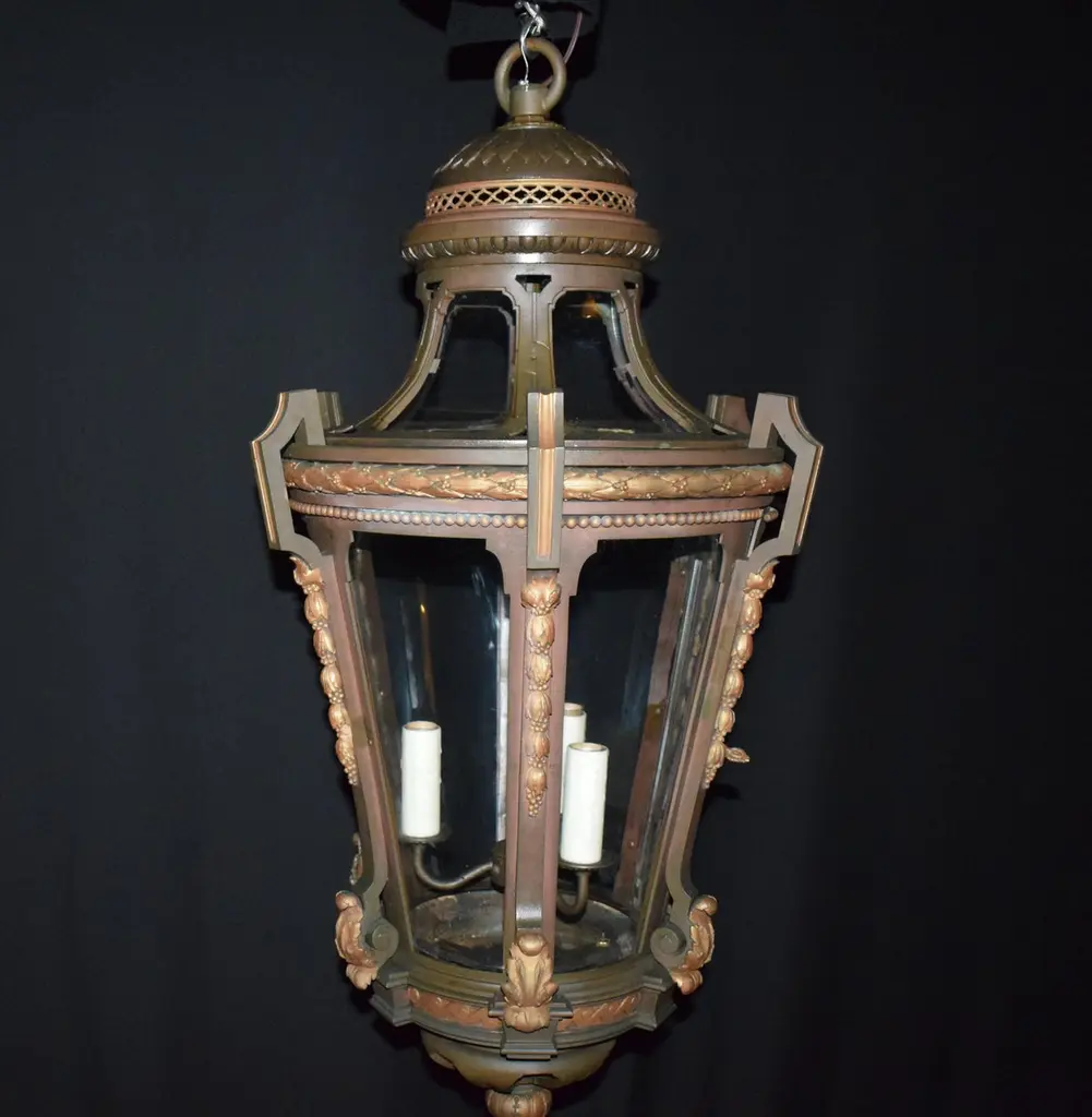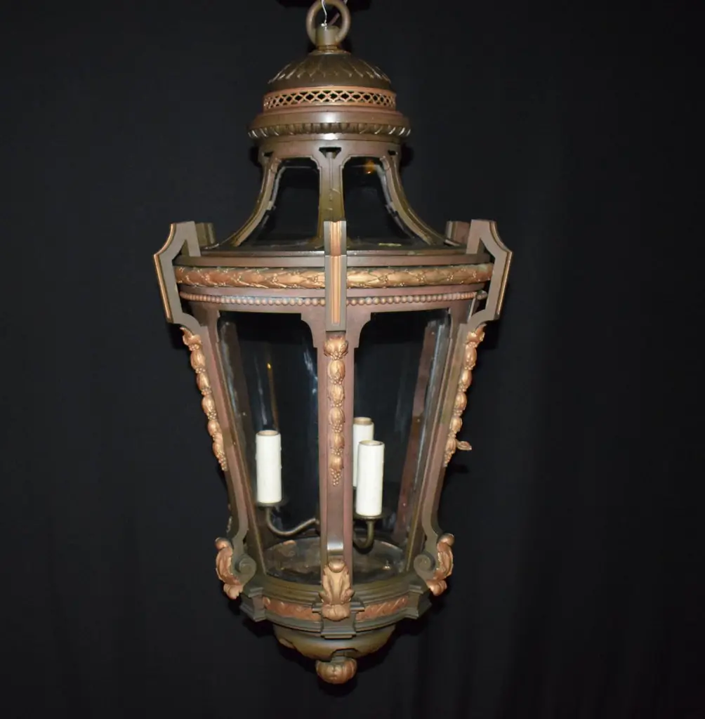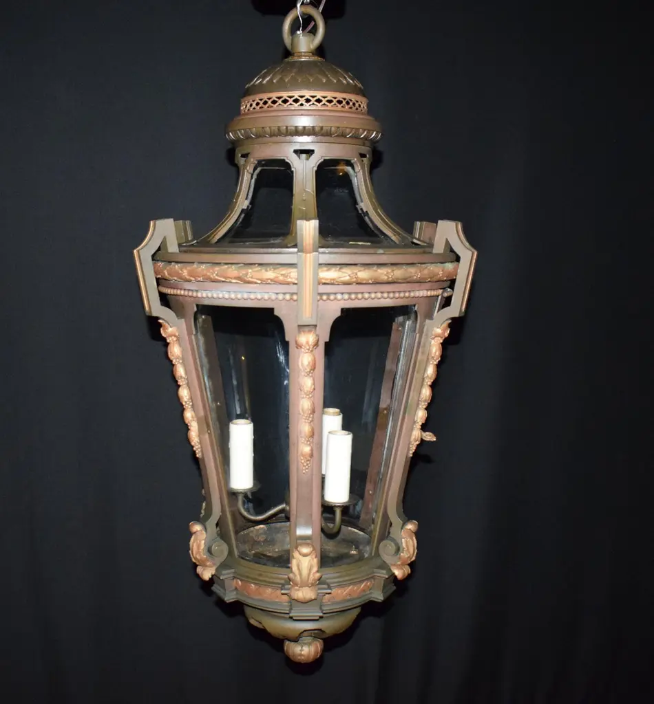 A superb Louis WVI style lantern. Two toned patinated bronze, with curved glass panels. 3-light,France, circa 1900.Apparently unmarked. Measures: Height 42", diameter 19".Pair available.CW4902 and CW4903.