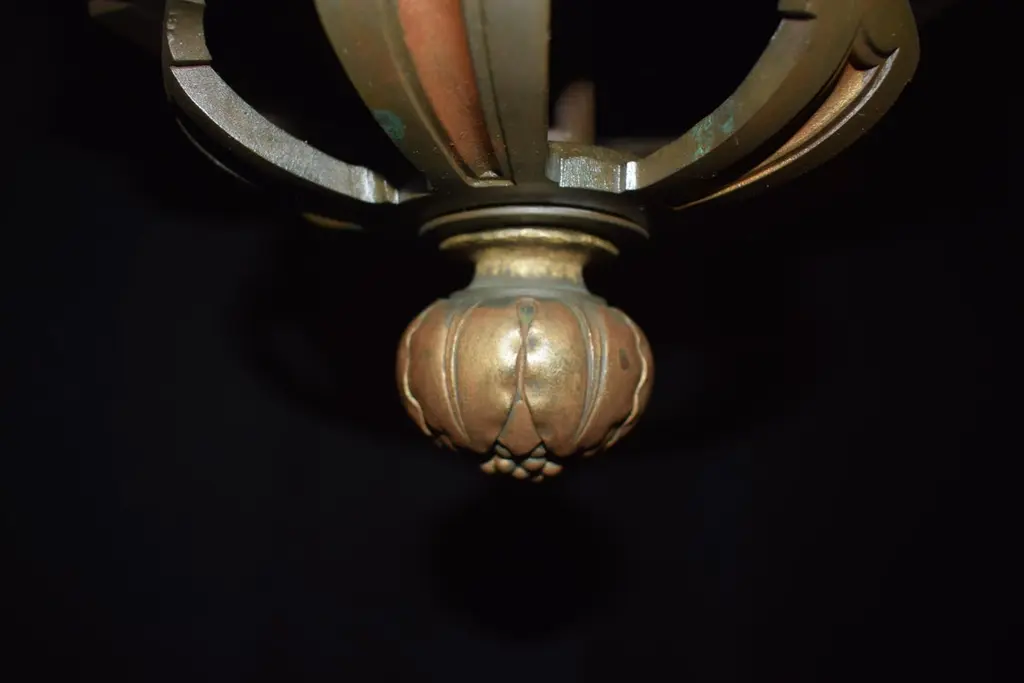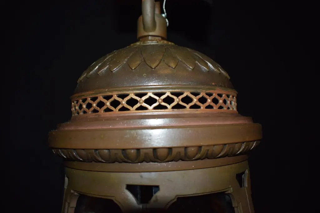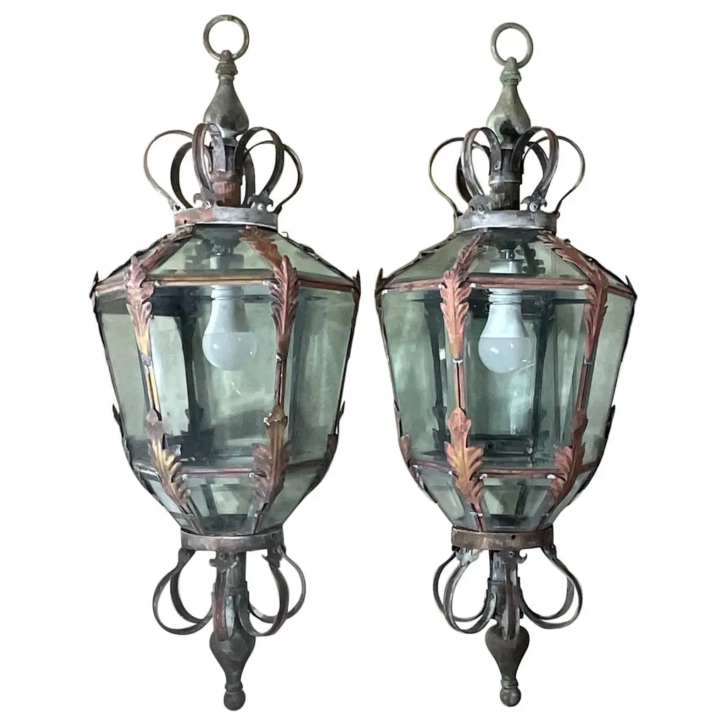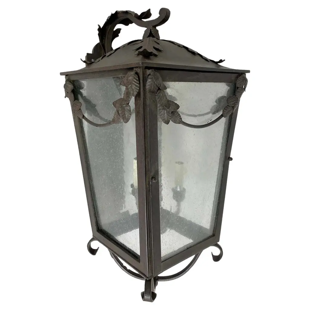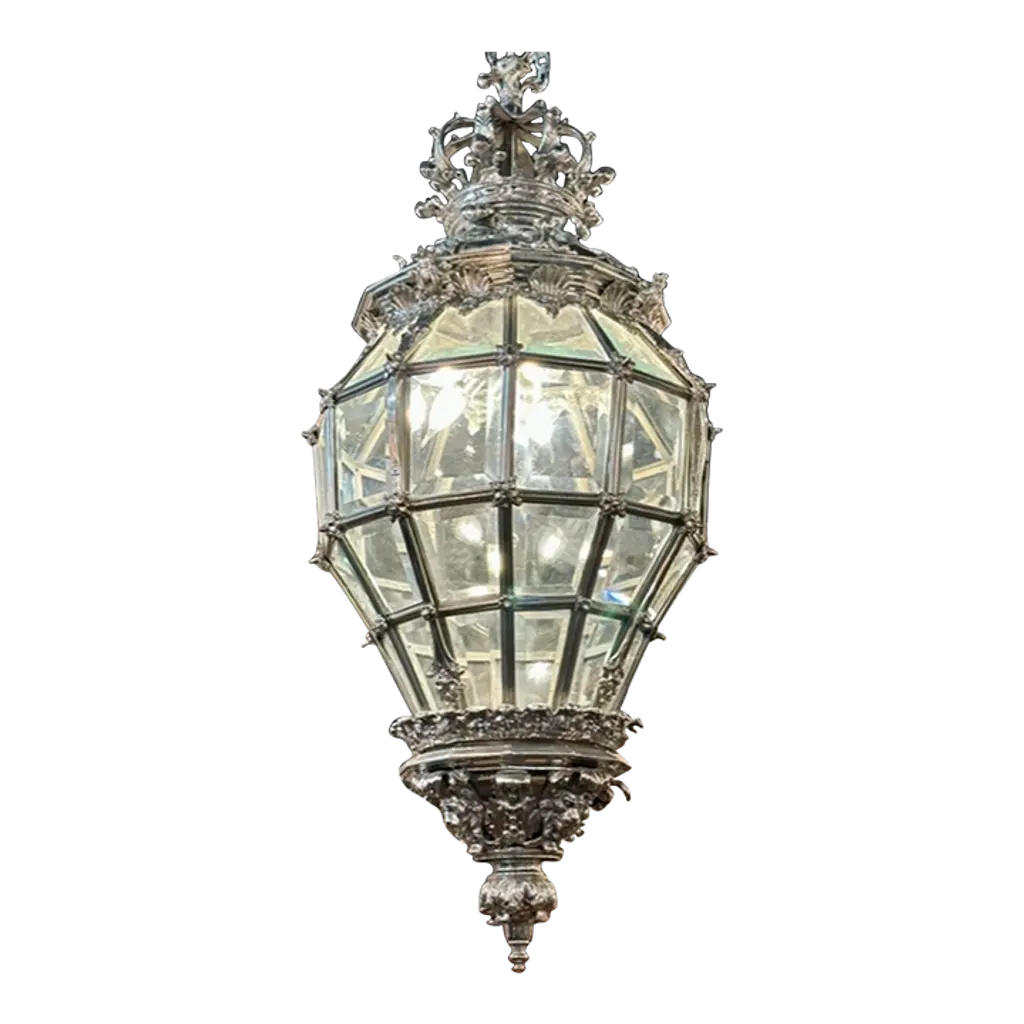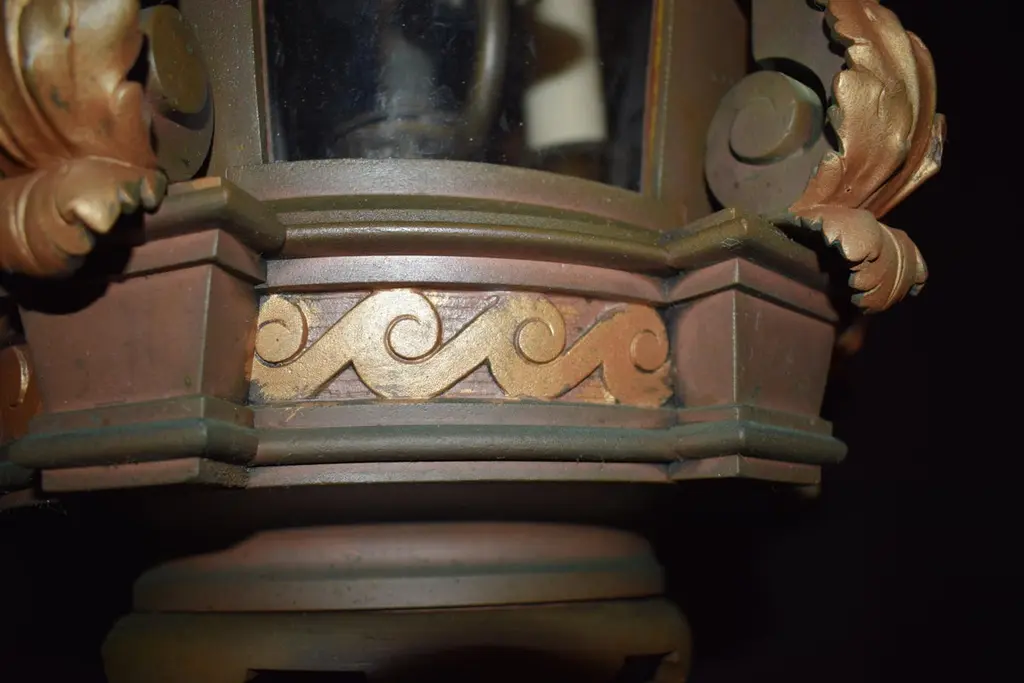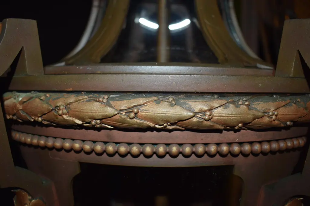 A superb Louis WVI style lantern. Two toned patinated bronze, with curved glass panels. 3-light,France, circa 1900.Apparently unmarked. Measures: Height 42", diameter 19".Pair available.CW4902 and CW4903.