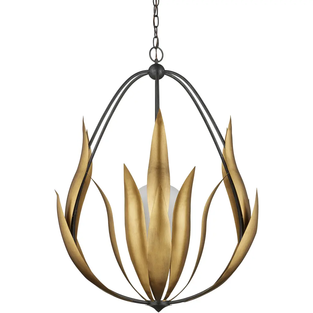 Perfectly pear-shaped, the Endymion Chandelier has a wire cage made of wrought iron in an aged steel finish from which undulant leaves in a brass finish flow upwards. The narrowing metal ornamentations reflect the light that glows from within a central white glass globe. Creating fluid designs from resolute metal to bring the feel of nature indoors is a fascination our designers continue to explore. Adjustable from 38.5" to 106.5" with use of included chain/rod kit/cable. If your space calls for a longer drop, additional chain/rods/cable is available for purchase.