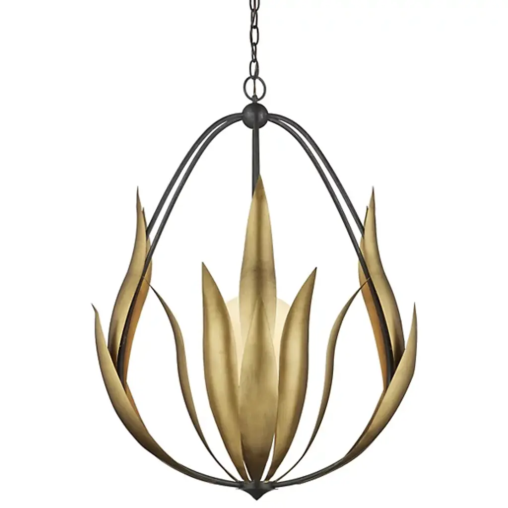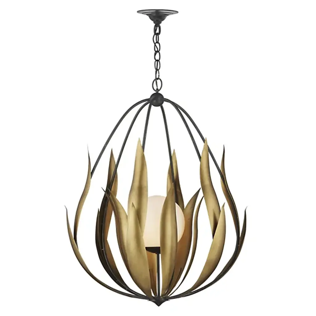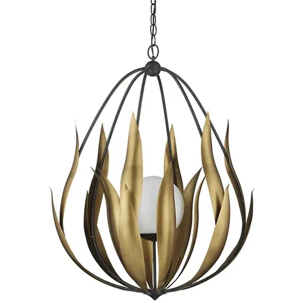 The Endymion Chandelier from Currey & Company refashions natural forms through metalwork artistry. A pear-shaped wire cage houses undulating metal leaves that sweep upward in an organic dance. At its heart, a glass globe diffuses light through the sculptural framework. The mixed metal finishes create depth and dimension throughout the piece. This nature-inspired design demonstrates the artisans' skill in converting rigid materials into fluid, botanical forms. The chandelier’s adjustable chain system allows for custom installation heights.
