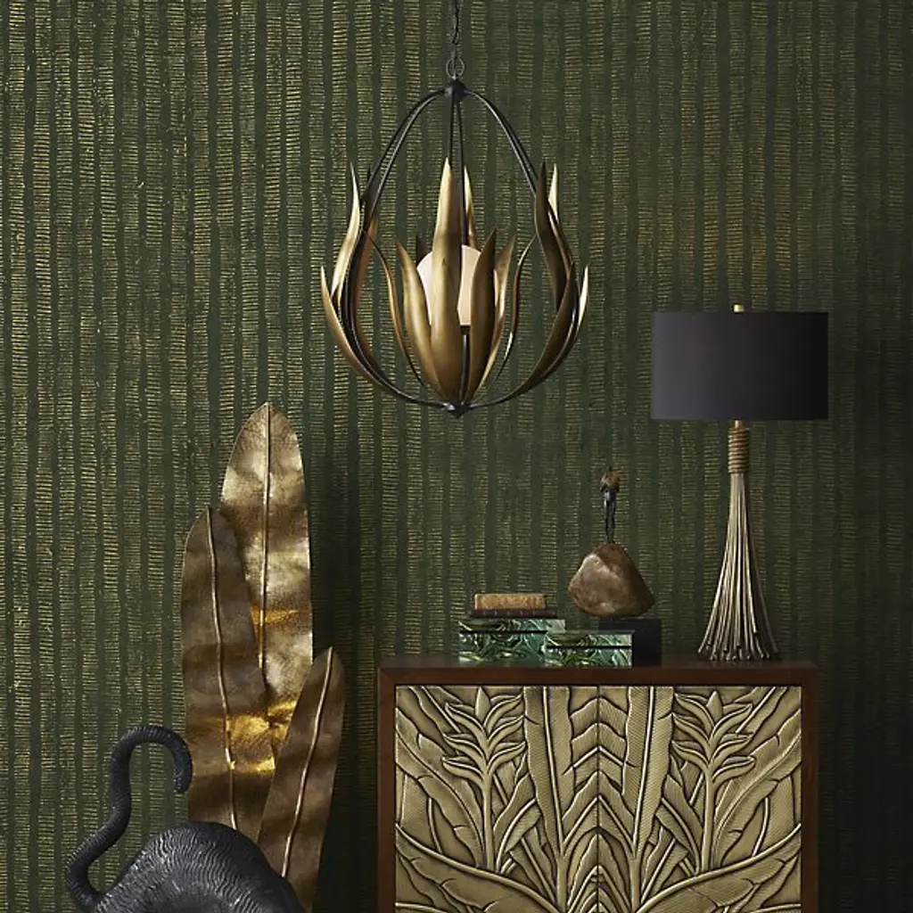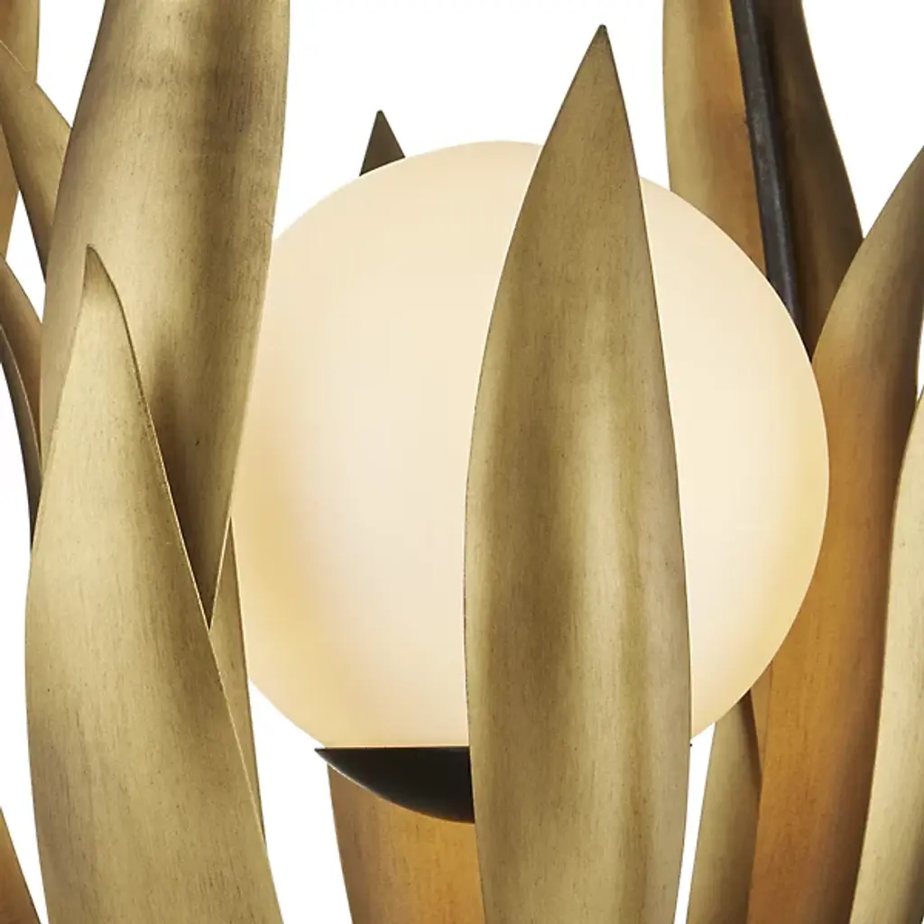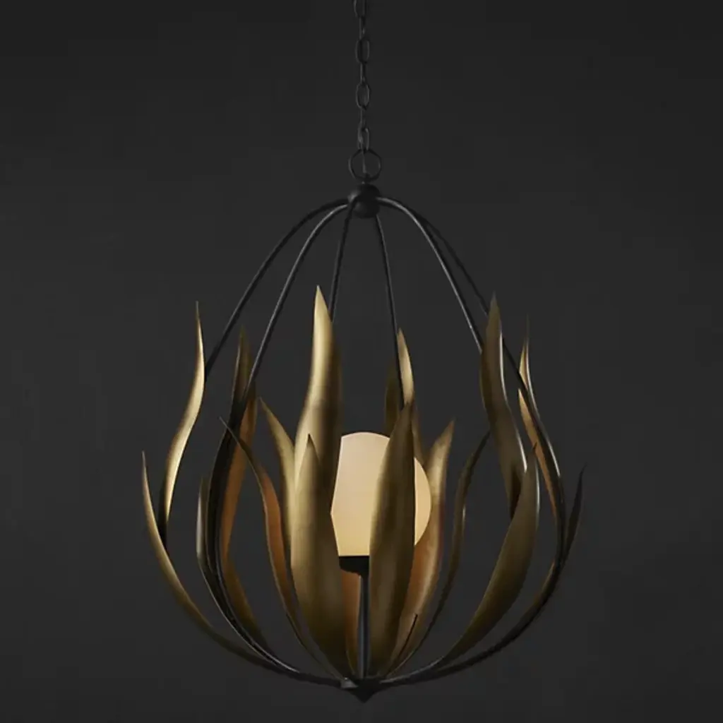 The Endymion Chandelier from Currey & Company refashions natural forms through metalwork artistry. A pear-shaped wire cage houses undulating metal leaves that sweep upward in an organic dance. At its heart, a glass globe diffuses light through the sculptural framework. The mixed metal finishes create depth and dimension throughout the piece. This nature-inspired design demonstrates the artisans' skill in converting rigid materials into fluid, botanical forms. The chandelier’s adjustable chain system allows for custom installation heights.