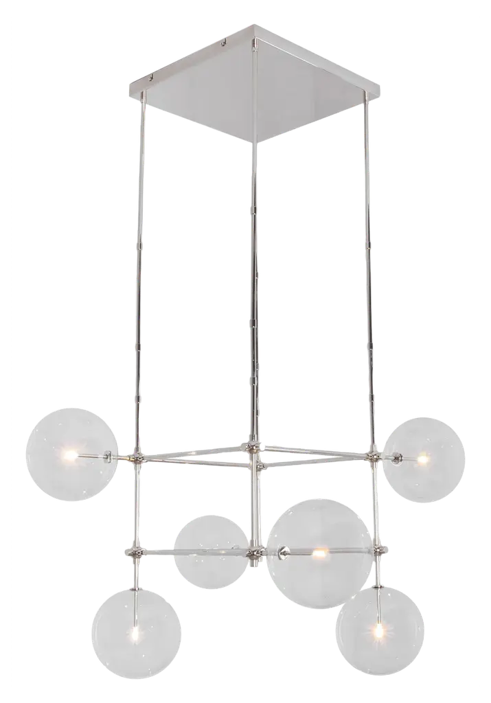 7-Light 50" Linear Dining Chandelier with Clear Glass Globes and Polished Nickel Finish.