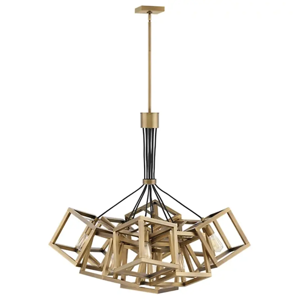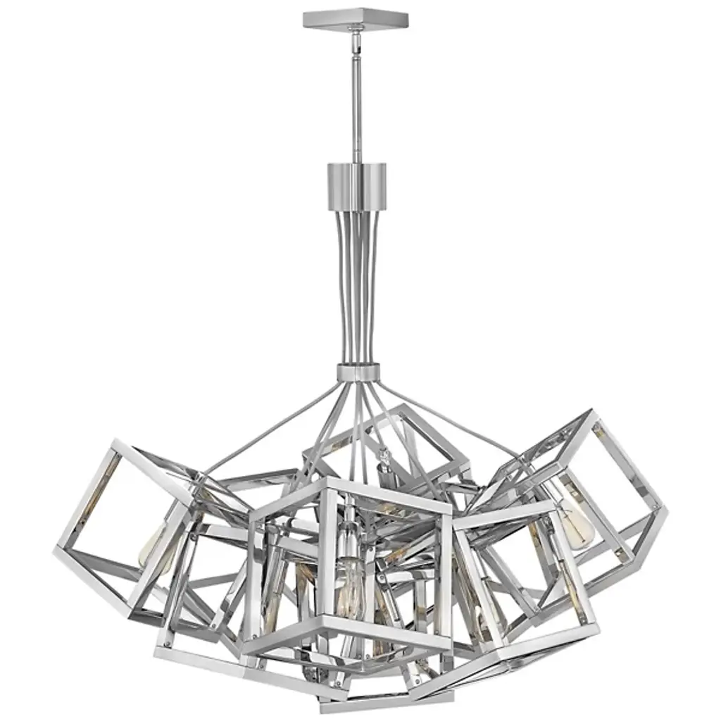 Modern, sleek geometry with an antique flare. The Fredrick Ramond Ensemble Chandelier features hollow boxes all converging at different angles finished in a Polished Nickel. These boxes are made out of steel, which makes sure that they will last a long time. Each box holds its own exposed bulb—add an antique reproduction bulb if you are looking for a retro twist— and is hung with sleek, gray wires connecting to a 5-inch square canopy.