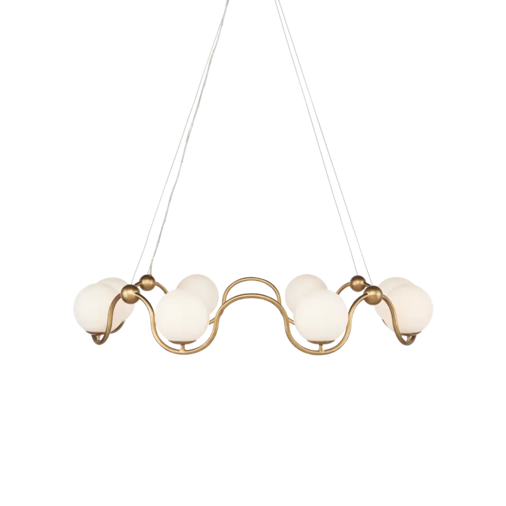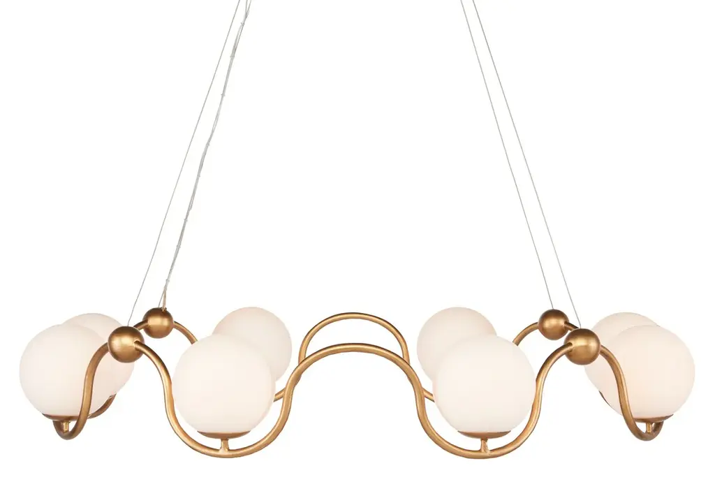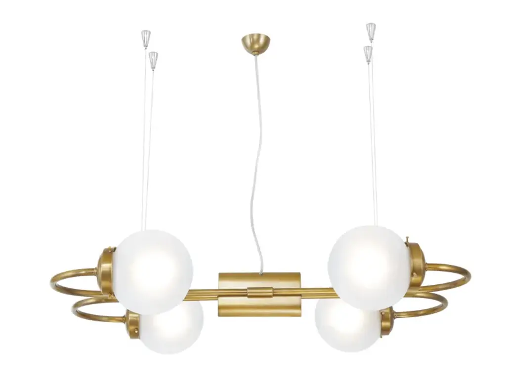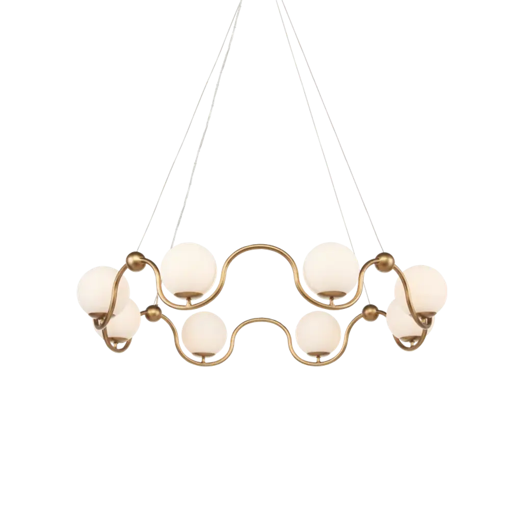 The Equilibrium chandelier is a gold chandelier with lovely glowing globes inspired by Milano aesthetics. The way the undulant frame swirls around the opaque white glass globes allows the composition to maintain its balance perfectly. The antique brass finish on the wrought iron frame is a warm contrast. A design that is still di rigor in the great opera houses in Italy's most fashionable city of Milan, it brings with it a seriously refined aesthetic.