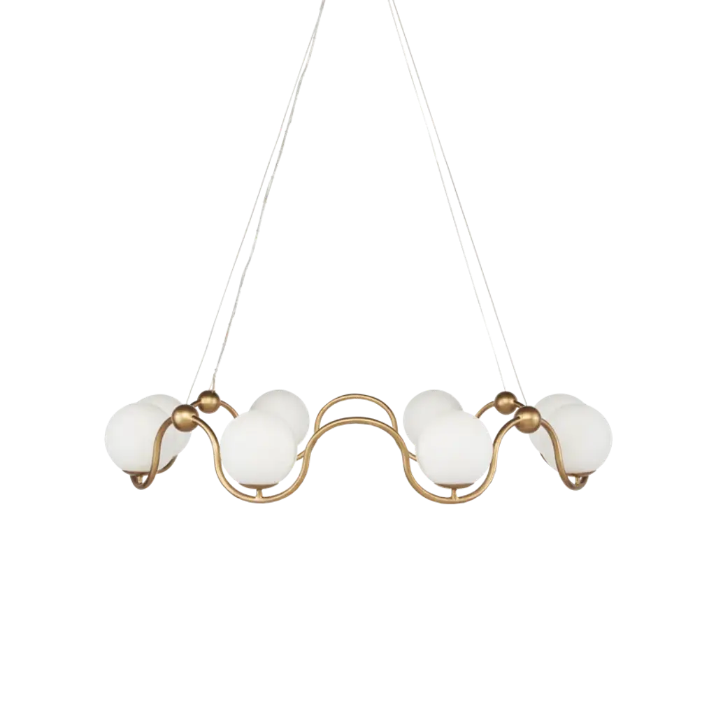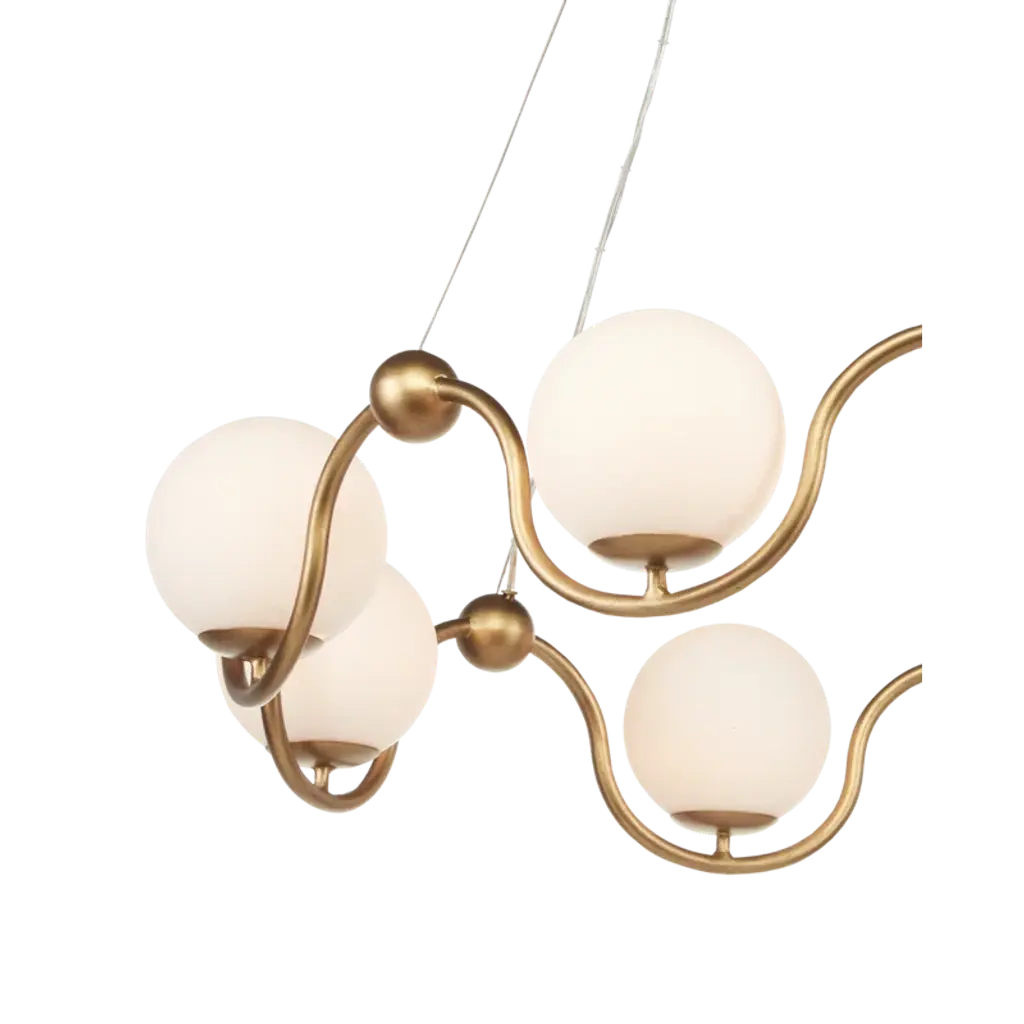 The Equilibrium Chandelier is a gold chandelier with lovely glowing globes inspired by Milano aesthetics. The way the undulant frame swirls around the opaque white glass globes allows the composition to maintain its balance perfectly. The antique brass finish on the wrought iron frame is a warm contrast. A design that is still di rigore in the great opera houses in Italy's most fashionable city of Milan, it brings with it a seriously refined aesthetic. Adjustable from 35" to 120" with use of included chain/rod kit/cable. If your space calls for a longer drop, additional chain/rods/cable is available for purchase.