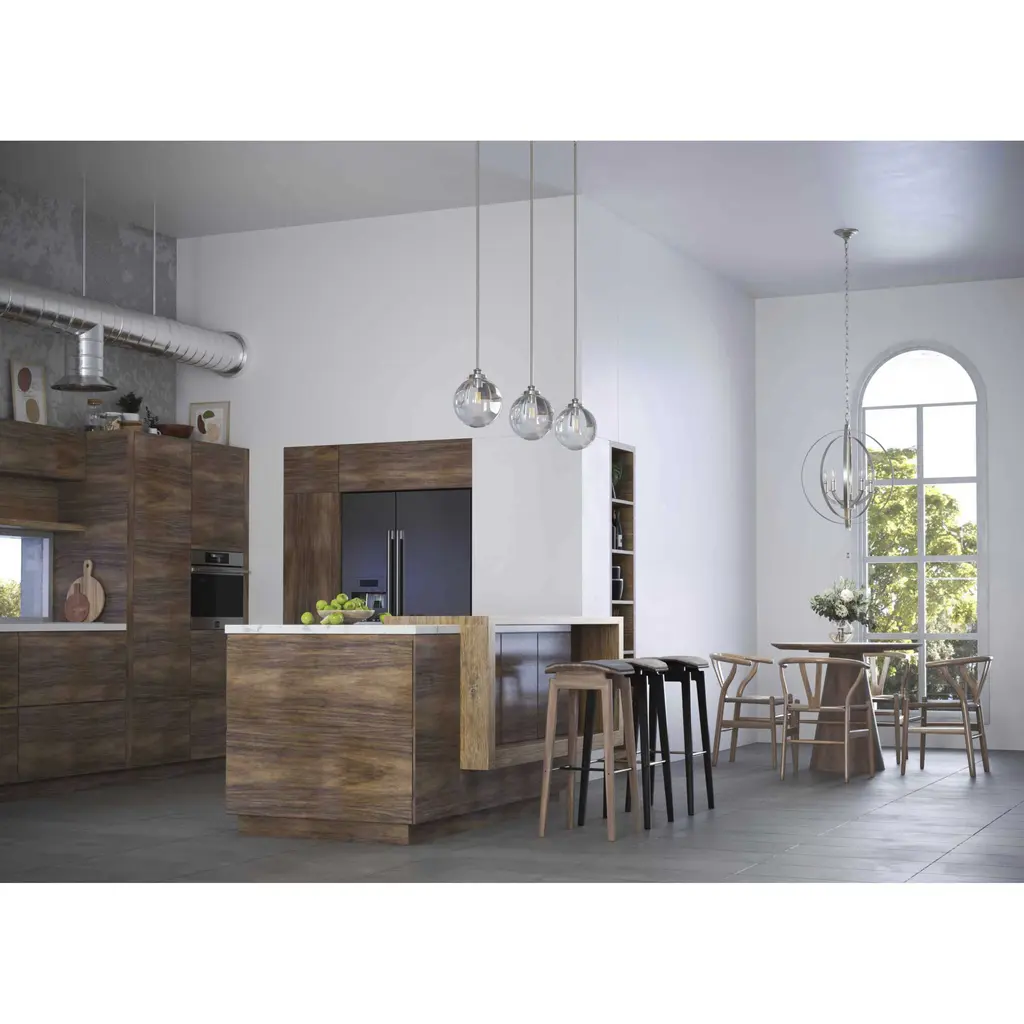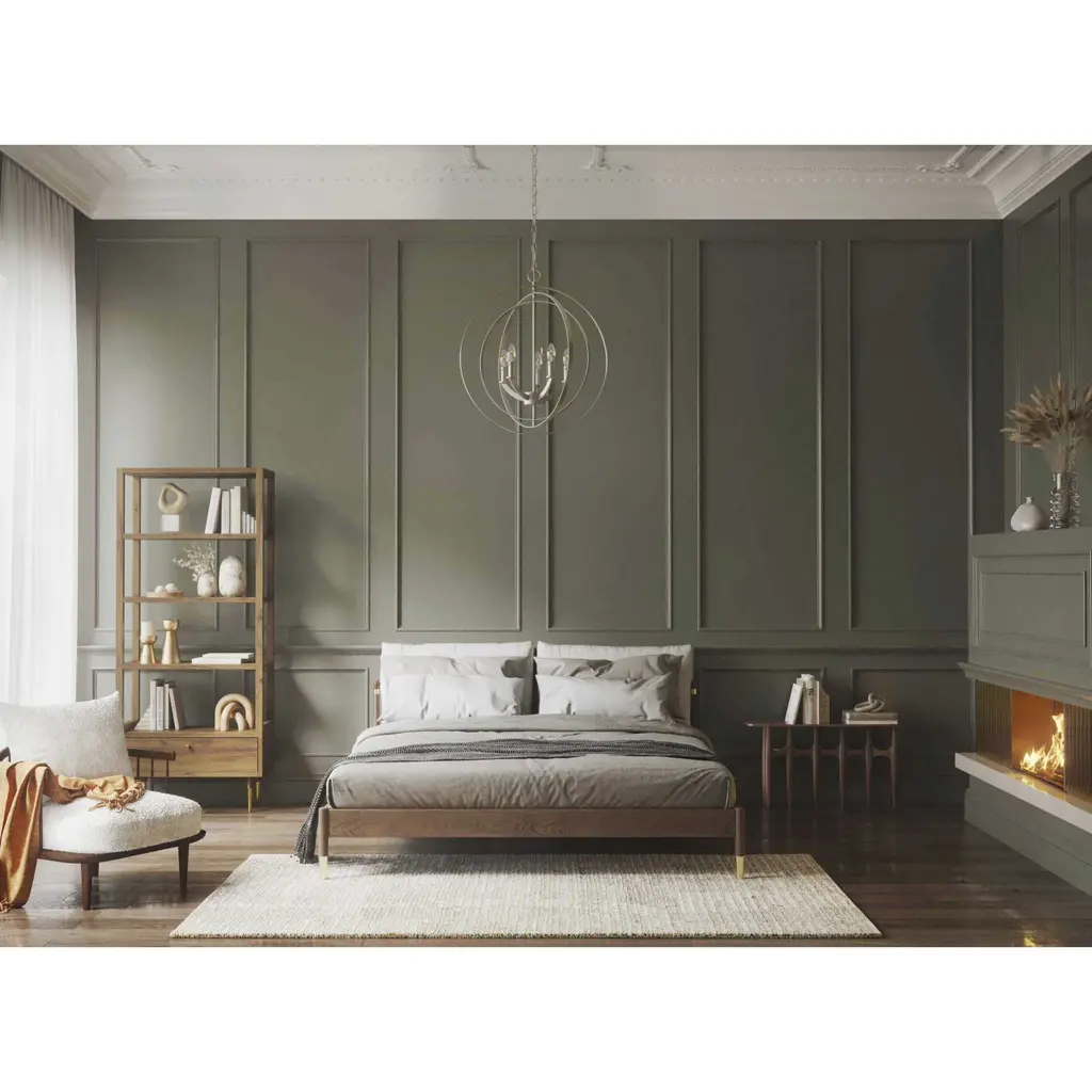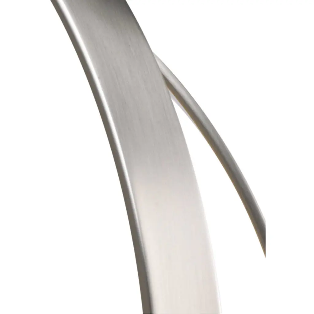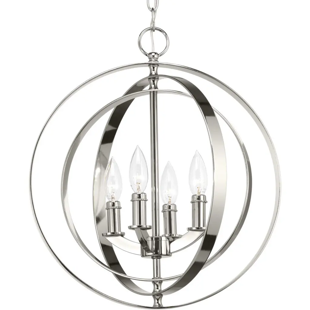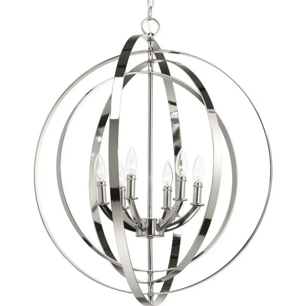 Inspired by ancient astronomy armillary spheres, the interlocking rings pivot for an infinite variety of positions. Five-light chandelier pendant in Burnished Silver is ideal for installations over a farmhouse table, dining room setting or kitchen island. Can be used individually or in groupings of two or more.