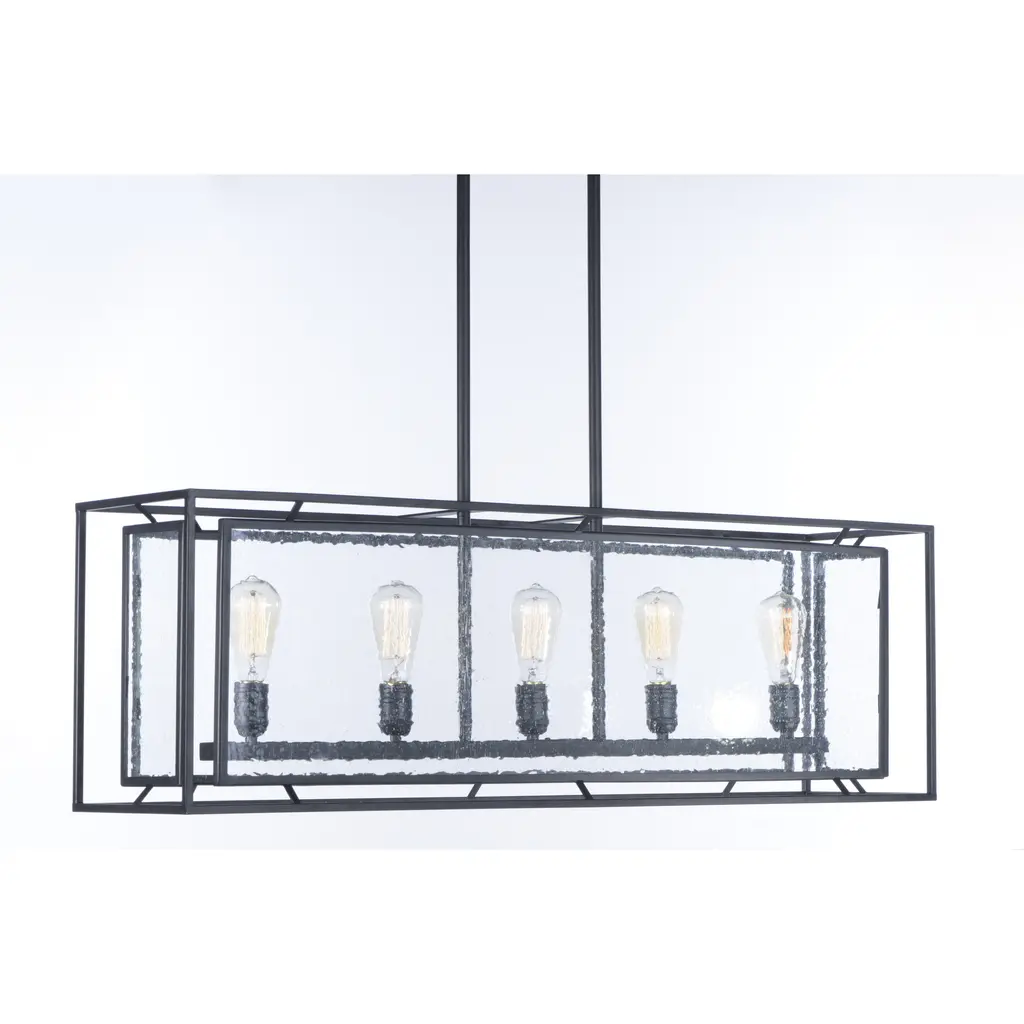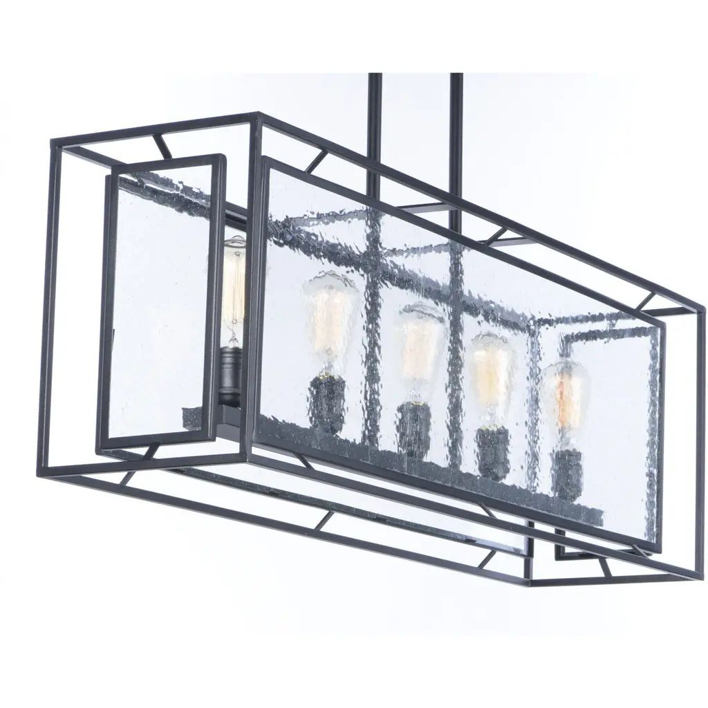 Geometric metal frames finished in Black support panes of clear Seedy glass, provides for a refined restoration look. Add vintage bulbs (not included) to complete the authentic feel of this design.