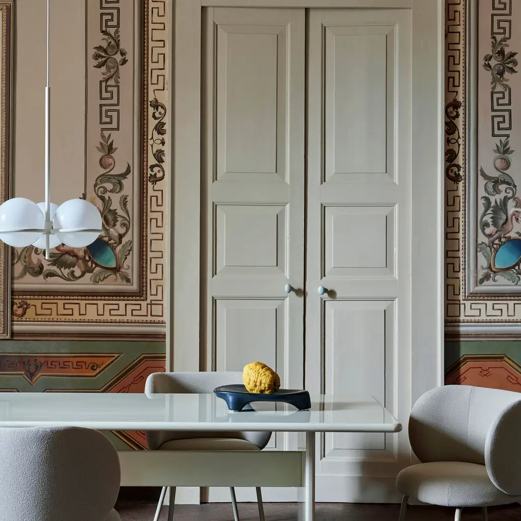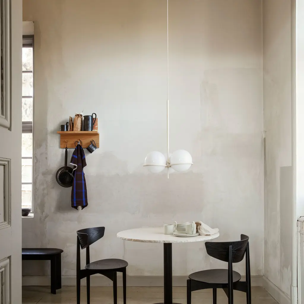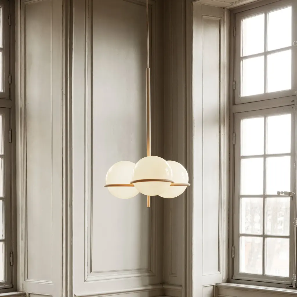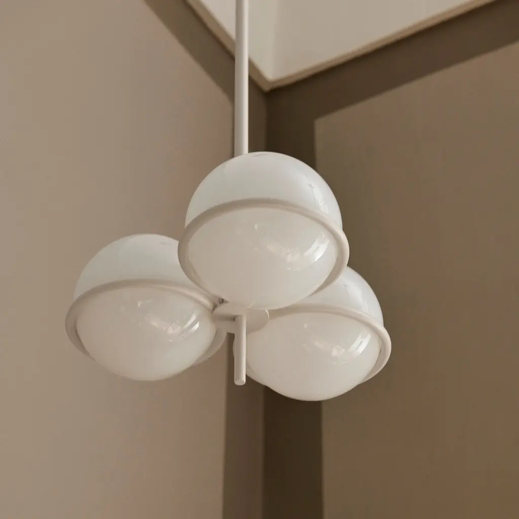 Though resolutely clean and modern, Era Chandelier was inspired by the clear lines and geometric shapes of an earlier period, 1920s Art Deco. A trio of opal glass globes rest effortlessly on a slim, powder-coated iron structure, making a timeless statement yet nodding to the distinctive era—to light up a hall corridor, stairway or the conversation at a dinner table.