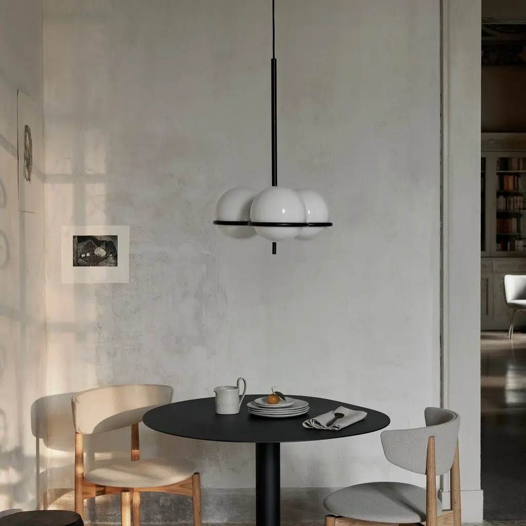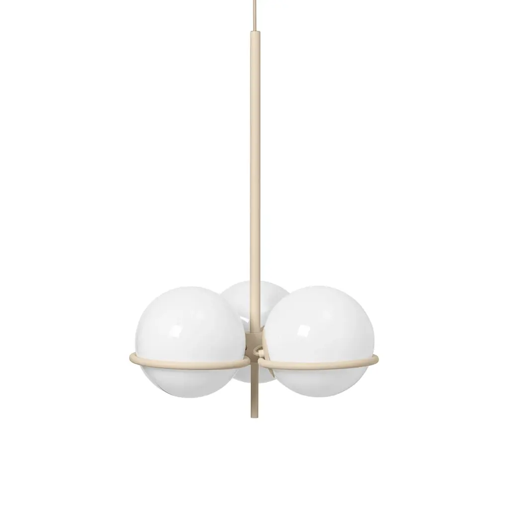 Though resolutely clean and modern, Era Chandelier was inspired by the clear lines and geometric shapes of an earlier period, 1920s Art Deco. A trio of opal glass globes rest effortlessly on a slim, powder-coated iron structure, making a timeless statement yet nodding to the distinctive era—to light up a hall corridor, stairway or the conversation at a dinner table.
