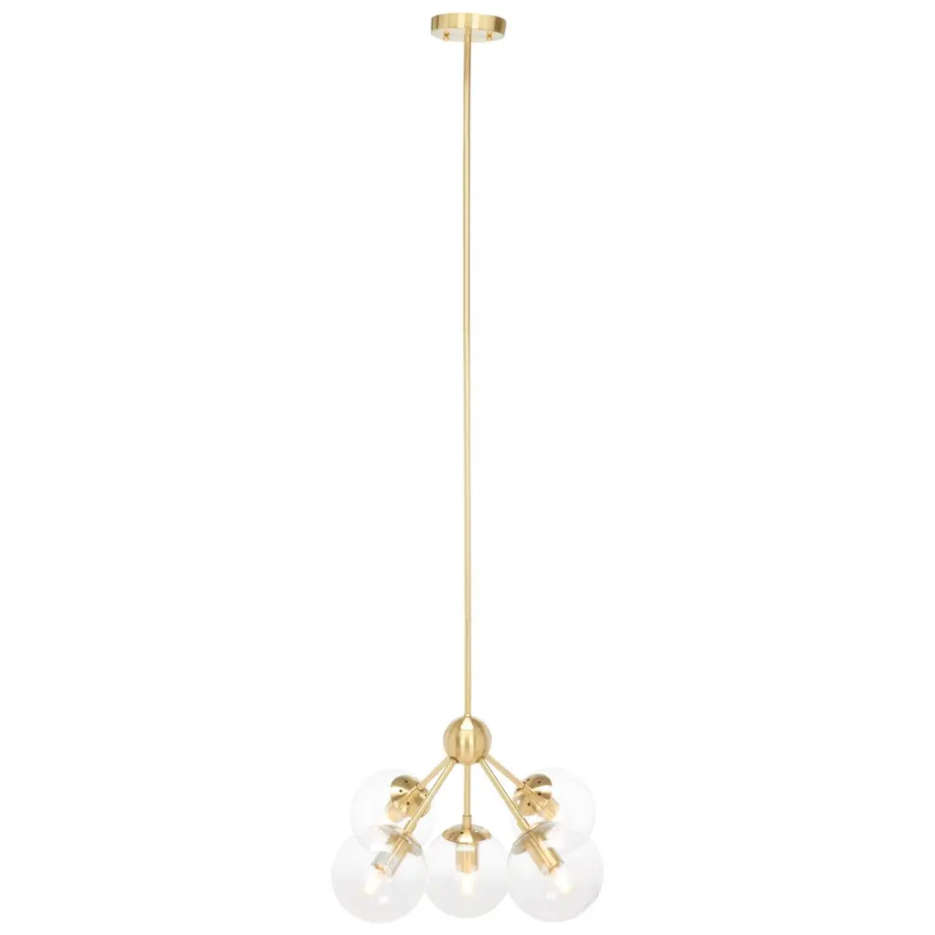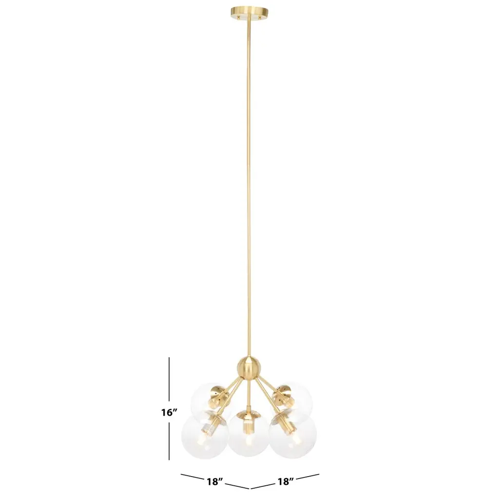A fresh new take on sputnik style lighting, this chandelier is a showstopper. Its frame perfectly shines against its clear glass globes, making a chic statement in any interior.