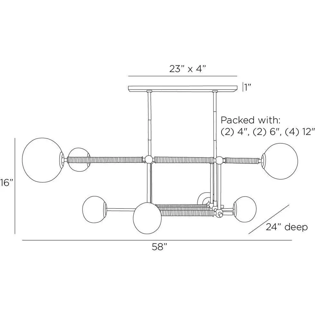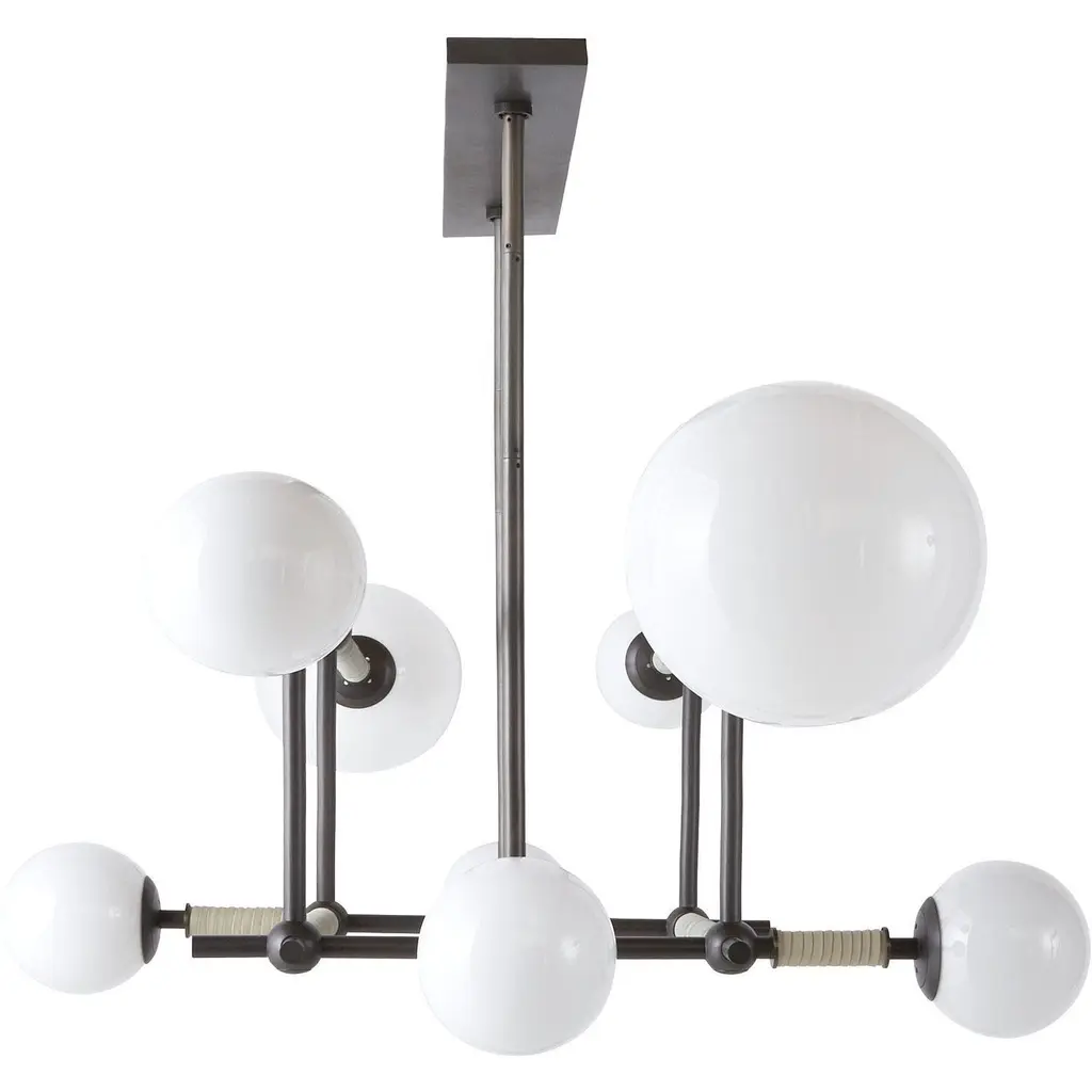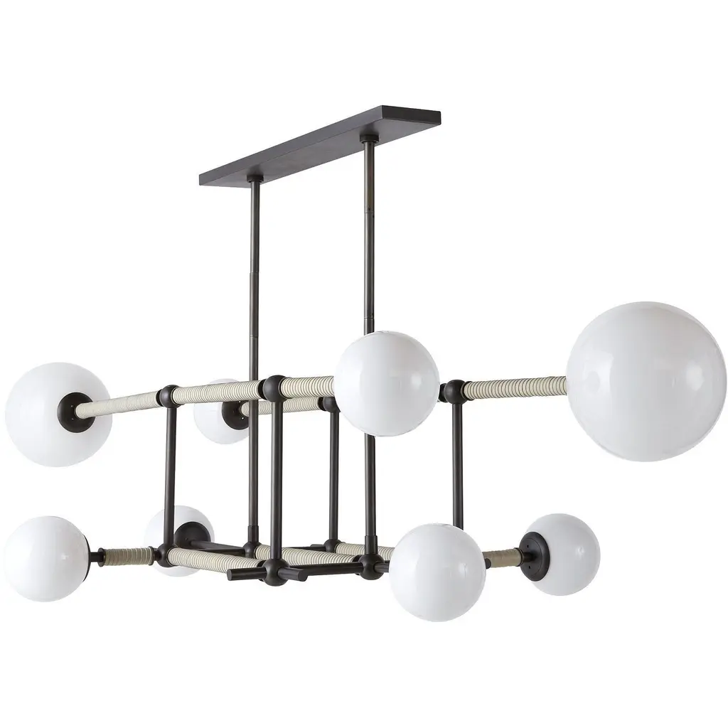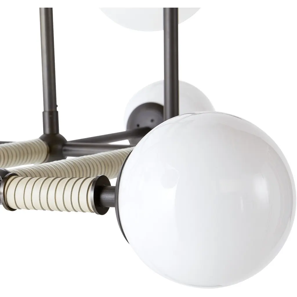 We took a linear frame of steel, plated it in English bronze, and wrapped it with taupe leather for extra texture and dimension. Eight opal glass globes are configured in a grid to shine wherever you require light most. Finish will vary.