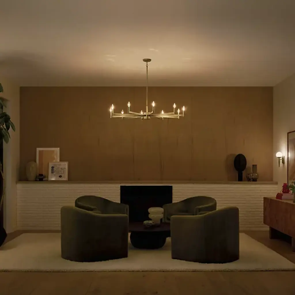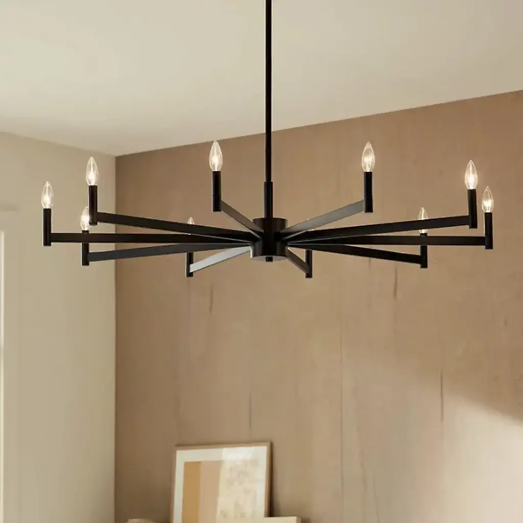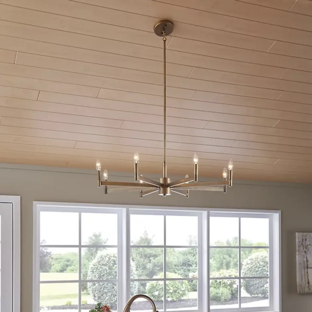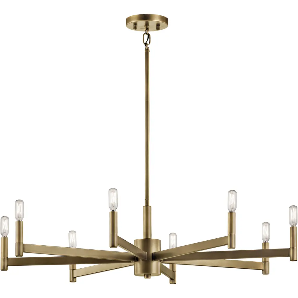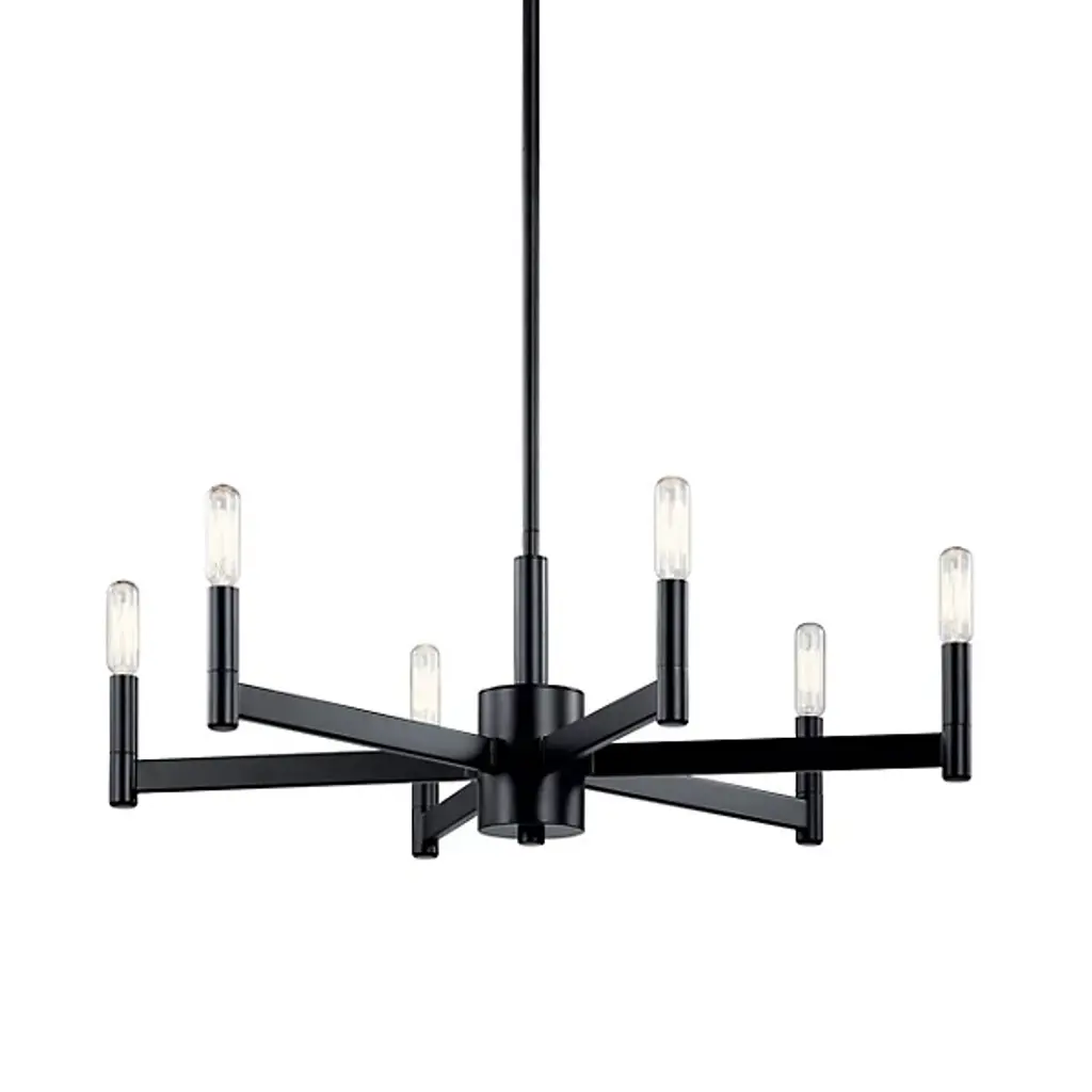 The Erzo Chandelier by Kichler gives a modern, industrial twist to the classic chandelier design. From its cylindrical core, several arms extend outward with strong lines and abrupt angles, culminating in exposed candelabra light sources. This rugged appearance contrasts well with the warm, widespread ambient light given off. Makes a statement over entryways and dining room tables.