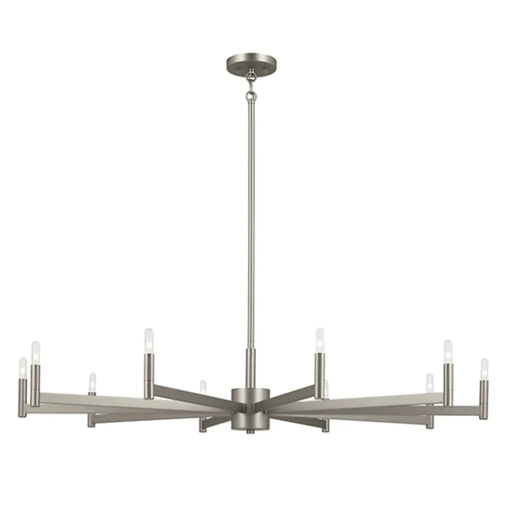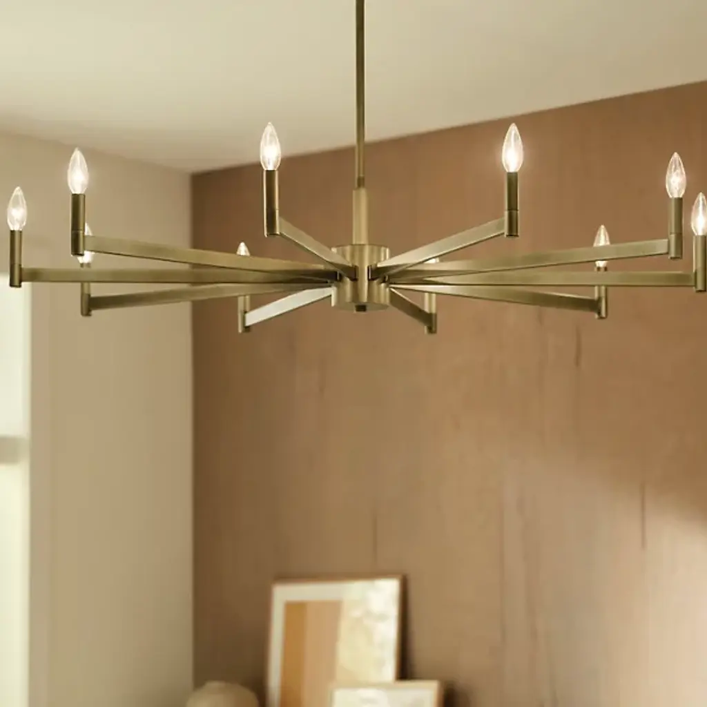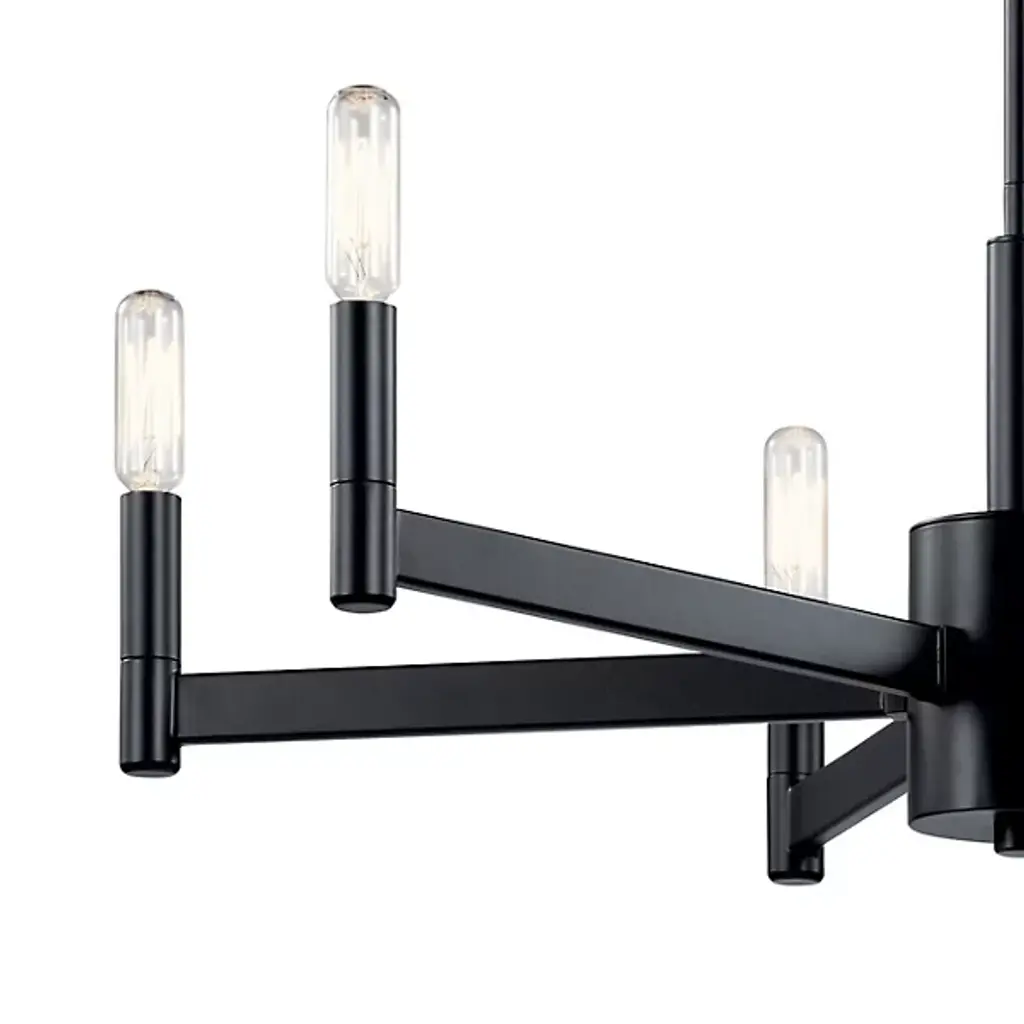The Erzo Chandelier by Kichler gives a modern, industrial twist to the classic chandelier design. From its cylindrical core, several arms extend outward with strong lines and abrupt angles, culminating in exposed candelabra light sources. This rugged appearance contrasts well with the warm, widespread ambient light given off. Makes a statement over entryways and dining room tables.