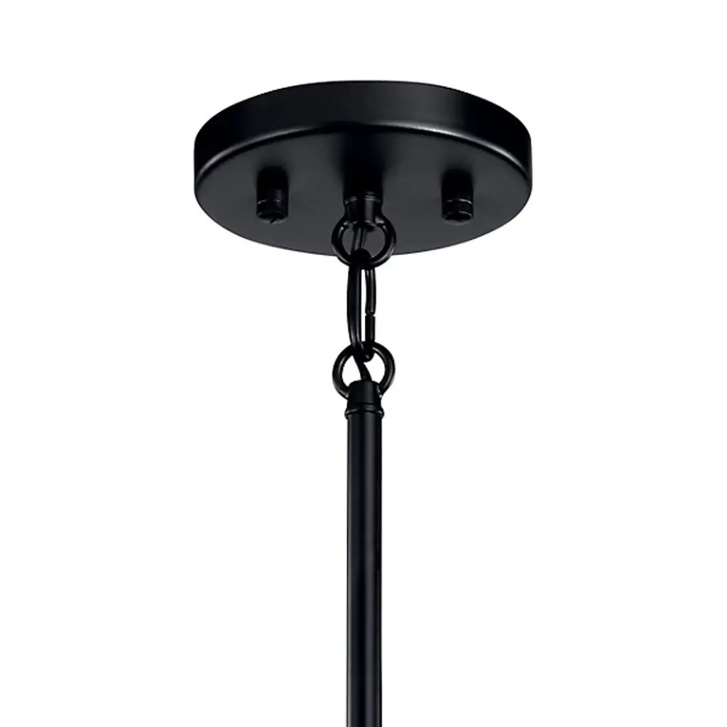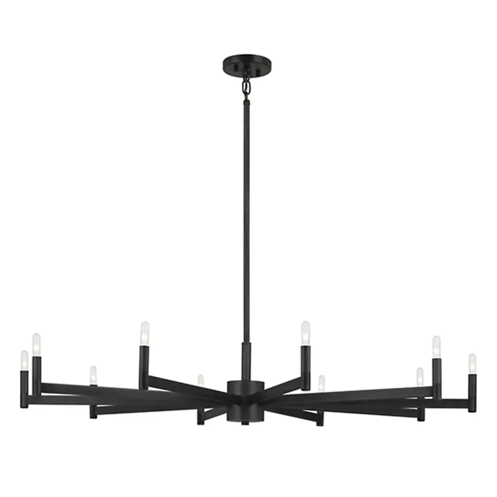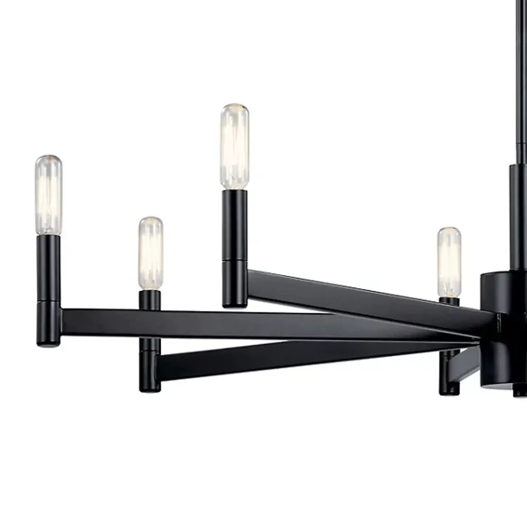 The Erzo Chandelier by Kichler gives a modern, industrial twist to the classic chandelier design. From its cylindrical core, several arms extend outward with strong lines and abrupt angles, culminating in exposed candelabra light sources. This rugged appearance contrasts well with the warm, widespread ambient light given off. Makes a statement over entryways and dining room tables.
