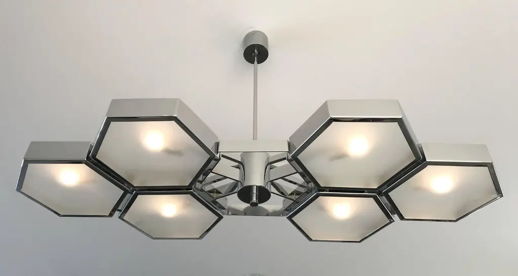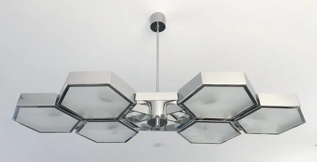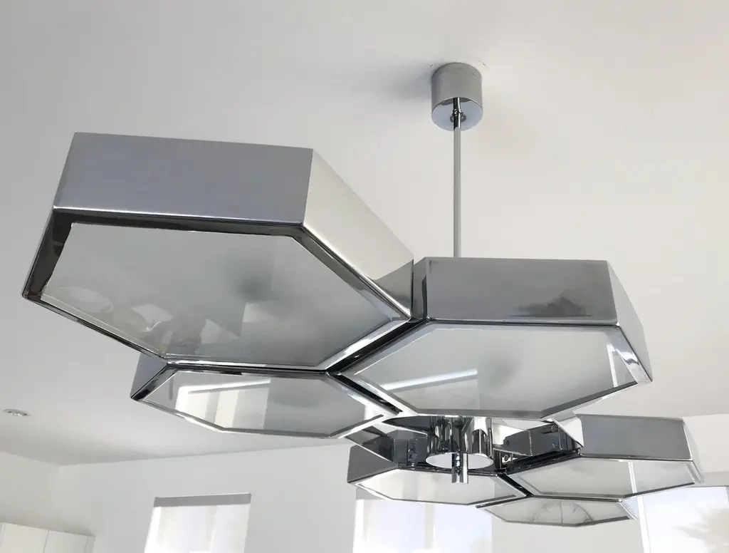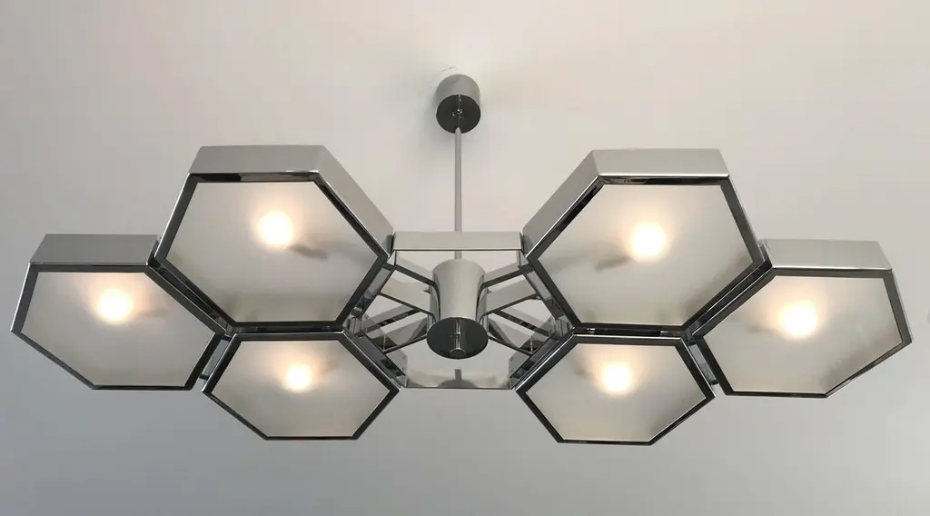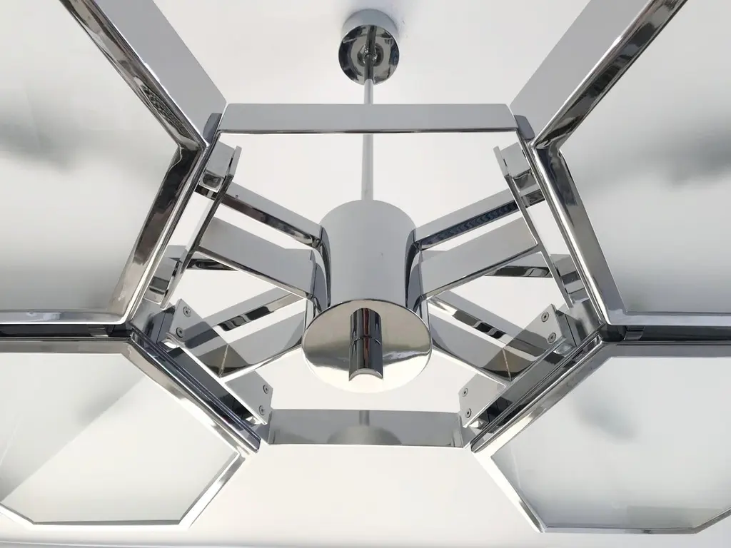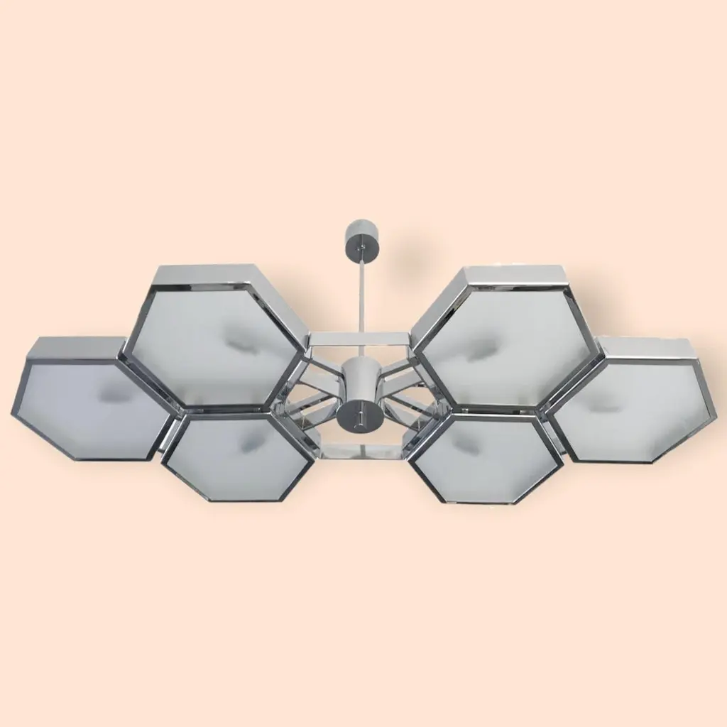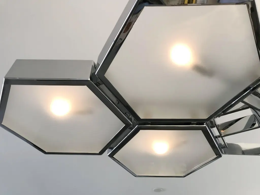 Impressive Italian chandelier with 6 hexagonal glossy glass diffusers in satin finish on the back, mounted on thick hexagonal cells in polished chrome finish, designed by Fabio Bergomi for Fabio Ltd, made in Italy6 lights / E12 or E14 type / max 40W eachMeasures: Length 67 inches, width 29.5 inches, height 37.5 inches including rod and canopyOrder only, this item ships from ItalyOrder reference #: FABIOLTD C648