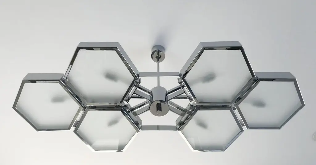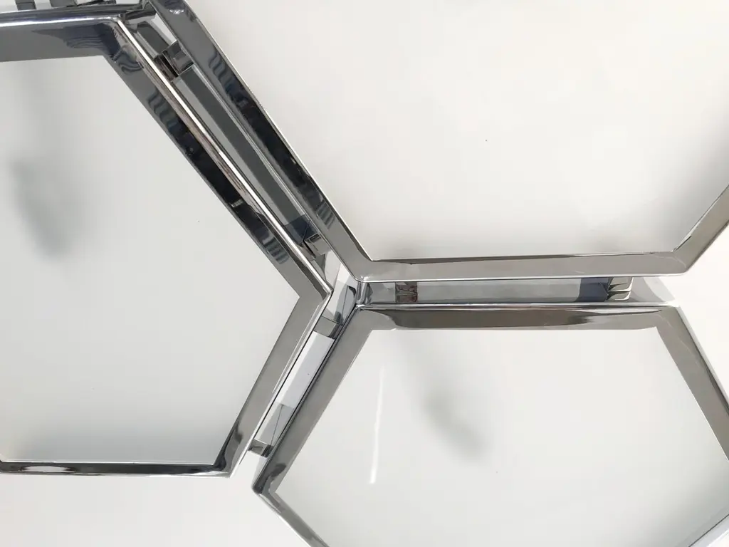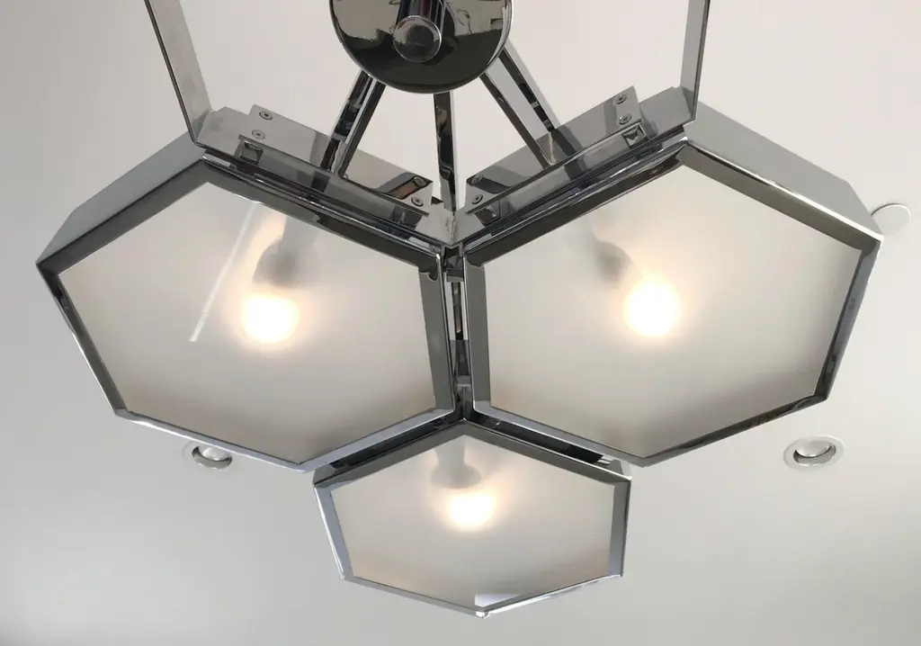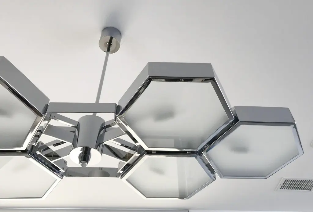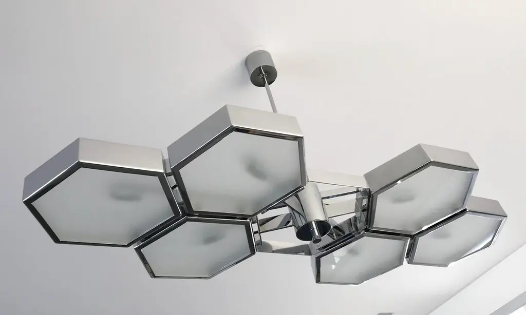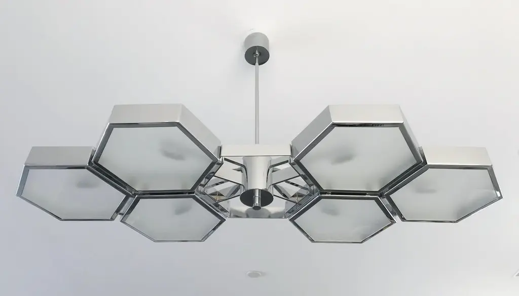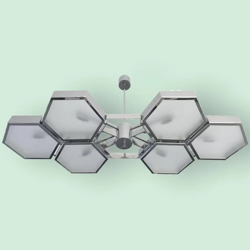 Impressive Italian chandelier with 6 hexagonal glossy glass diffusers in satin finish on the back, mounted on thick hexagonal cells in polished chrome finish, designed by Fabio Bergomi for Fabio Ltd, made in Italy6 lights / E12 or E14 type / max 40W eachMeasures: Length 67 inches, width 29.5 inches, height 37.5 inches including rod and canopyOrder only, this item ships from ItalyOrder reference #: FABIOLTD C648