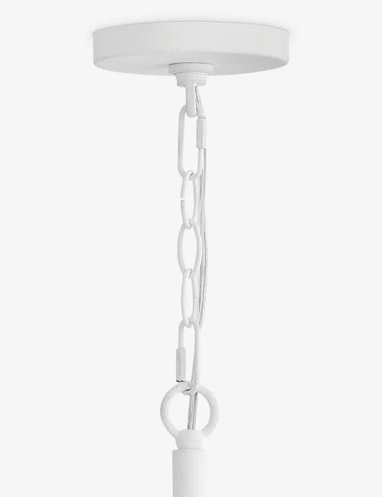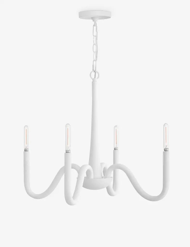 The Escher chandelier features swanlike arms with exposed candelabra lights for a chic, timeless look overhead. With its textured plaster finish, this versatile statement light brings an antique air to a modern chandelier design, perfect for bright, airy spaces.
