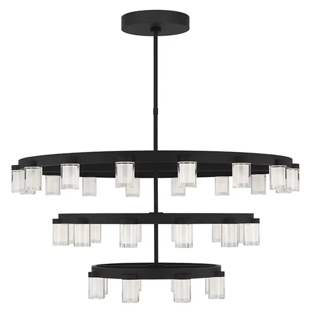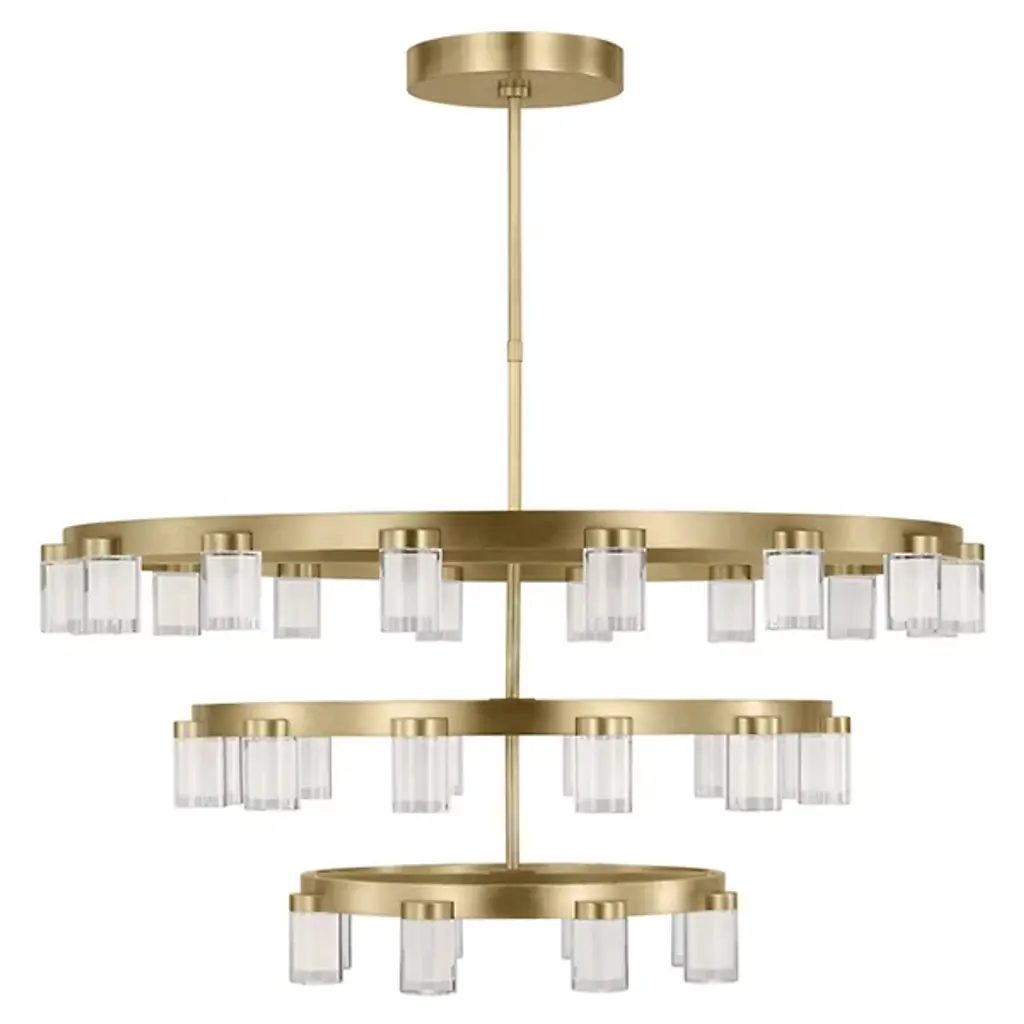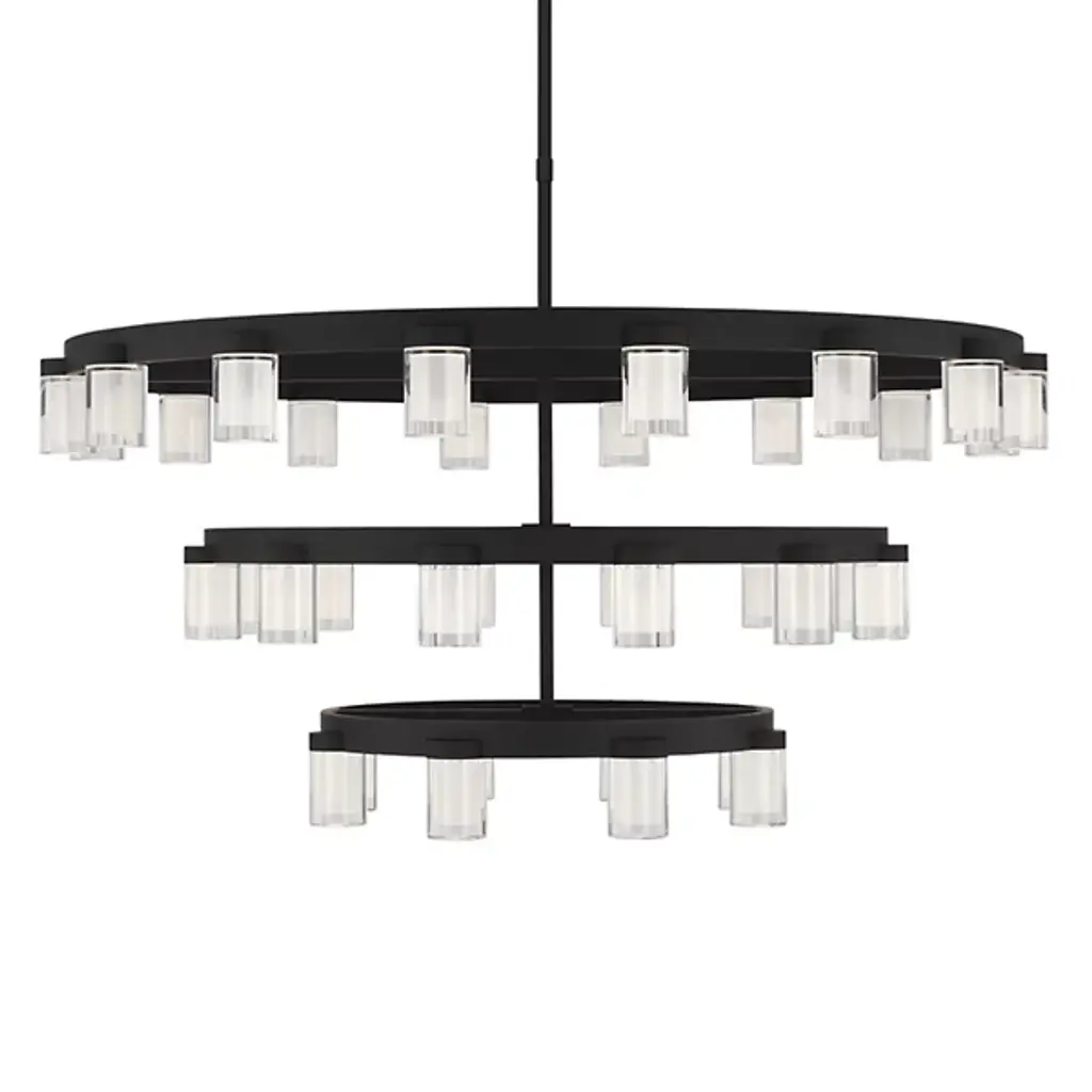 The Esfera 3-Tier LED Chandelier from Visual Comfort Modern lends a tastefully-layered appeal to interiors. A refined design from the Kelly Wearstler, it’s ideally suited to large inside spaces and starts with a disc-shaped metal canopy, threading a single slim downrod through three concentric rings that decrease in size as they drop. Illumination is provided by a series of LEDs integrated into glass cylinder shades along each ring’s lower edge, suggesting inverted candelabras that spread even warmth below the fixture.