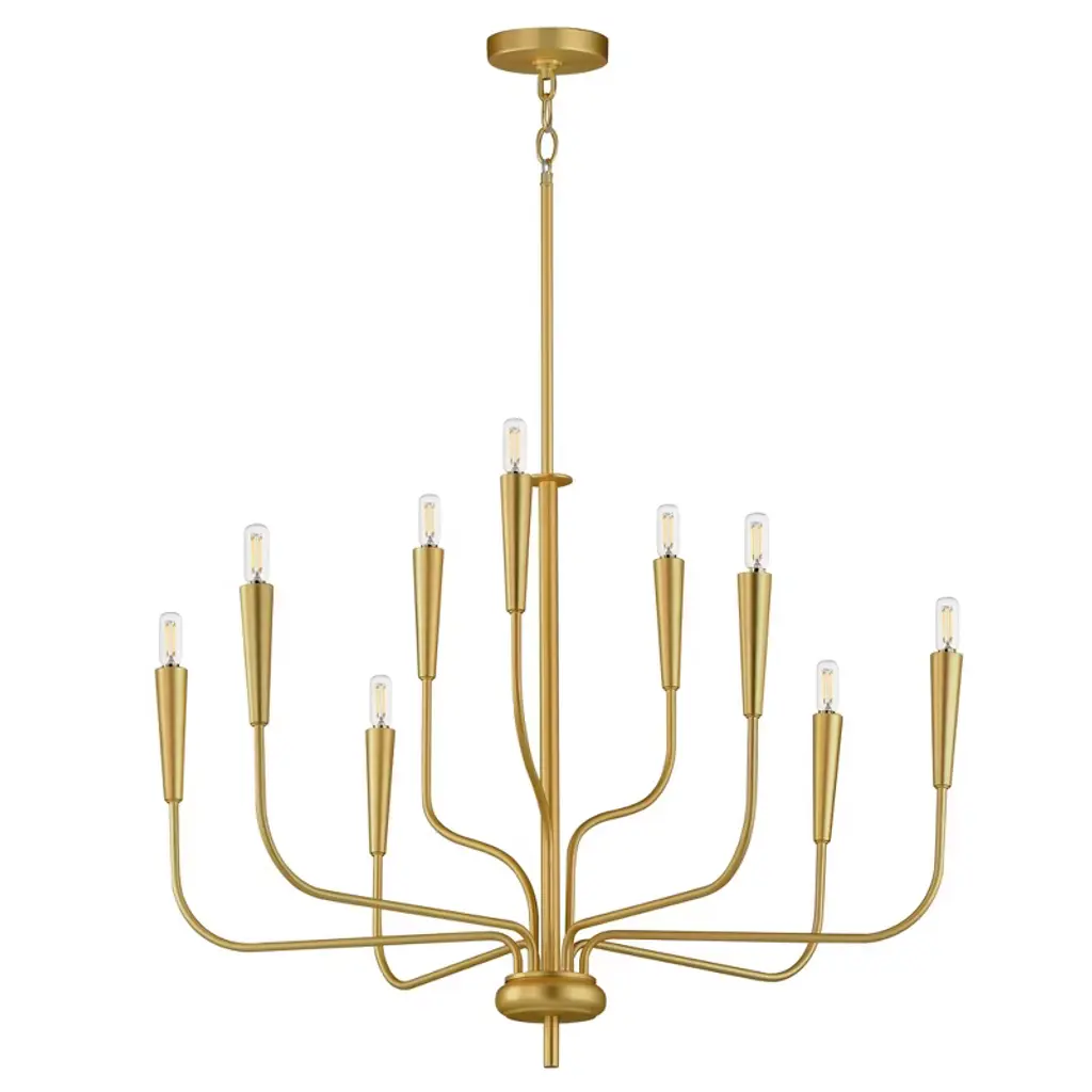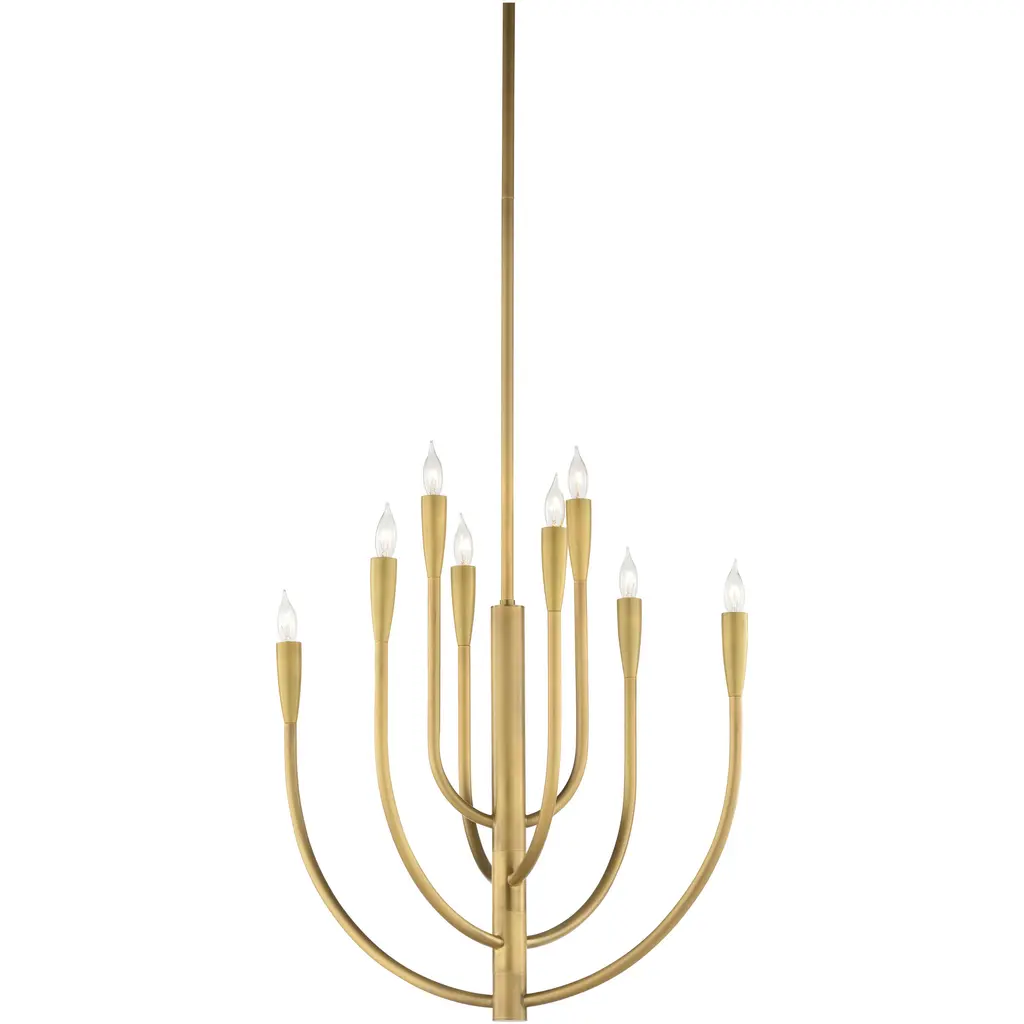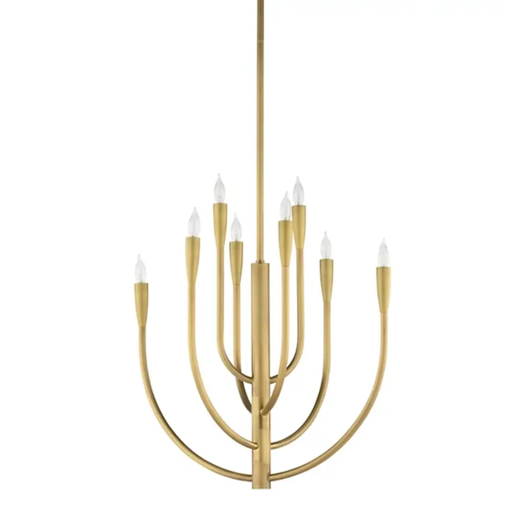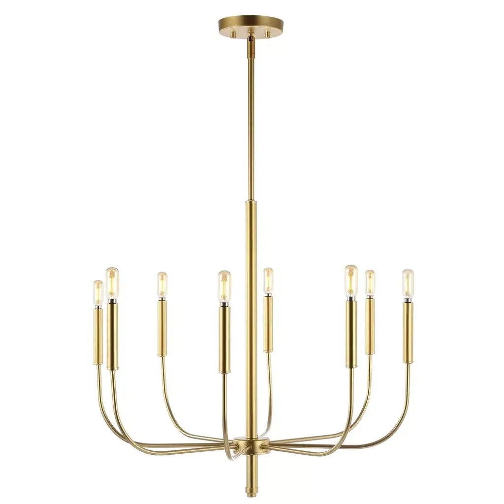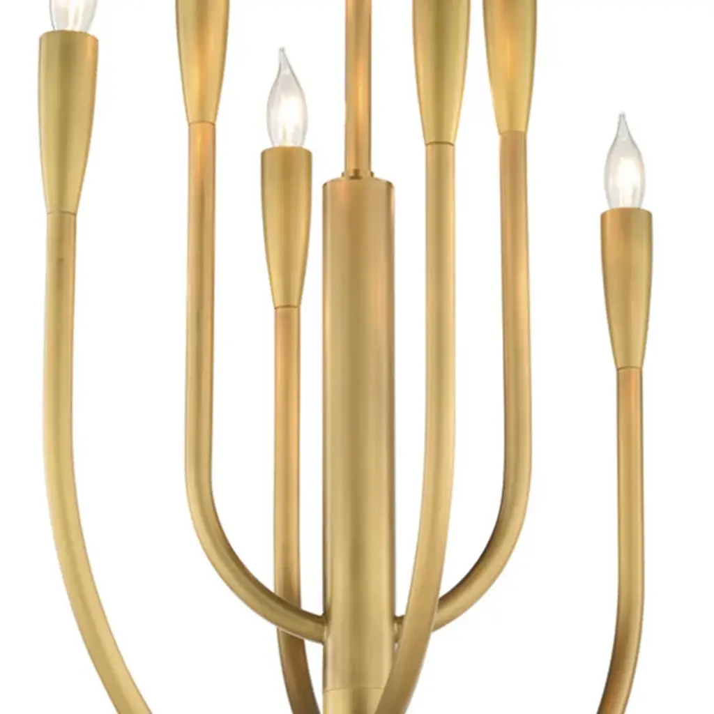 The Esme Chandelier from Chelsea House arranges eight curved arms in a circular pattern that evokes the movement of a spinning wheel. Each arm extends upward before tapering gracefully toward the candle-style light holders. The continuous flowing lines create a sense of motion even when the fixture is still. Simple in concept yet powerful in execution, this chandelier delivers impact without excess ornamentation. The precise geometry of the arms creates fascinating shadow play when illuminated. This chandelier brings refinement to dining spaces, living areas, and entrances, where its graceful lines can be fully appreciated.