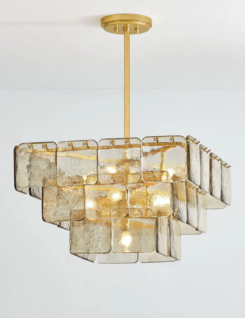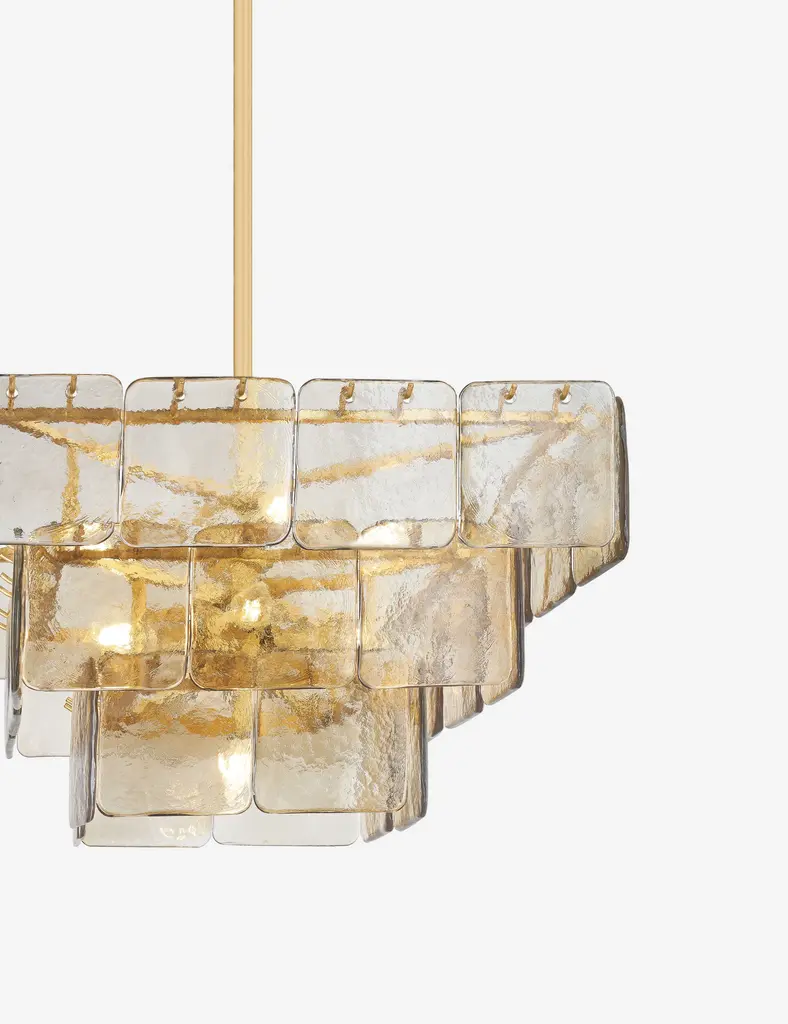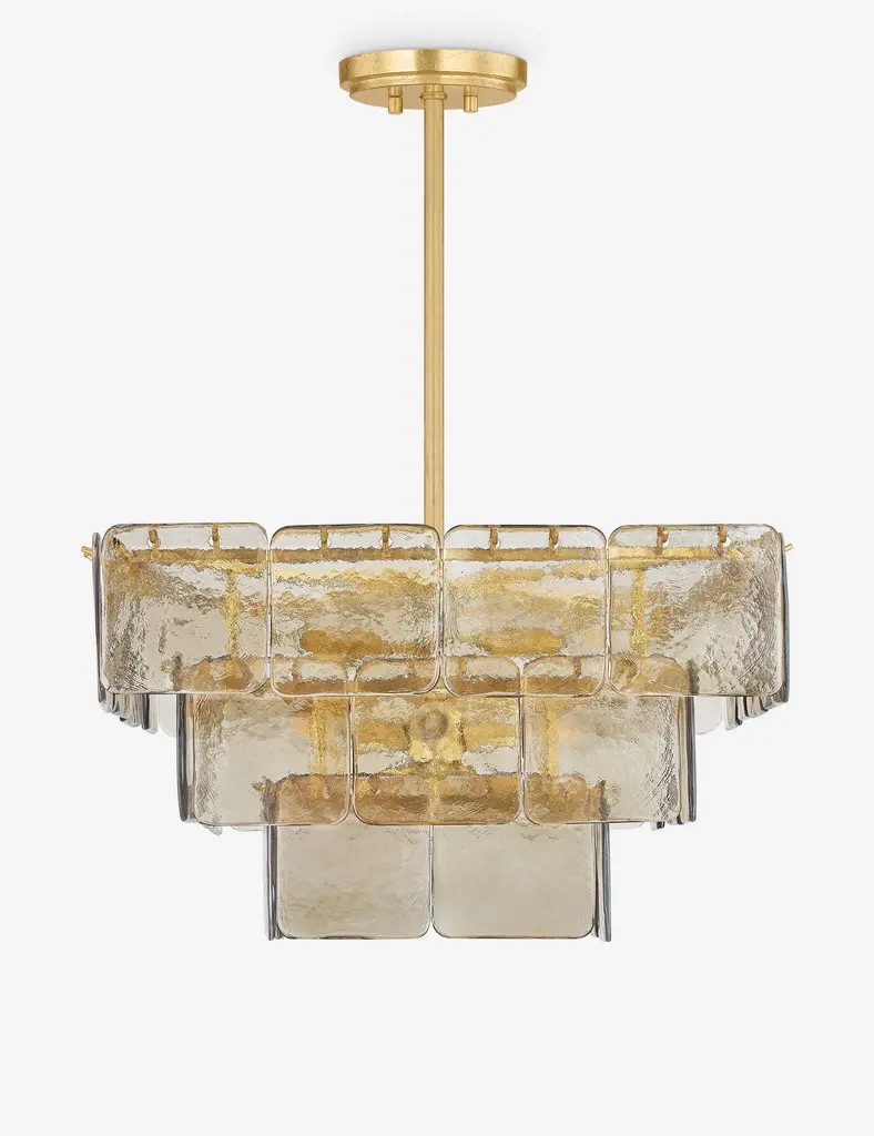 Splendor calls for statement lighting. The Esmeralda chandelier styles elegance overhead with three tiers of champagne piastre glass panels that catch the light with a brilliant shimmer. A vintage gold leaf finish completes the look, fashioning a modern chandelier for timeless grandeur.