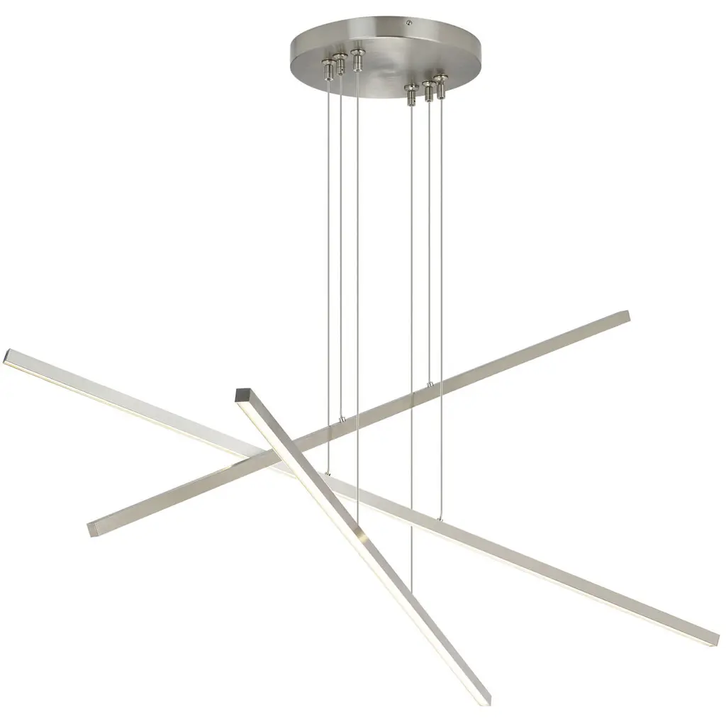 The ultimate in modern minimalism, the Essence Trio by VC Modern has three streamlined, linear lengths which are staggered randomly to create this dramatic and oversized modern interpretation of a chandelier. Ideal for lighting a dining room table, kitchen island or a conference room table, Essence is available in modern finishes. Its dimensions are 17.8" high and 50" long. Each of the three linear lights are only .75" thick and 7.5" wide. Damp-rated and dimmable.