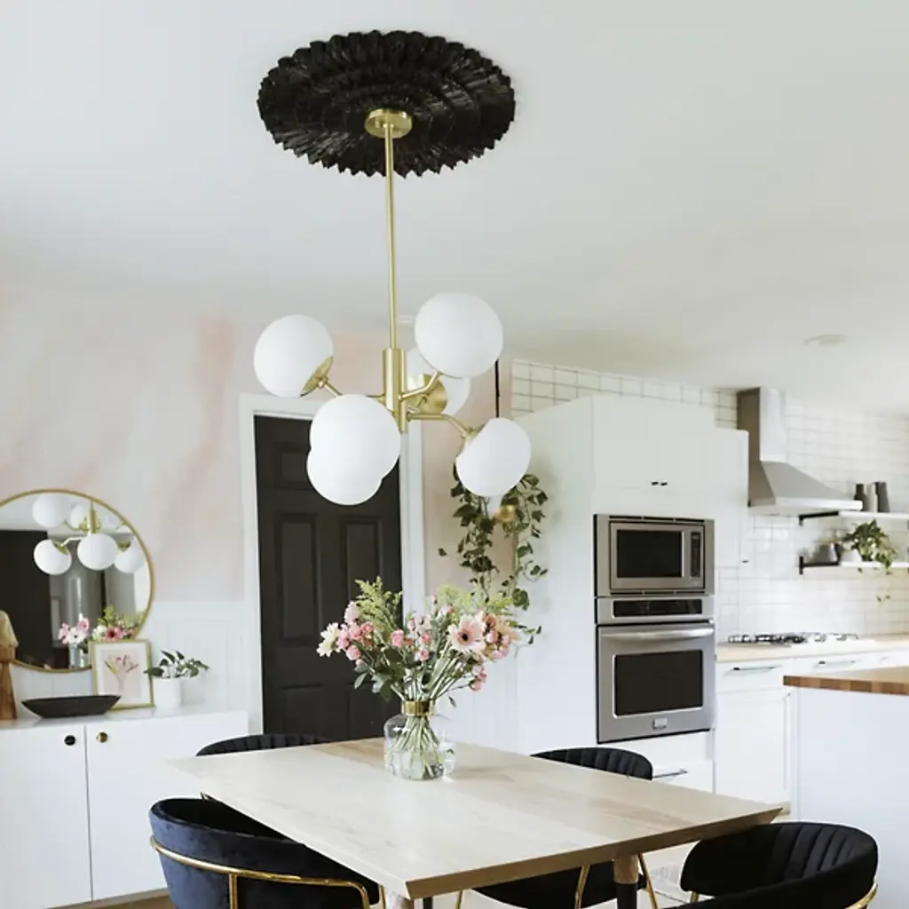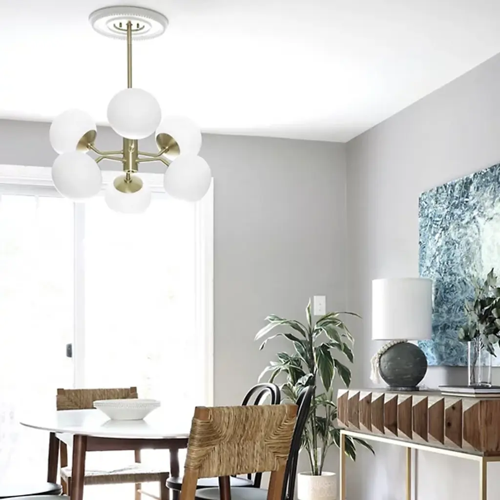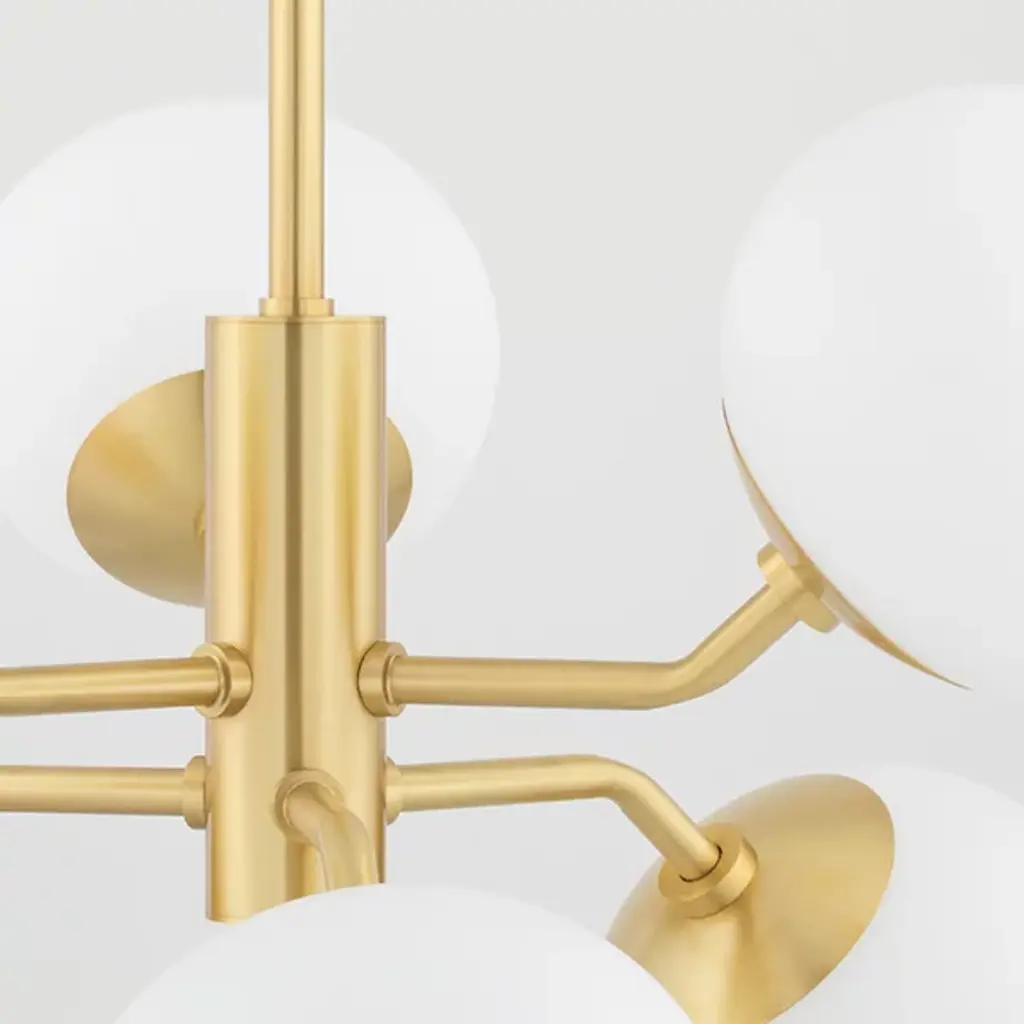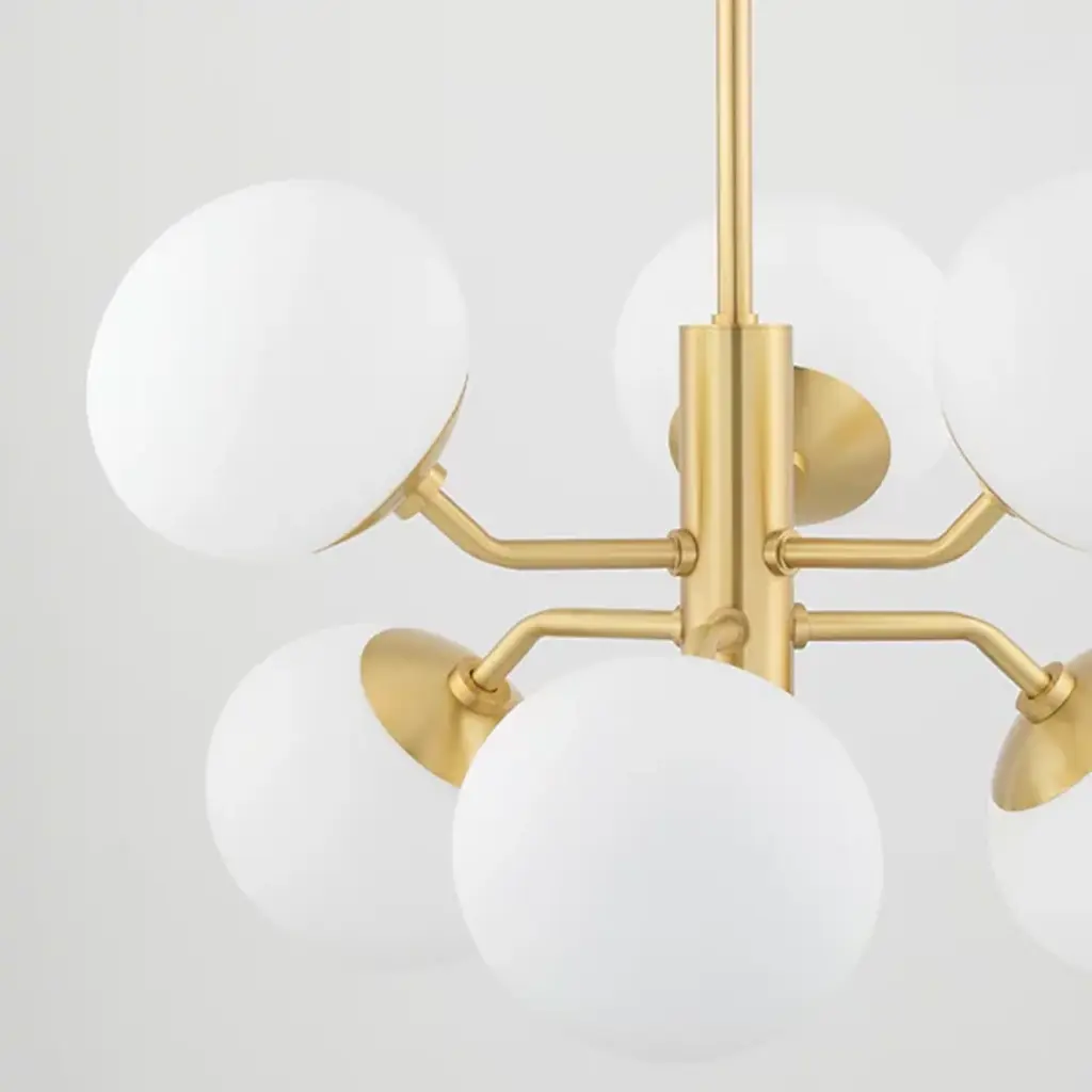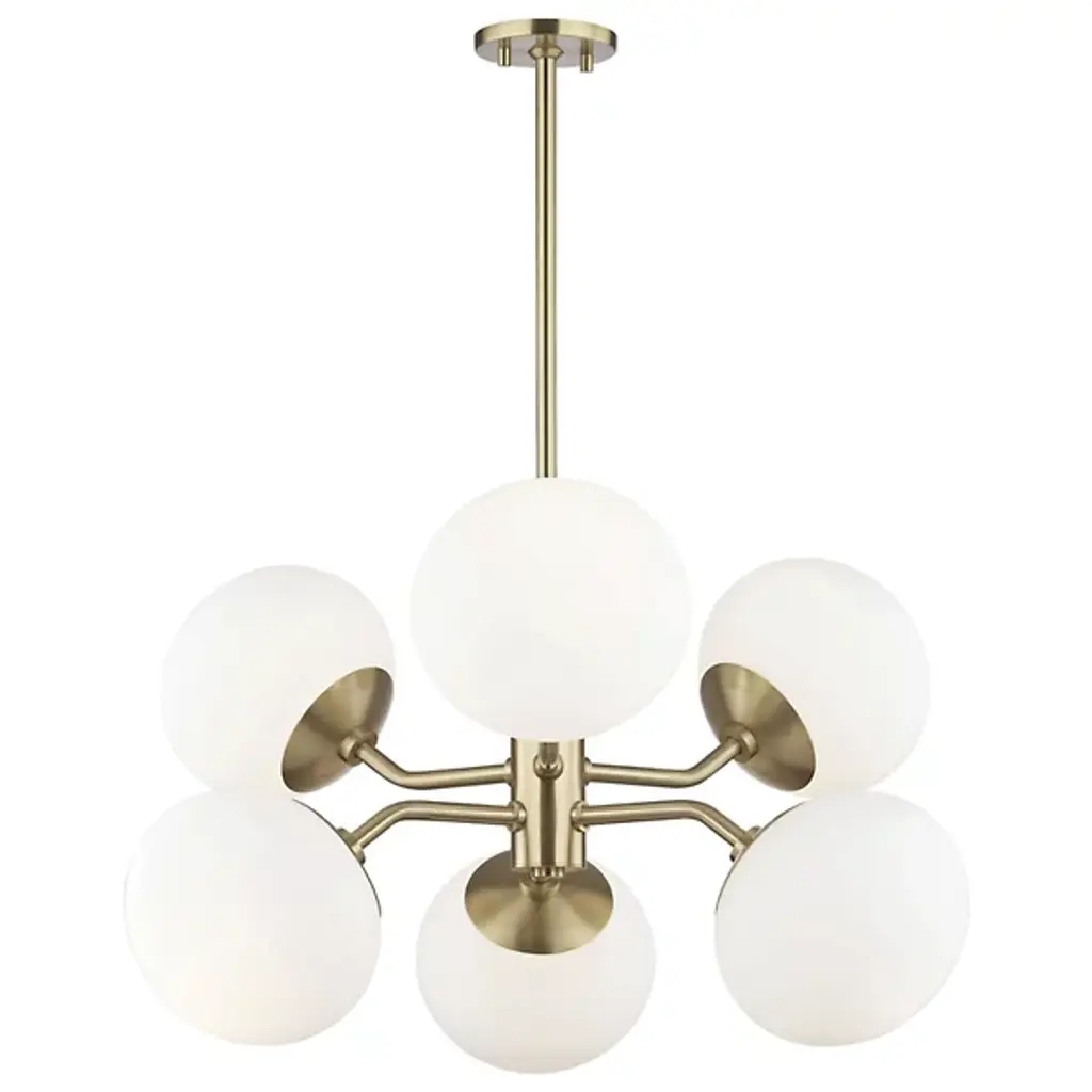 Up, down, all around, the Estee Chandelier by Mitzi sets your decorative lighting in the right direction. Showcasing a solid cylindrical column with Metal arms, the chandelier features 6 large Opal Etched Glass shades reaching out in all directions. This design is a showstopper in the kitchen, living room or dining room.