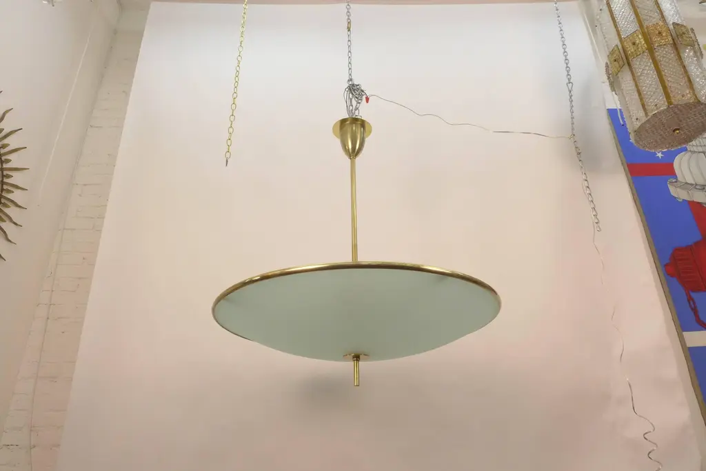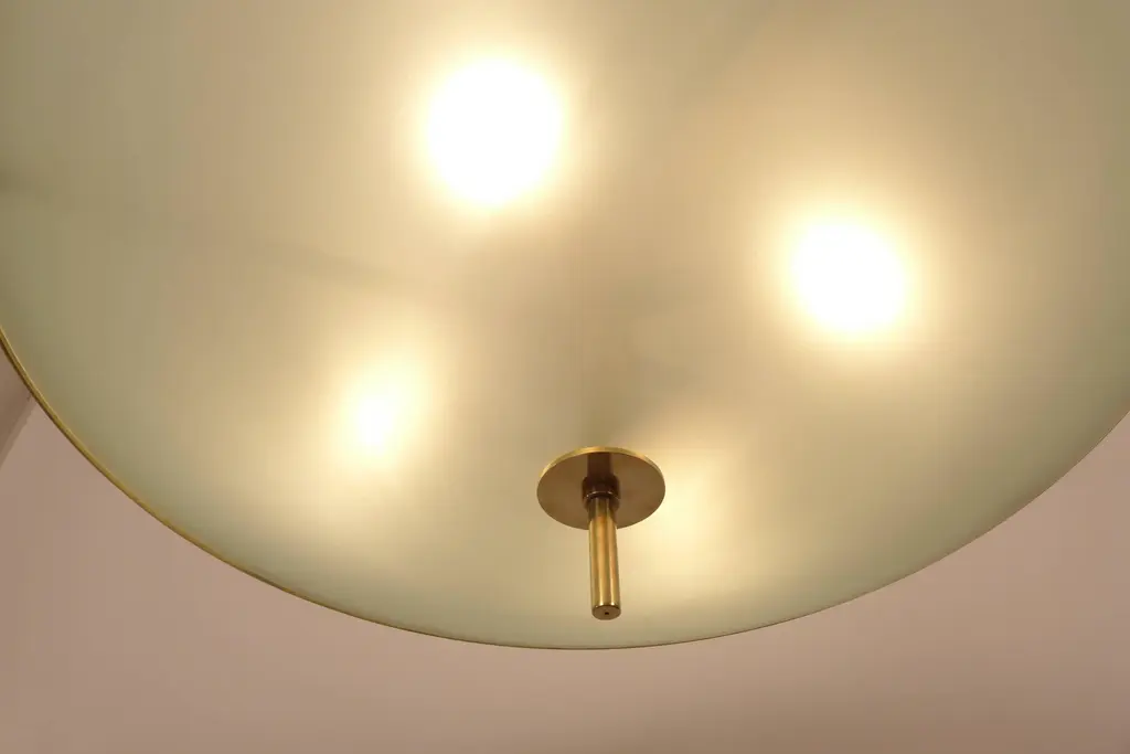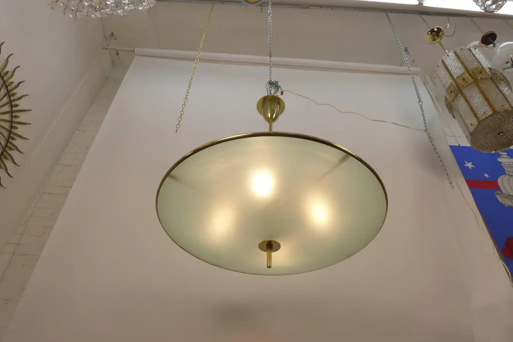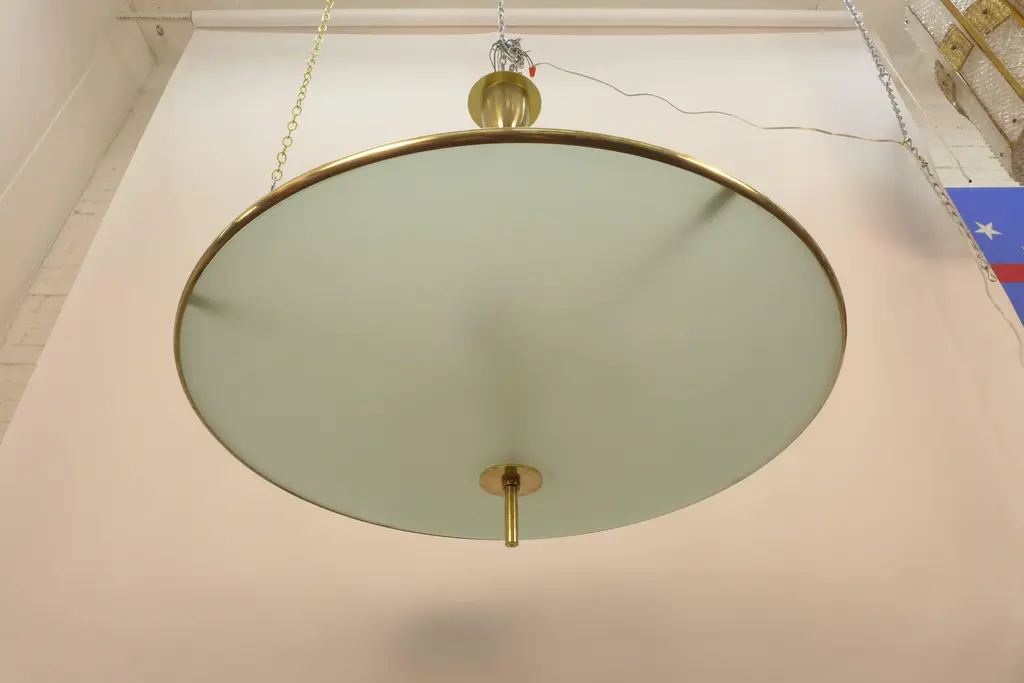 A very large pair of flying saucer chandeliers. They are made of solid brass and etched convex glass, each composed of two frosted glass domes. Made to order. Four regular sockets Max. 100 watts per socket. It will take 5-6 weeks to make this piece