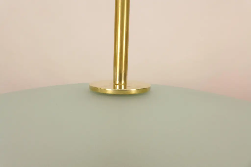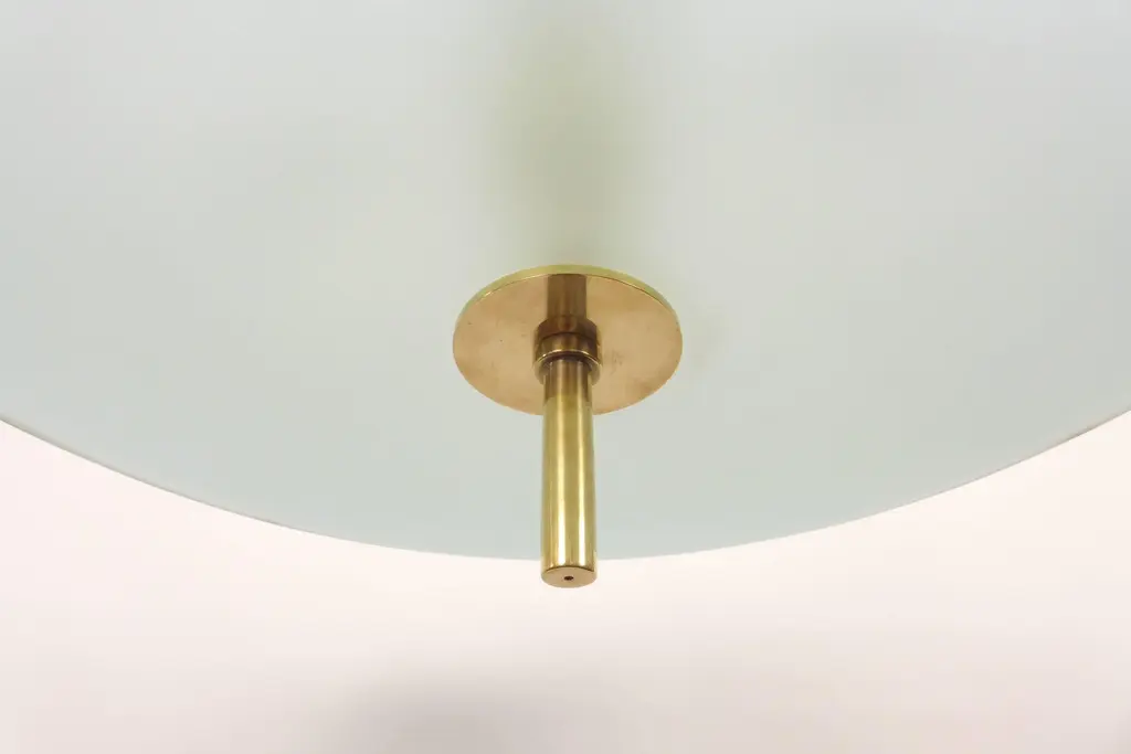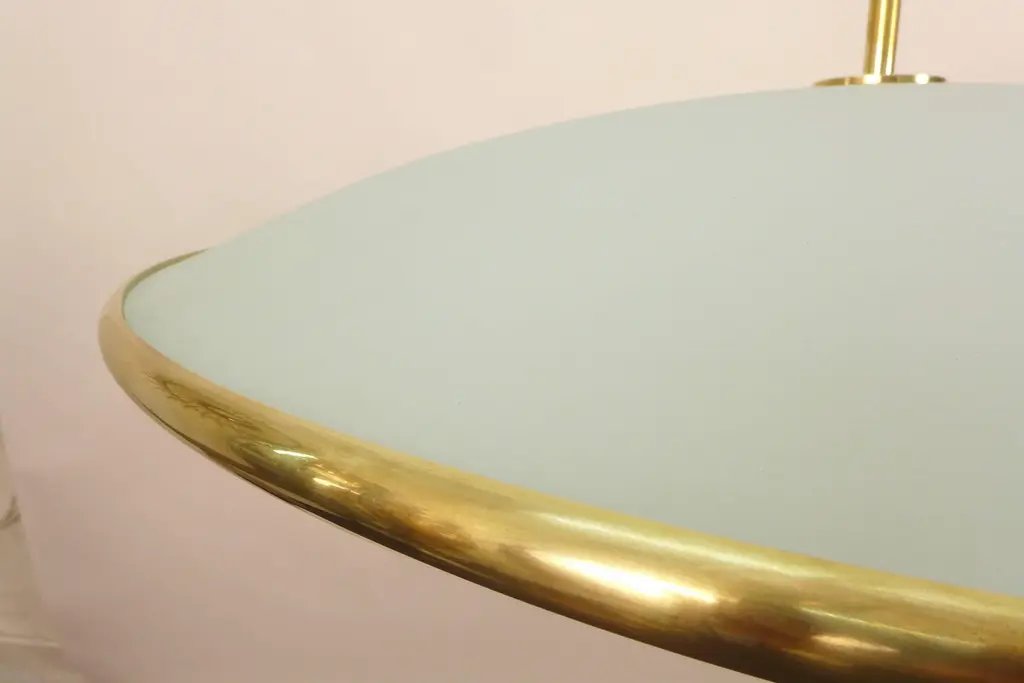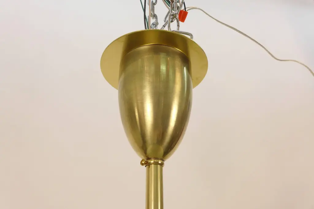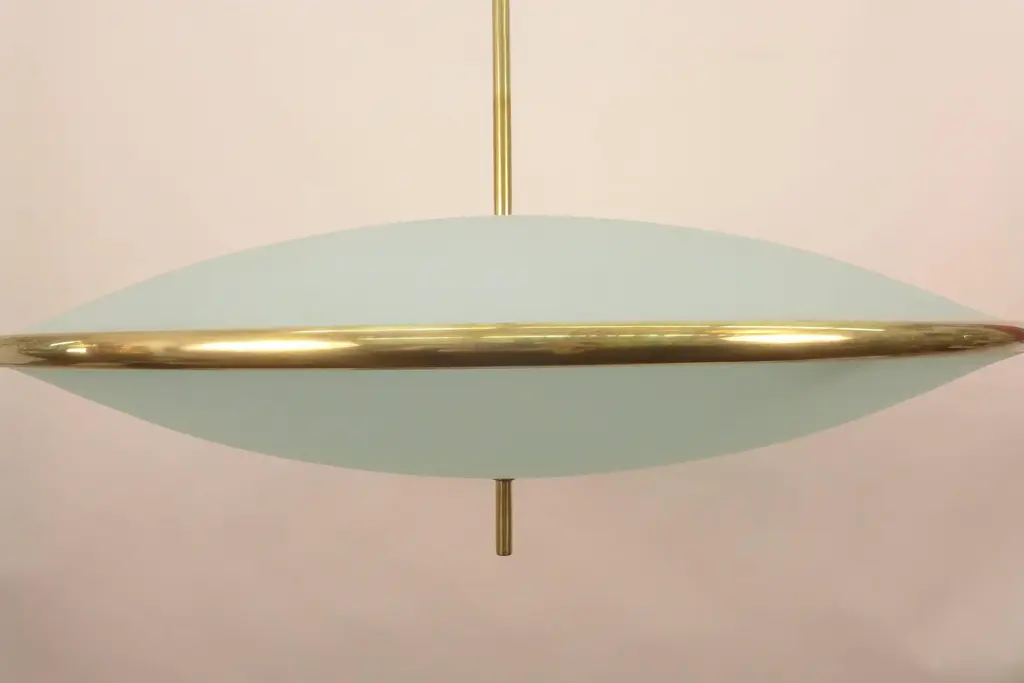 A very large pair of flying saucer chandeliers. They are made of solid brass and etched convex glass, each composed of two frosted glass domes. Made to order. Four regular sockets Max. 100 watts per socket. It will take 5-6 weeks to make this piece