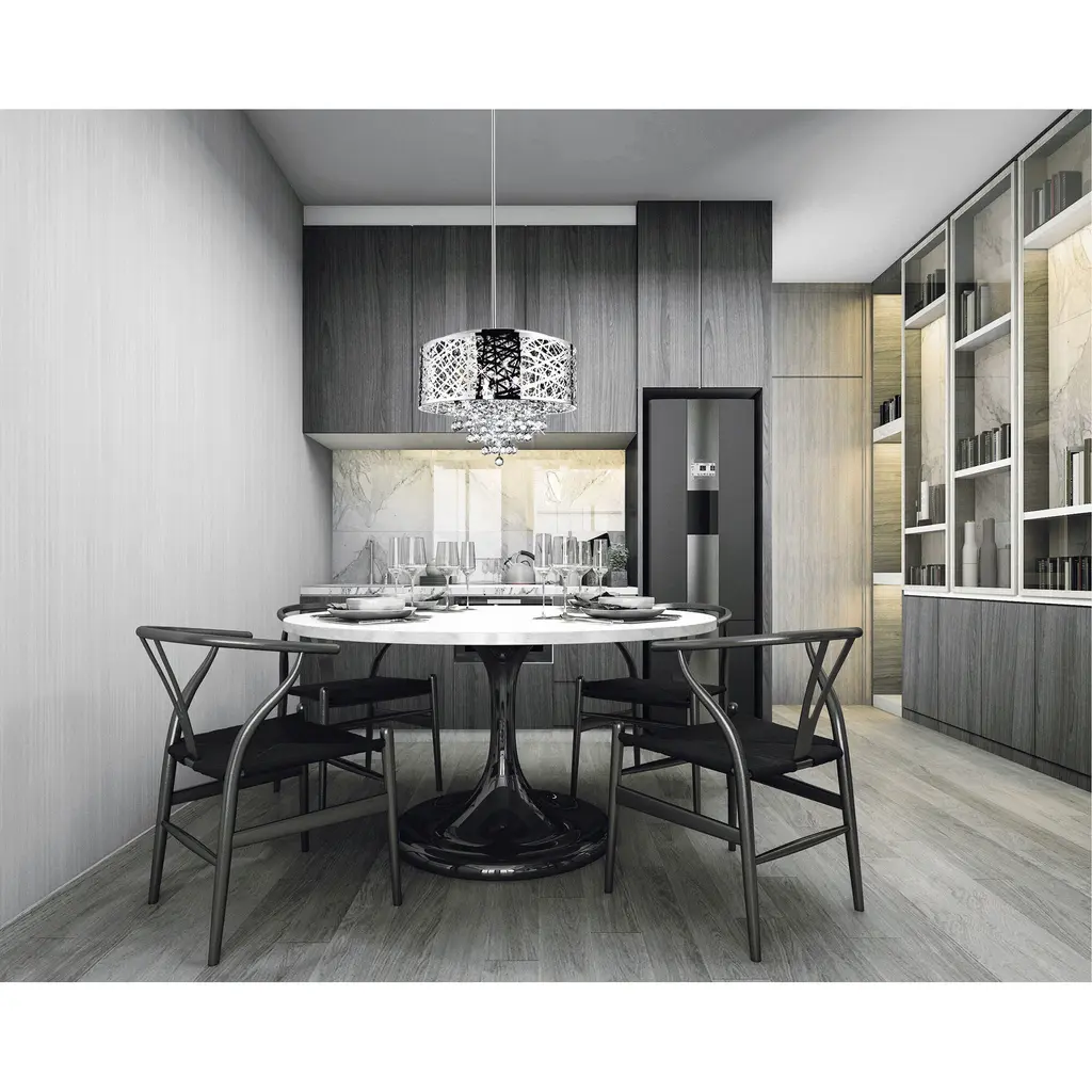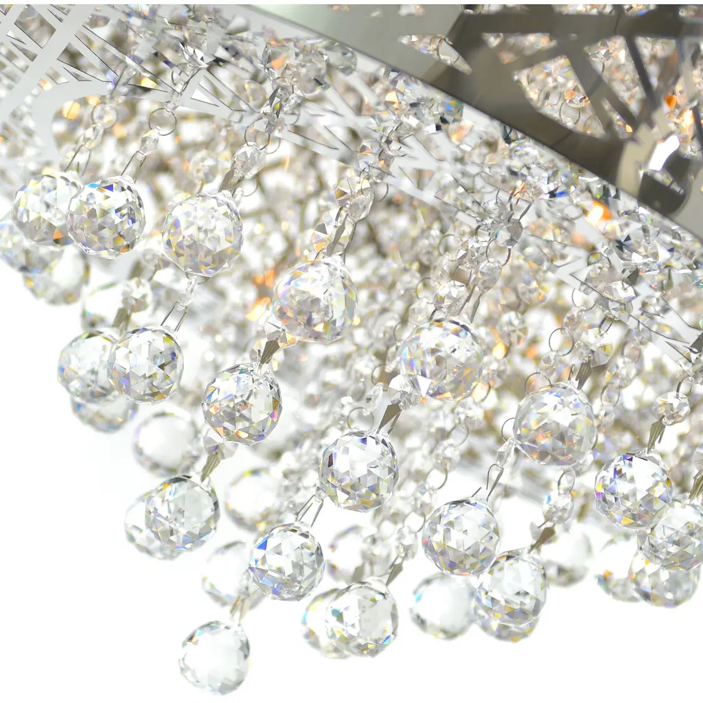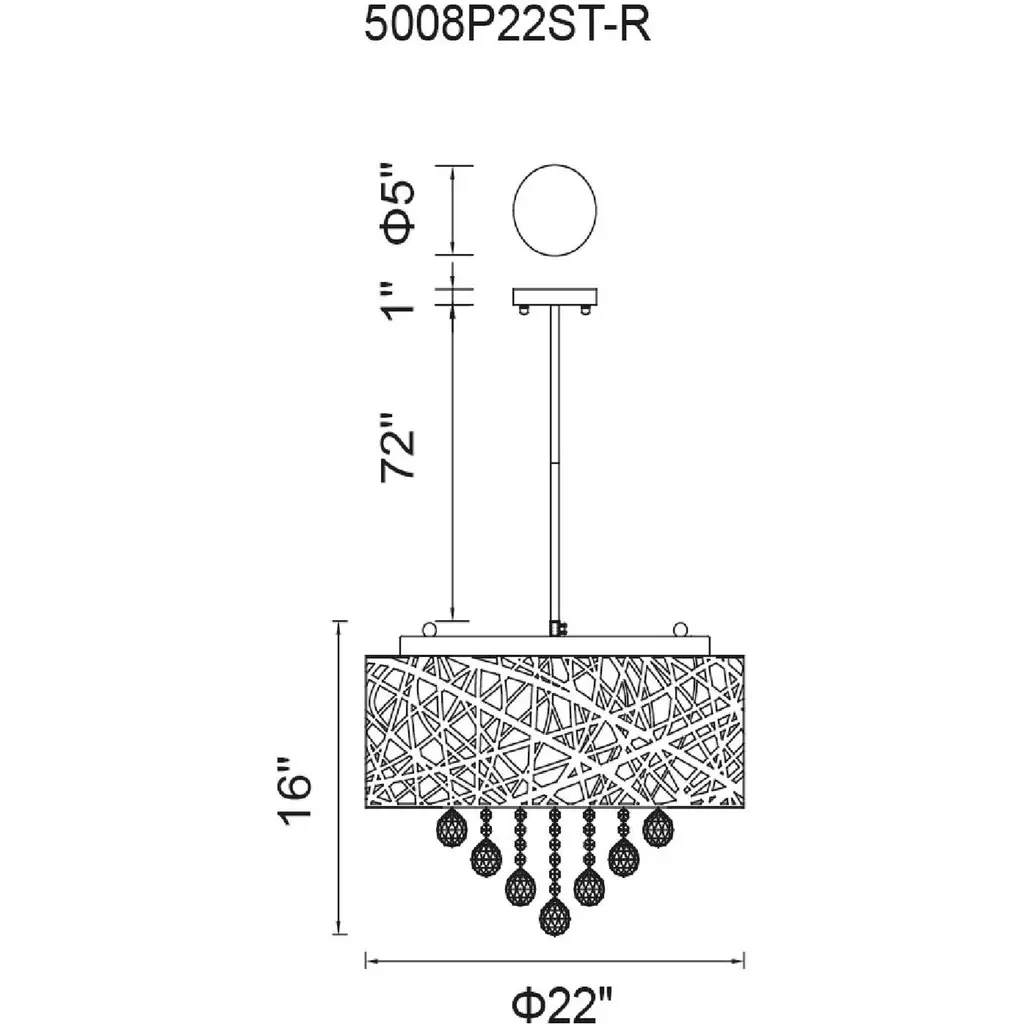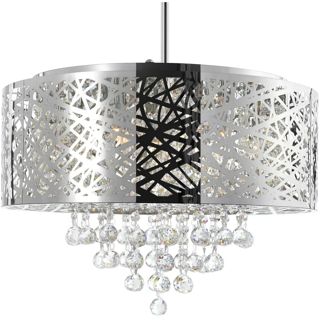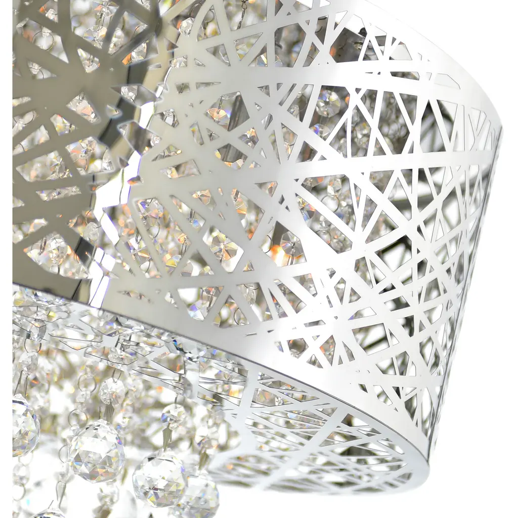 Bring a glamorous finish to your interiors with the Eternity 22'' 9 Light Drum Shade Chandelier by CWI Lighting. This stunning fixture features a laser-cut chrome-finished drum shade complemented by cascading strands of clear crystal beads that beautifully refract light. Designed to captivate and illuminate, this 9-light chandelier is perfect for elevating the ambiance in bedrooms, dining rooms, or living spaces. Add this dazzling centerpiece to instantly give your home a more luxurious feel. Finish: Chrome Light Count: 9 Light Source: G9 LED Compatible (Bulbs Not Included) Adjustable Hanging Height: Yes Material: Metal, Crystal Style: Modern / Glam