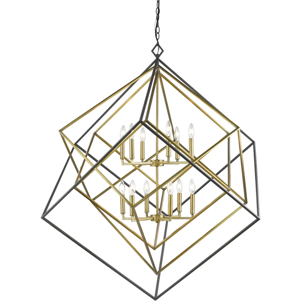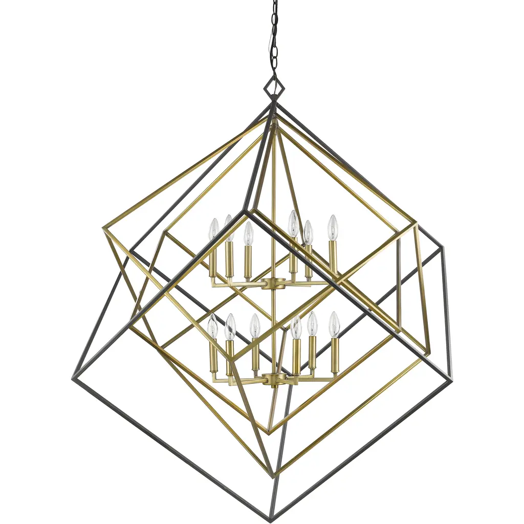 A warm palette of finishes softens the stark contemporary feel of this 12-light chandelier. Gorgeous olde brass and bronze cast a luscious look over a steel frame that collects geometric shapes and offers a partial view of two candelabra-style bulb mounts.