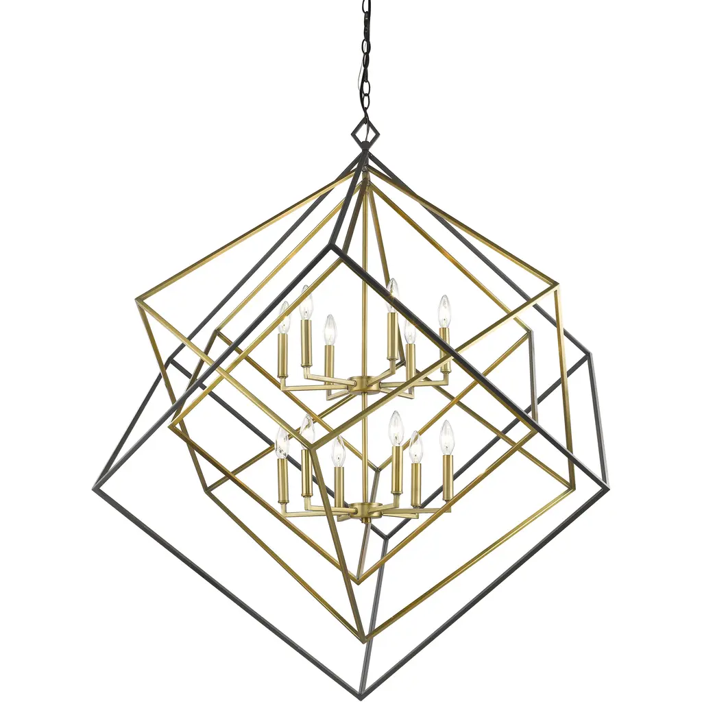 A warm palette of finishes softens the stark contemporary feel of this 12-light chandelier. Gorgeous olde brass and bronze cast a luscious look over a steel frame that collects geometric shapes and offers a partial view of two candelabra-style bulb mounts.
