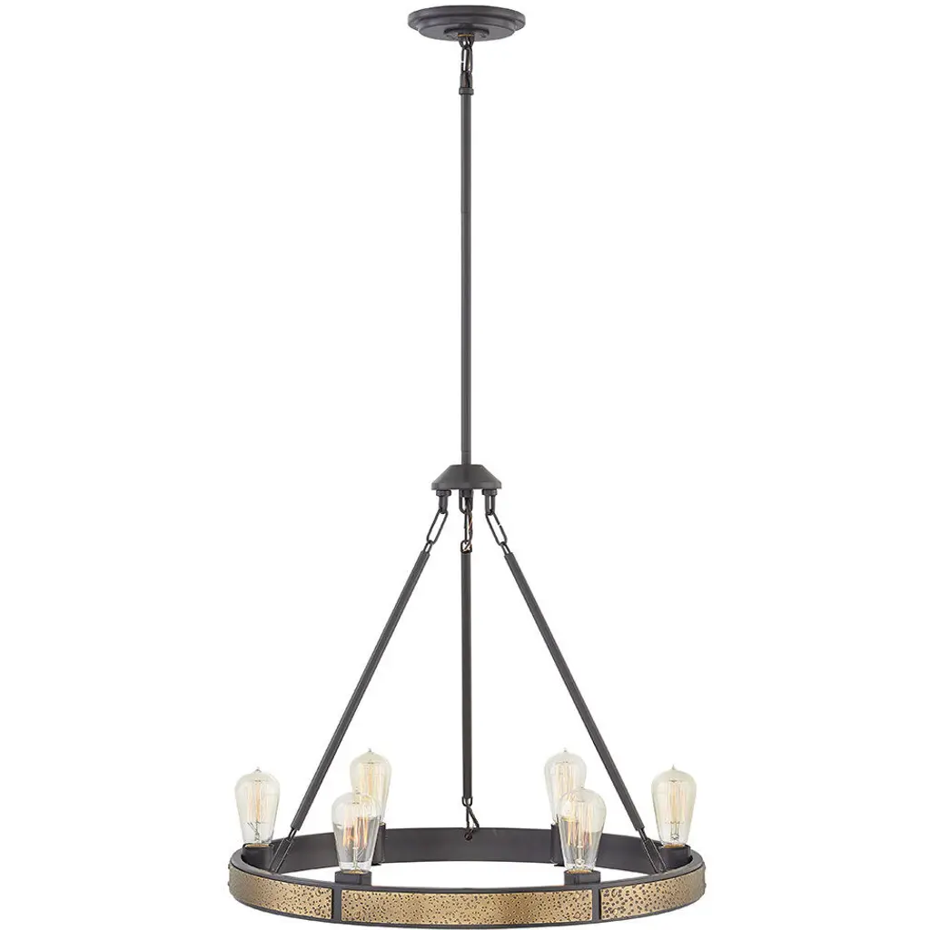 The striking hammered plates are a distinctive focal point in Everett’s design. Amplifying its unique look is the rich two-tone finish, imparting a refined elegance to this modern yet rustic chandelier. The use of vintage filament bulbs is recommended.