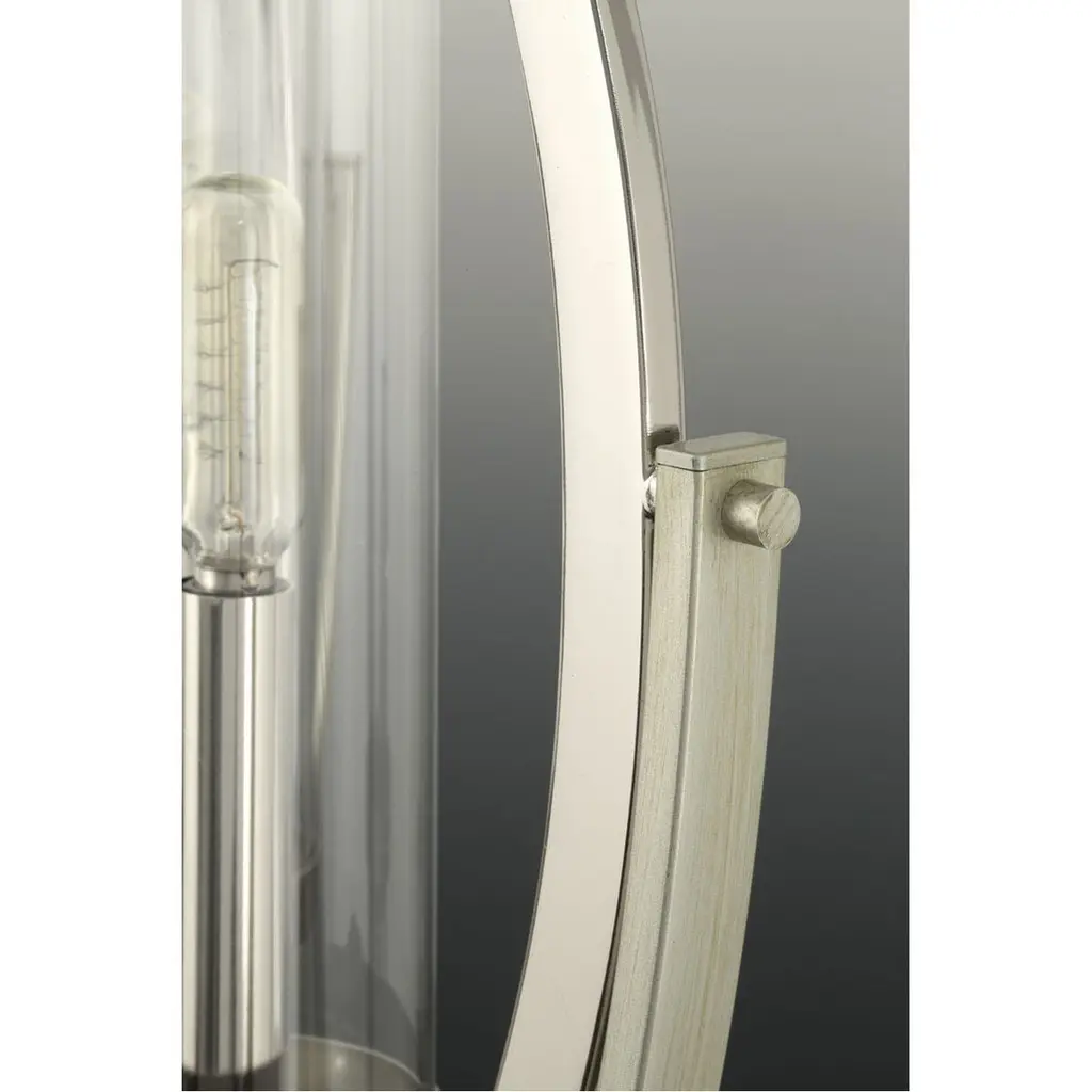 Evoke features an elliptical frame that gracefully supports a candelabra with clear glass shade. Mixed finished highlight the unique shape and provide a hint of livable luxury to your home. This six-light chandelier with Polished Chrome finish and Silver Ridge accents is part of our Design Series collections.
