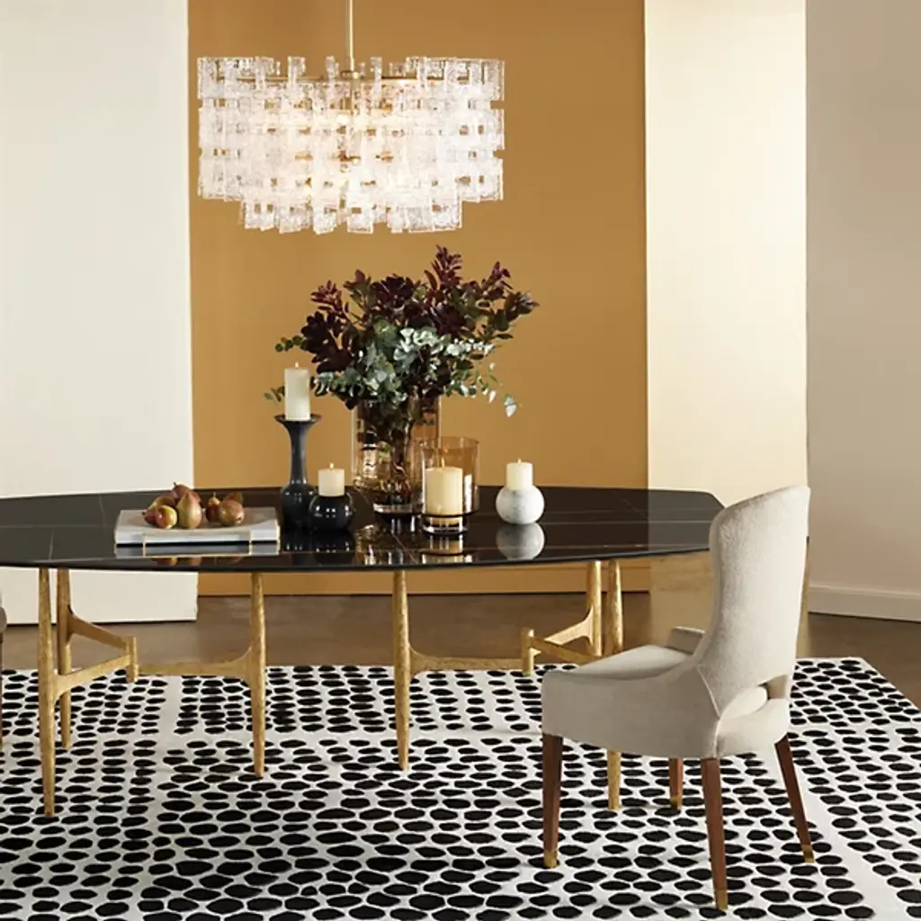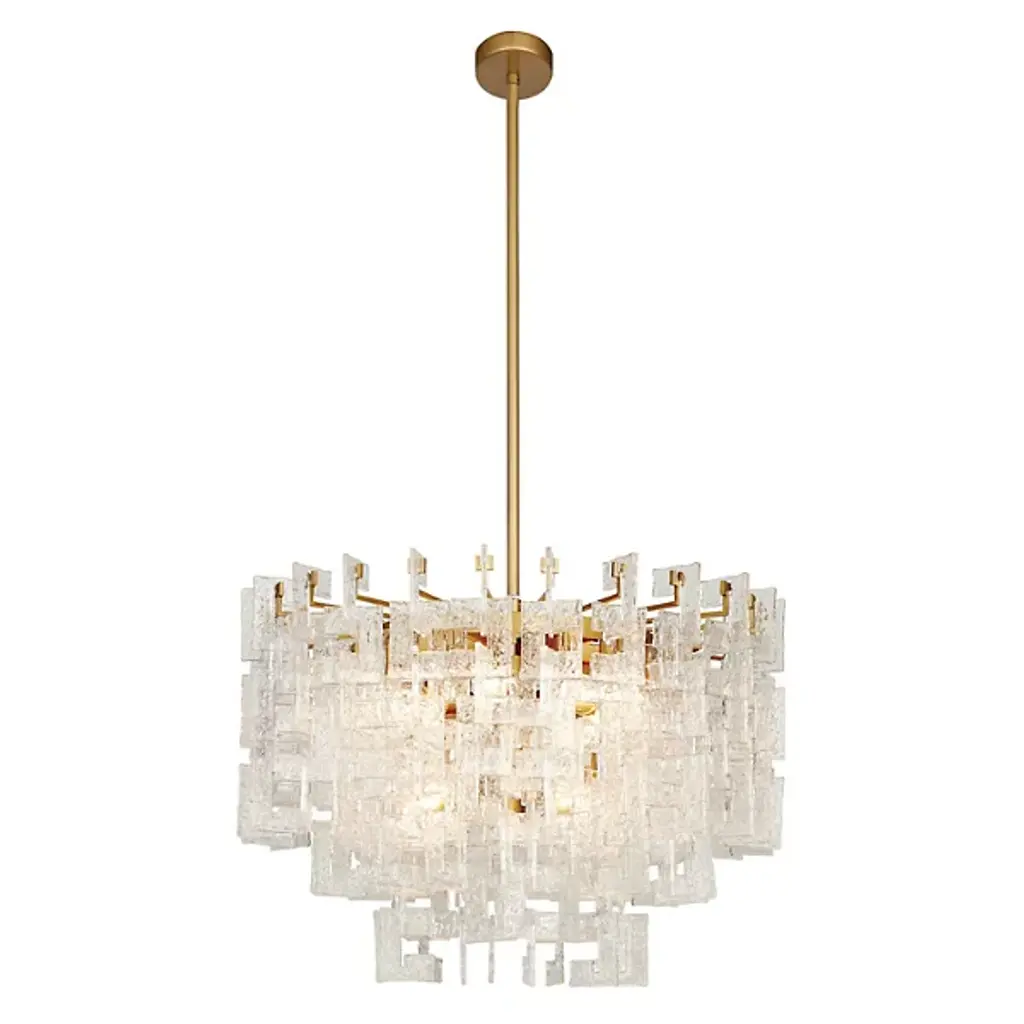 The Exposition Chandelier from Global Views is a stunning masterpiece, showcasing 265 intricately textured cast glass pieces elegantly suspended from a brushed brass iron framework. This artistic chandelier combines exquisite craftsmanship with luxurious materials, creating a breathtaking focal point for any space. The interplay of light and texture from the cast glass pieces adds a dynamic visual element, enhancing the chandelier's overall beauty and sophistication. It's a true testament to refined design and artistry.
