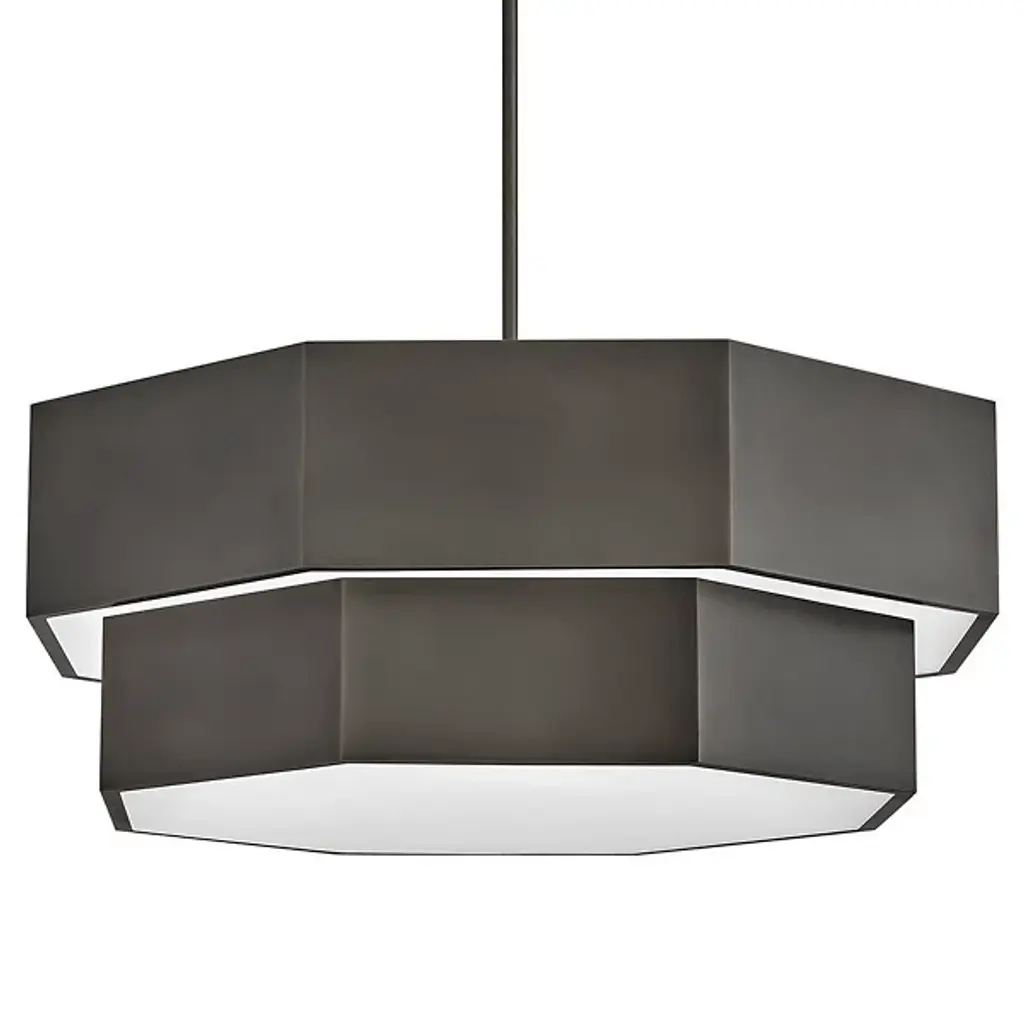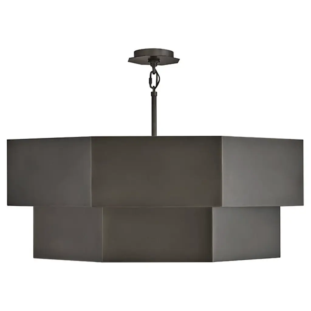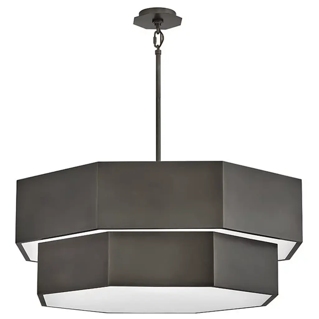 The Facet Chandelier from Hinkley uses angular geometry to create a multidimensional lighting experience. Each faceted plane interacts with light differently, producing varied luminosity across its drum-shaped structure. This fixture can adapt to various installation methods, functioning as either a pendant or semi-flush mount, depending on ceiling height and room dimensions. Multiple stem options allow for precise height adjustments to achieve ideal positioning in any space. The bold metal framework provides structure, defining the geometric planes that characterize this distinctive design. This chandelier works beautifully in dining areas, entryways, or modern living spaces where its architectural presence becomes a focal point.