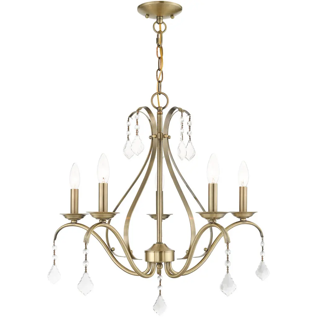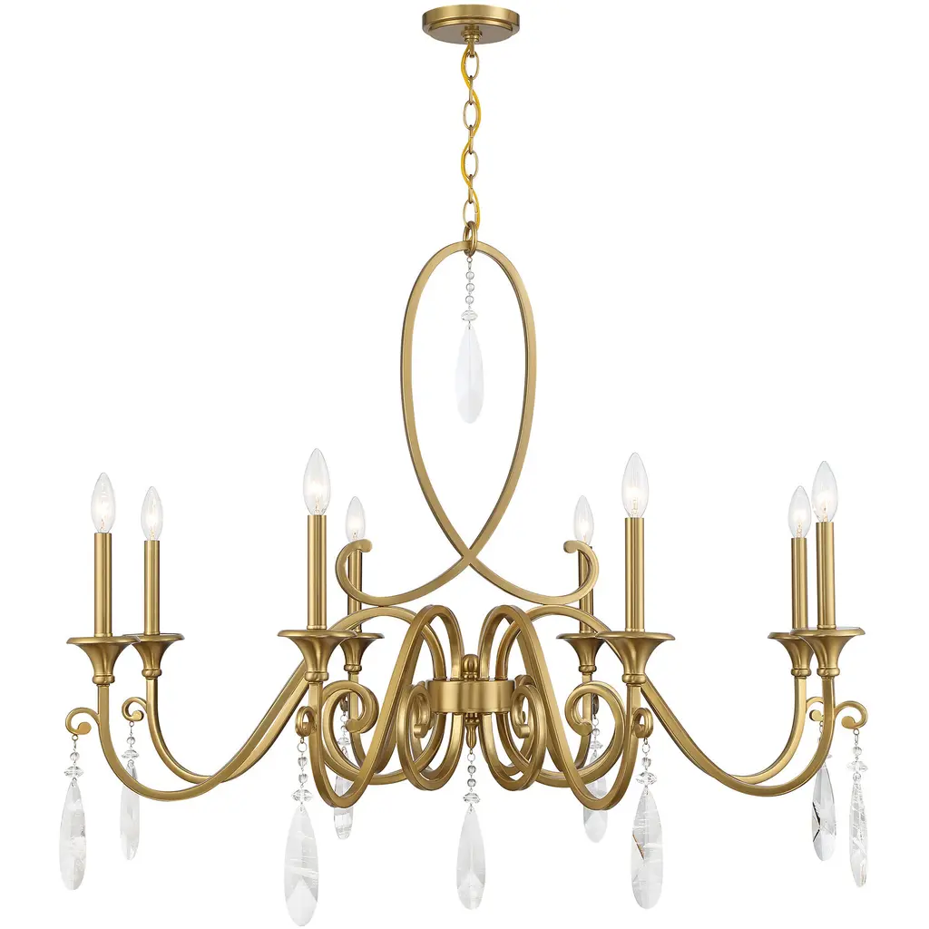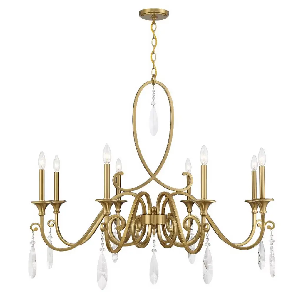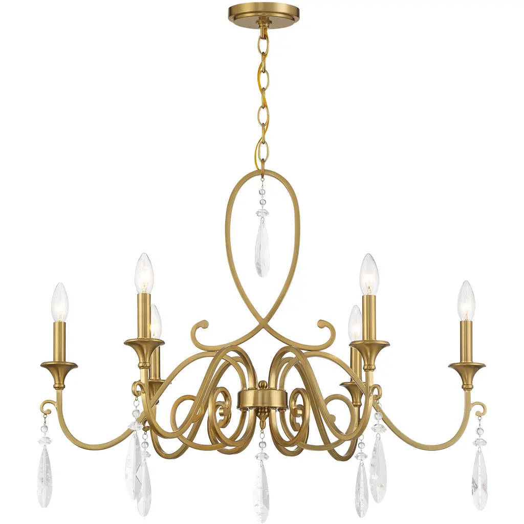 Intricate and elegant, the Savoy House Fairchild 6-light chandelier adds ornate beauty to any room. The curlicue arms are decorated with crystal adornments, including large faux rock drops that bring an exciting hint of natural inspiration. Finished in Warm Brass. Fairchild is 26" in height and 31" in width. Uses six candelabra size bulbs of up to 60 watts per bulb. Bulbs not included.
