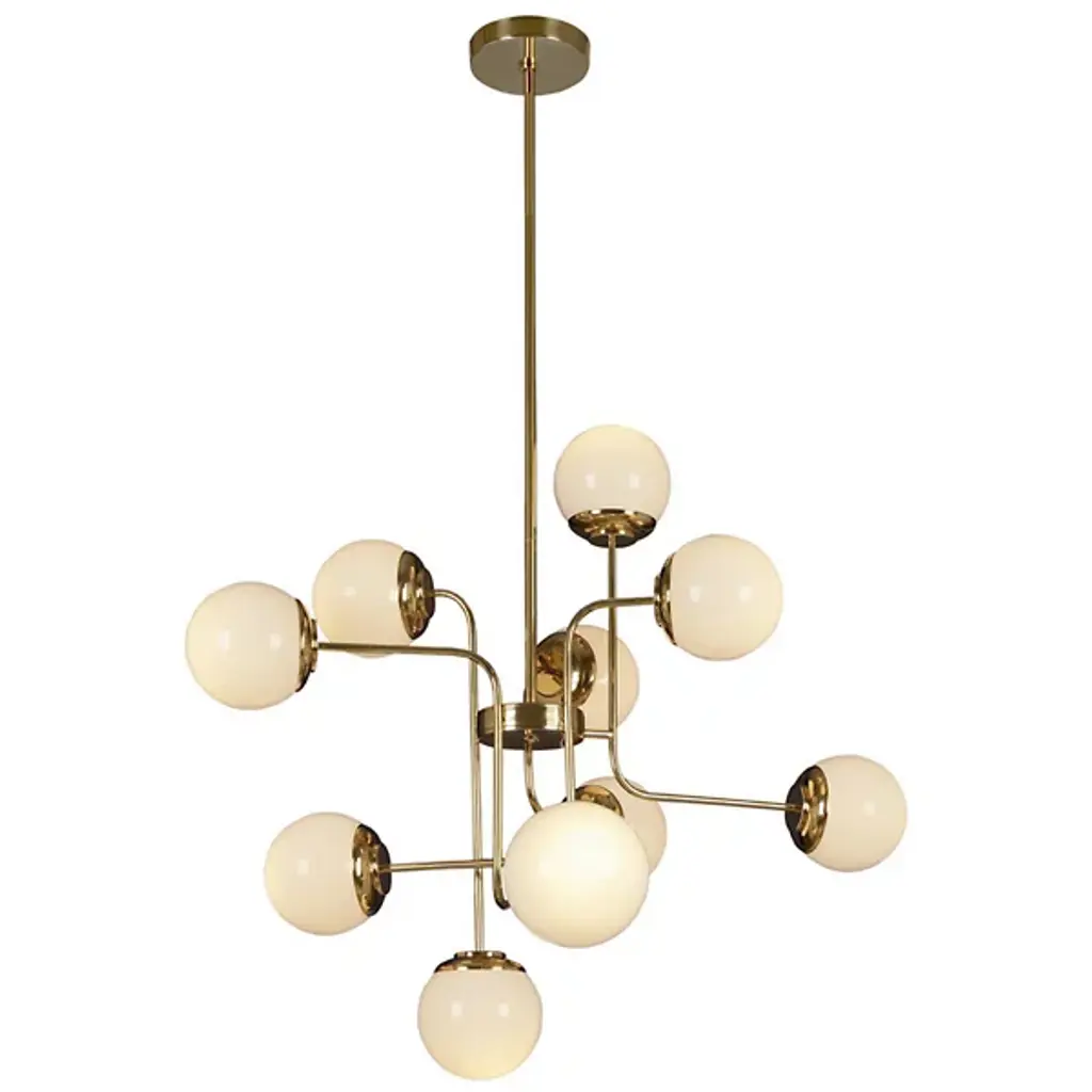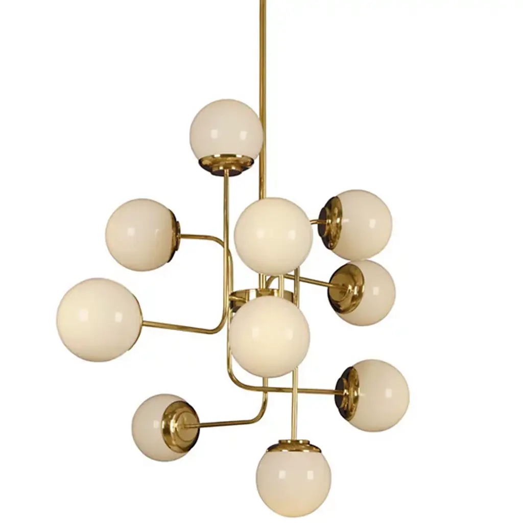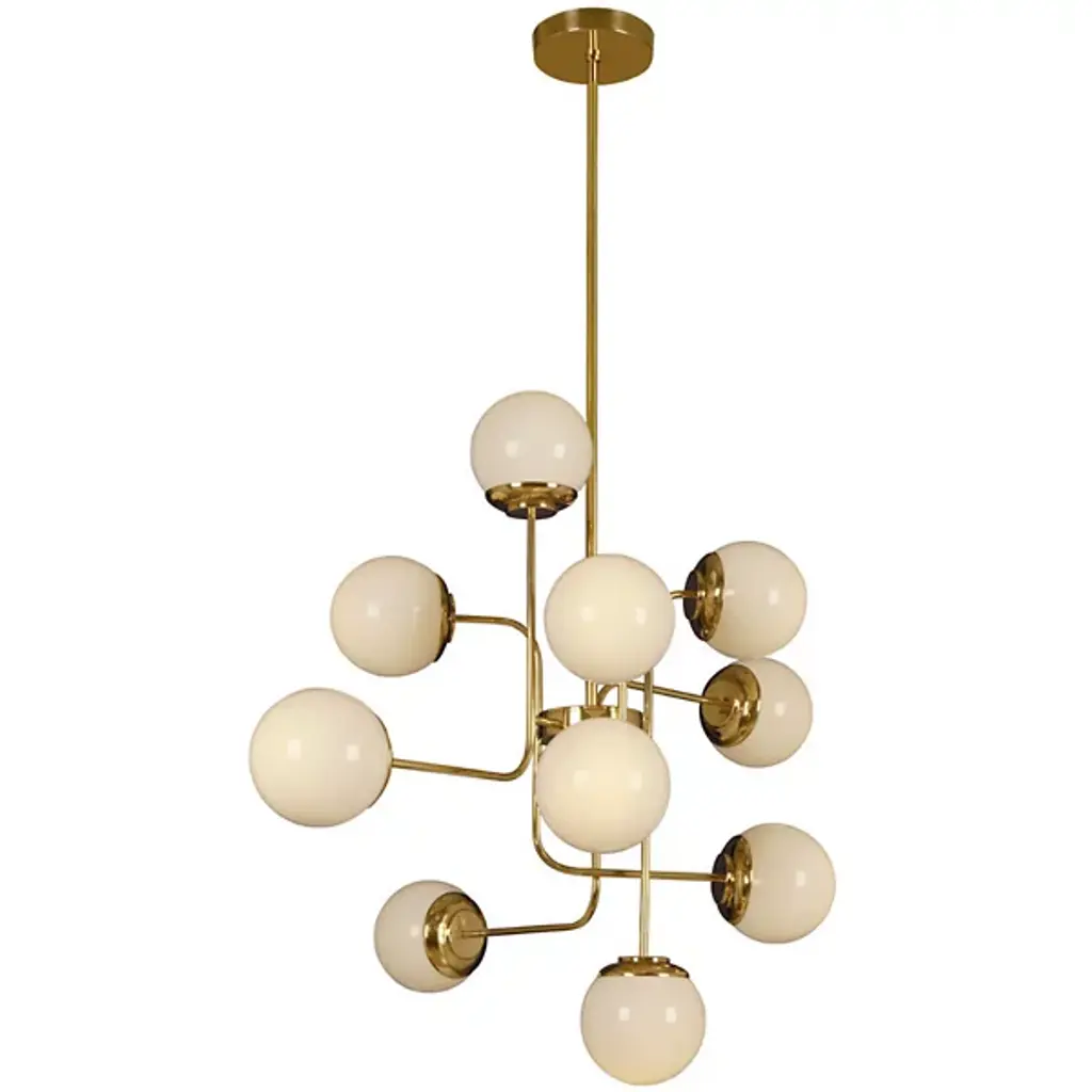 Designed by Juan Orts for Myo, the Fairmont Chandelier is a transitionally styled piece with mid-century modern influences throughout the composition. Made in Spain, it features gorgeous brass metalwork and double-white opal glass shading for a pleasant diffusion of light. The graceful fashion in which this piece displays will help provide an elevated illumination experience. The Fairmont can be installed solo or in multiples to help bring your vision to cohesion.