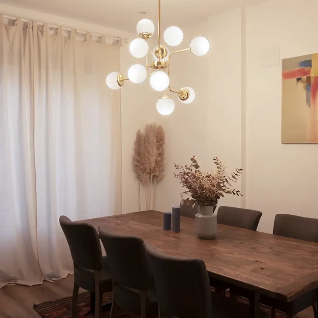 Designed by Juan Orts for Myo, the Fairmont Chandelier is a transitionally styled piece with mid-century modern influences throughout the composition. Made in Spain, it features gorgeous brass metalwork and double-white opal glass shading for a pleasant diffusion of light. The graceful fashion in which this piece displays will help provide an elevated illumination experience. The Fairmont can be installed solo or in multiples to help bring your vision to cohesion.