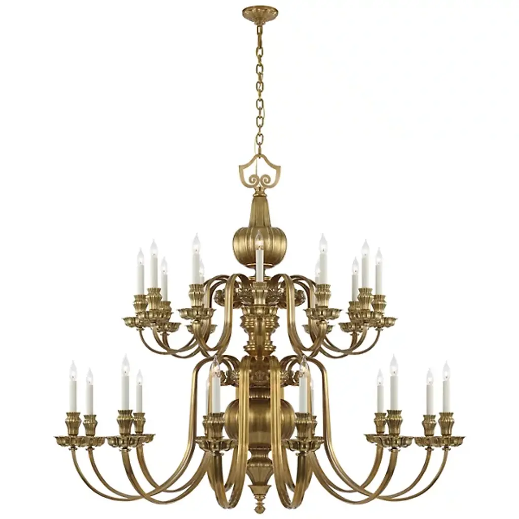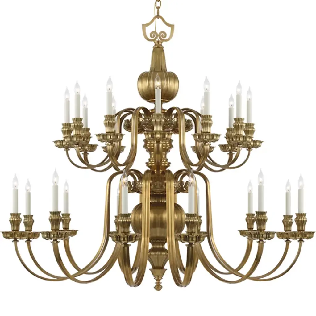 The Falaise Chandelier from Visual Comfort Signature promises to be an unforgettable favorite of large open spaces seeking a charming vintage intricacy. A curving Ralph Lauren design in rich, detail-accented brass, its style is fit for a palace or a country mansion, descending from a contoured canopy via a single chain. The luxurious lines and layered design of its contoured body suspend two tiers of lamping below, each curling arm extending a single candelabra in an evenly-spaced array around the fixture, gracing its surroundings with a crown of light.