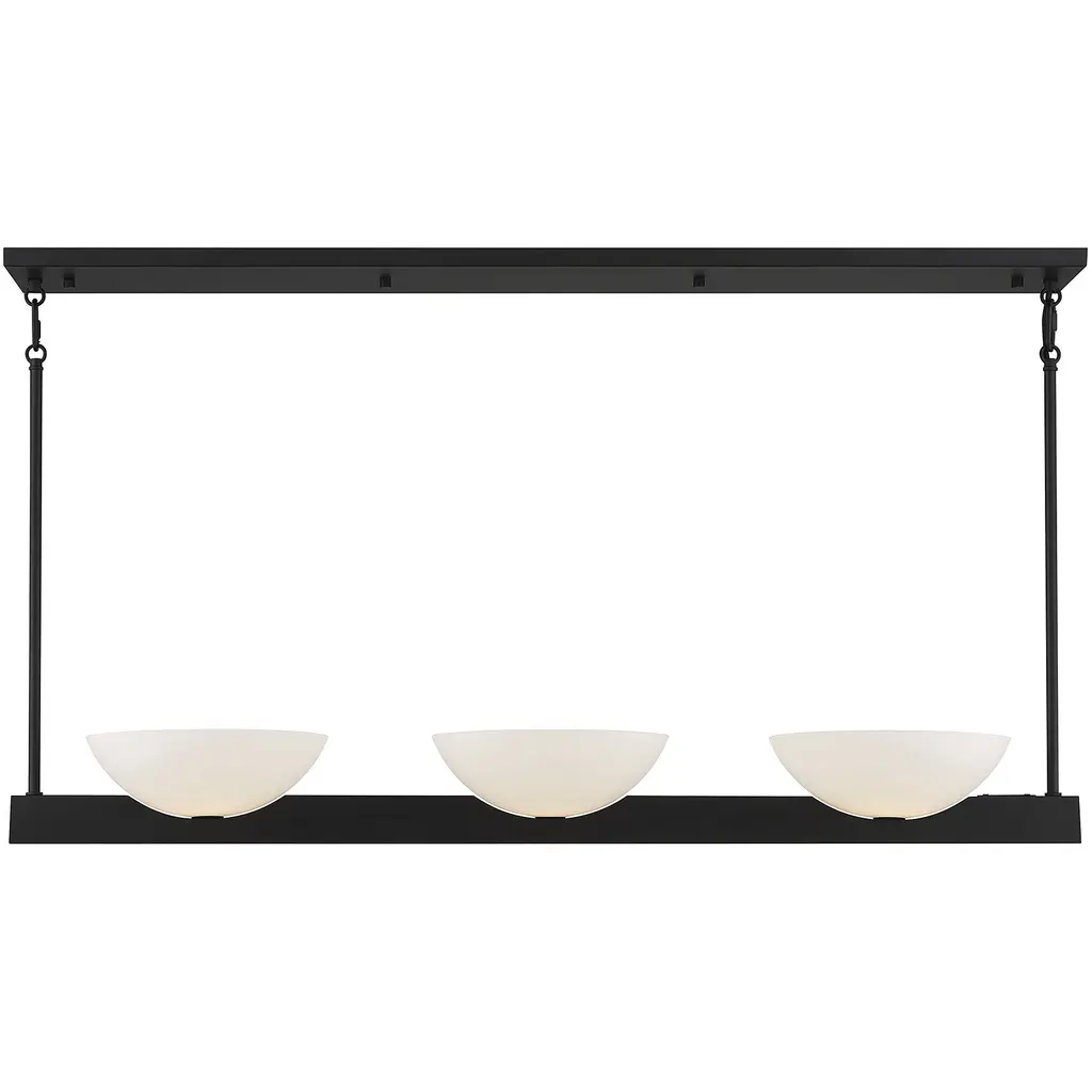 The Savoy House Fallon 3-light linear chandelier draws inspiration from Art Deco style, bringing you a look that is both timeless and classic. Generously sized shades of white opal glass and a matte black finish ensure bright, beautiful illumination. Fallon is 45" in length, 10" in width and has an adjustable height ranging from 10.5" to 56.5". Uses three G9 bulbs, not included. Comes with eight 12" downrods and two 6" downrods, plus 80" of cord.