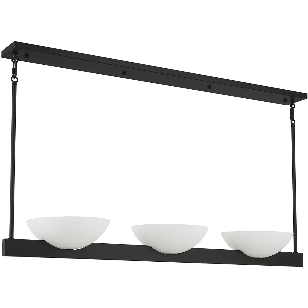 The Savoy House Fallon 3-light linear chandelier draws inspiration from Art Deco style, bringing you a look that is both timeless and classic. Generously sized shades of white opal glass and a matte black finish ensure bright, beautiful illumination. Fallon is 45" in length, 10" in width and has an adjustable height ranging from 10.5" to 56.5". Uses three G9 bulbs, not included. Comes with eight 12" downrods and two 6" downrods, plus 80" of cord.