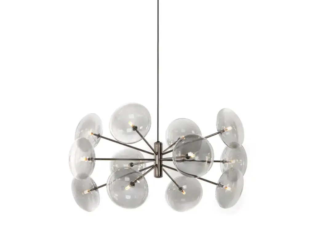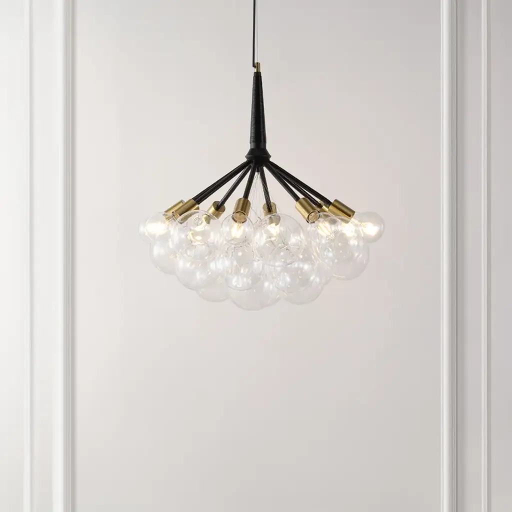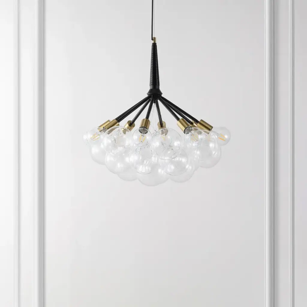 Add an artful and radiant focal point to your space with our stunning Raminder chandelier. Showcasing a stunning play of forms, materials, and finishes, our chandelier serves as an elevated and eye-catching addition. Its slender radiating arms create a beautiful cluster of spherical shades. Vouching for a sculptural presence, our chandelier remains a true stunner. It is accented with a black body and gleaming brass hardware for added drama and elegance. Casting a warm and inviting glow upon the clear glass shades, our chandelier creates a dramatic ambience in your entryway, dining, or living space.
