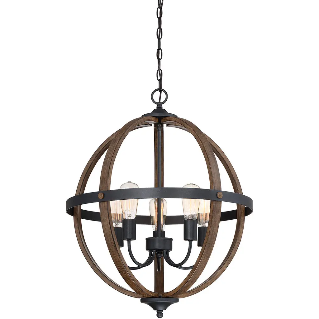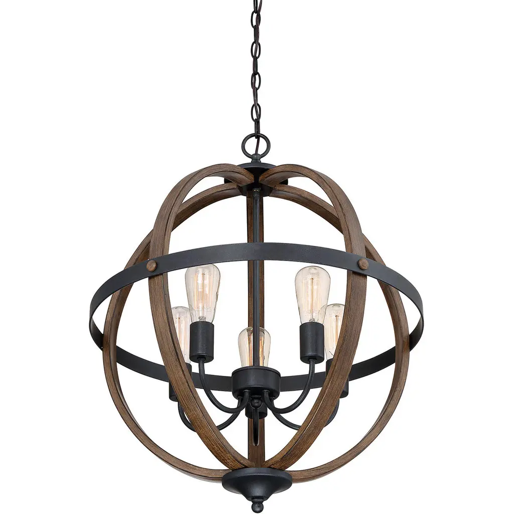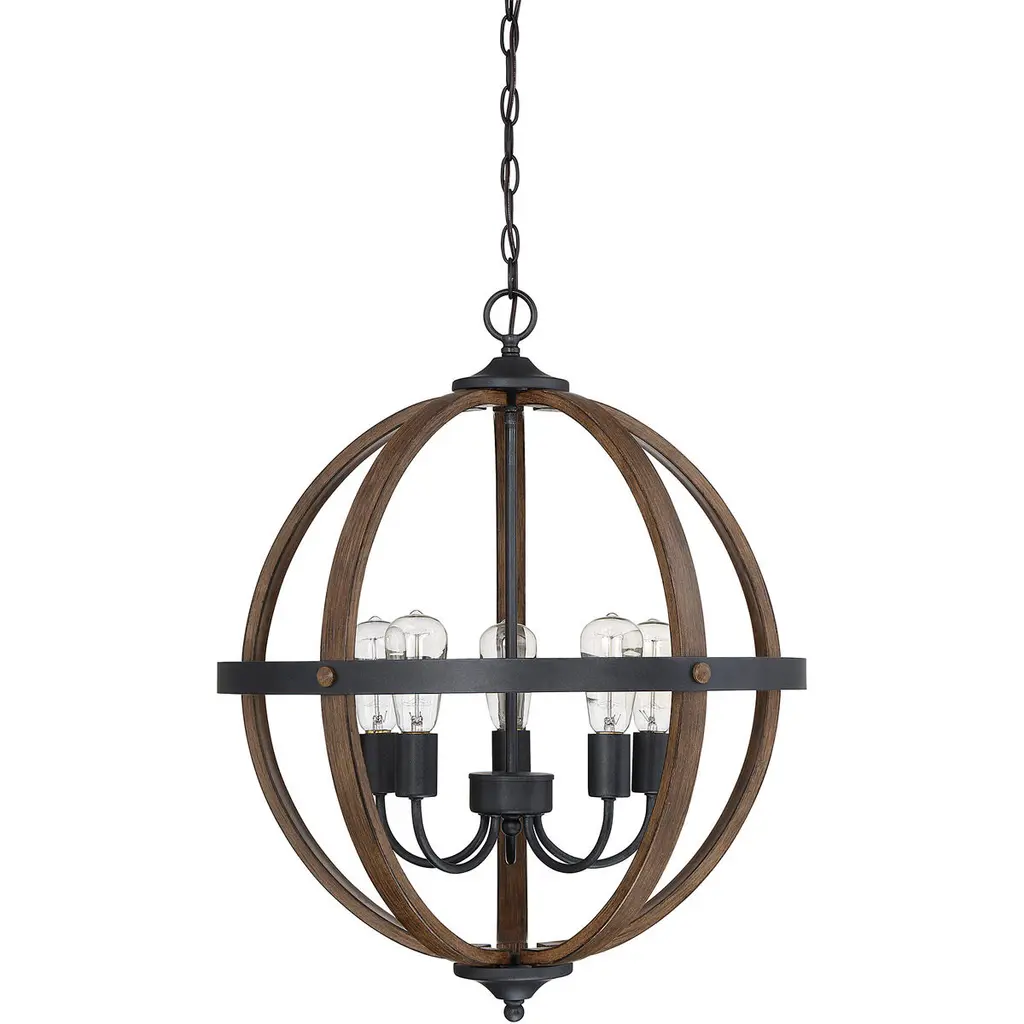 This large hoop style 5-light pendant makes a big style statement in your home Wood and Black finish. 28" in height and 22" in width.