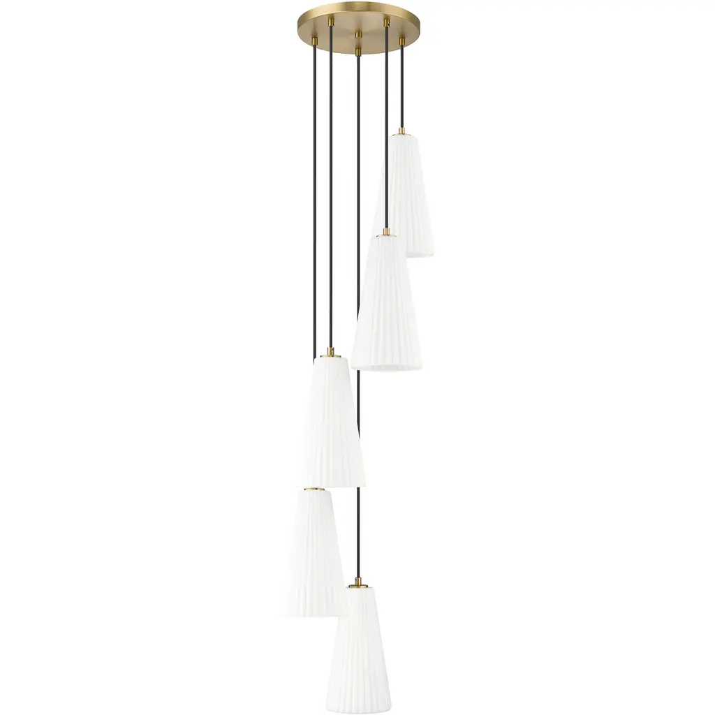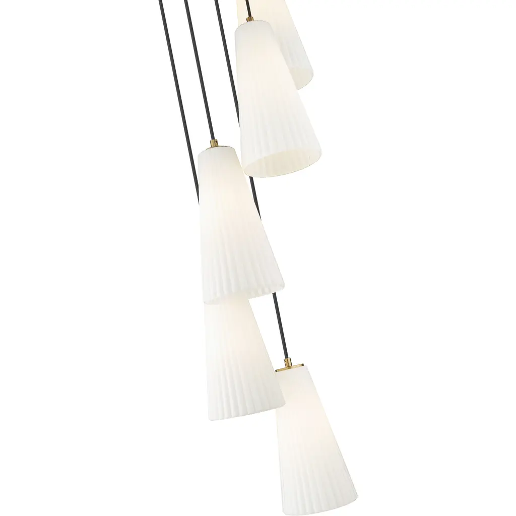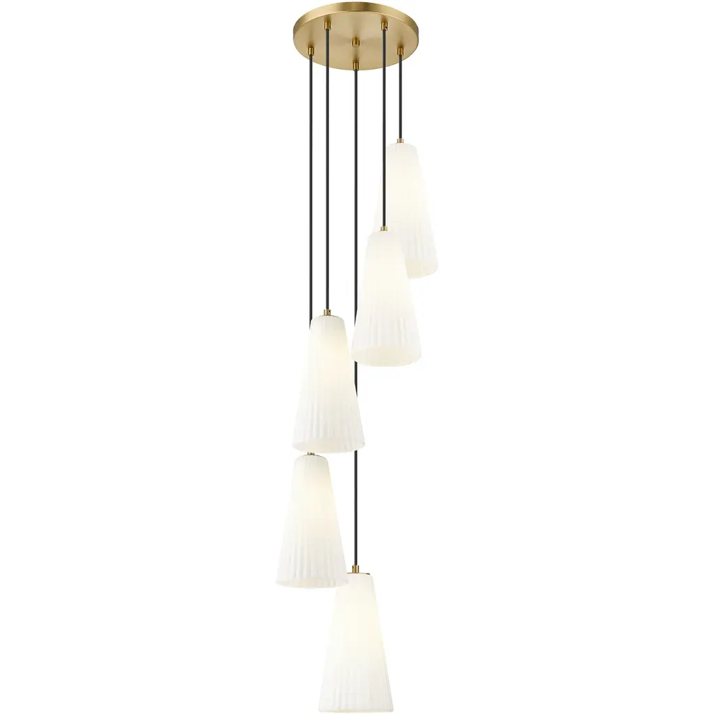 Delicate fluting adds refined energy and elegance to a modern five-light chandelier. Its spiral silhouette is a chic addition over a staircase or in a formal space, while a modern gold finish adds the perfect dose of warmth. Fluted glass shades are crafted in frosted glass, creating the perfect touch of softness.