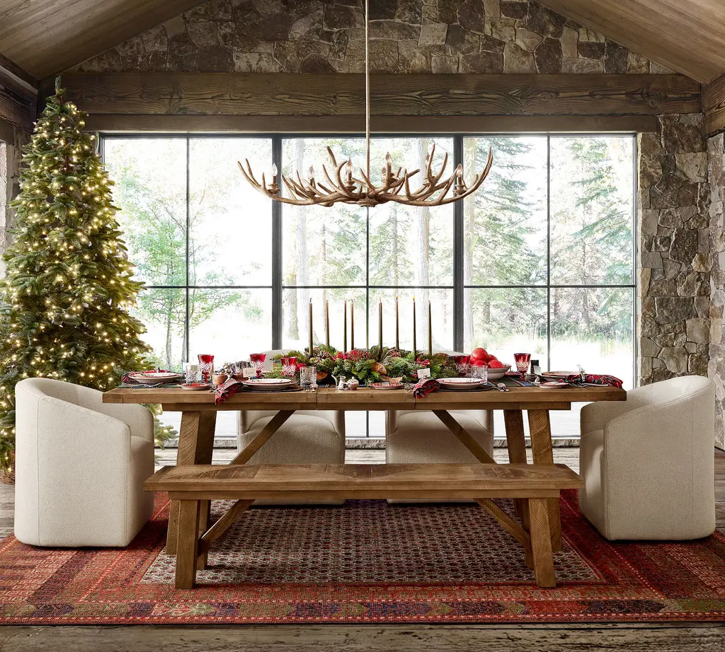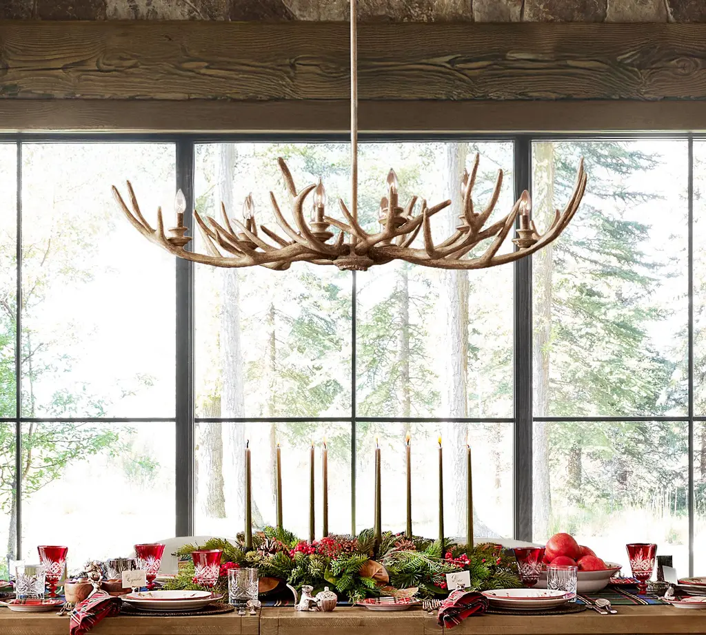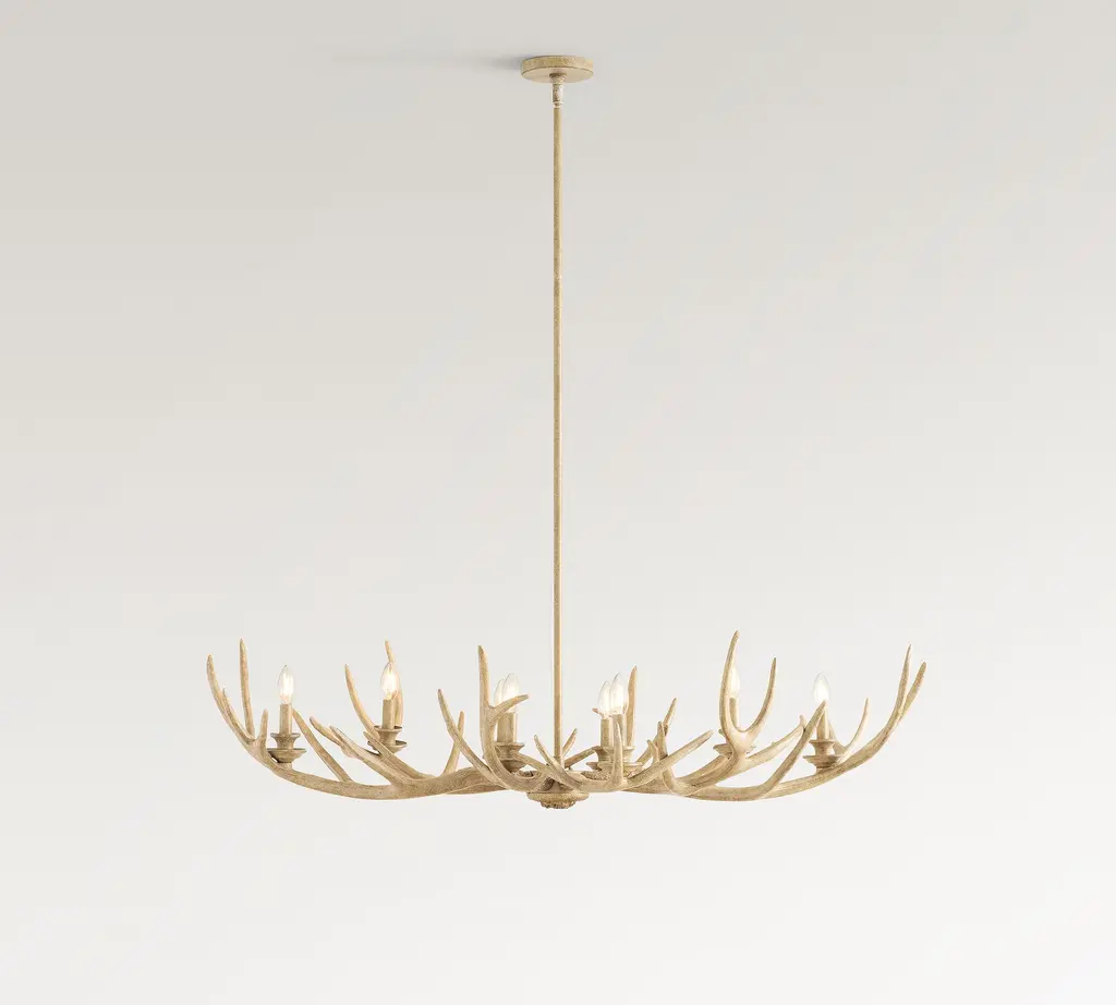 Like the fixtures in alpine mountain lodges, this linear chandelier exudes a warm, rustic charm. The antlers are carefully sculpted then painted by hand to create their natural look.