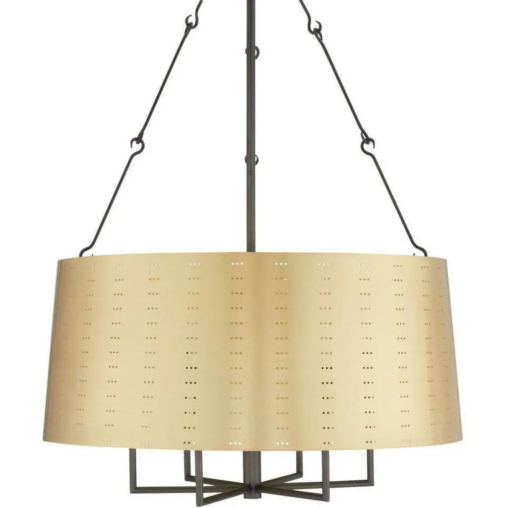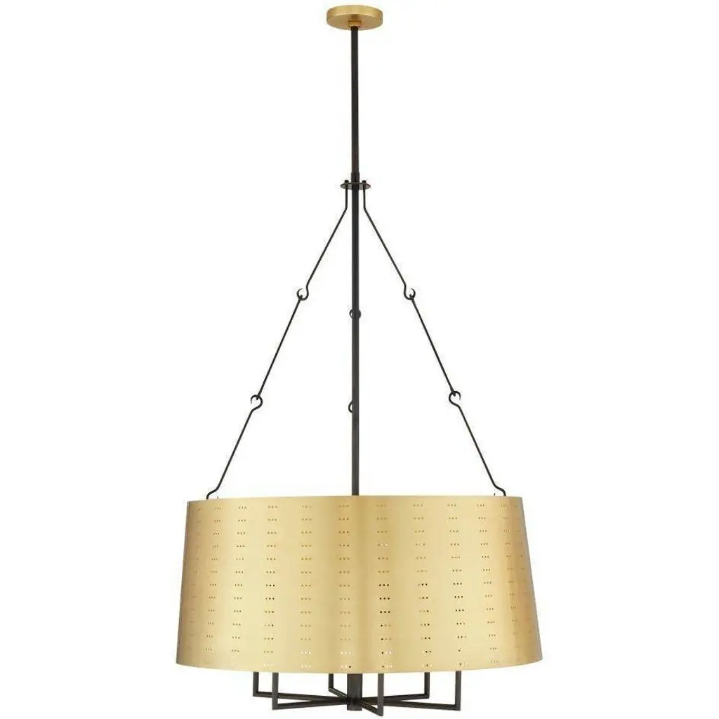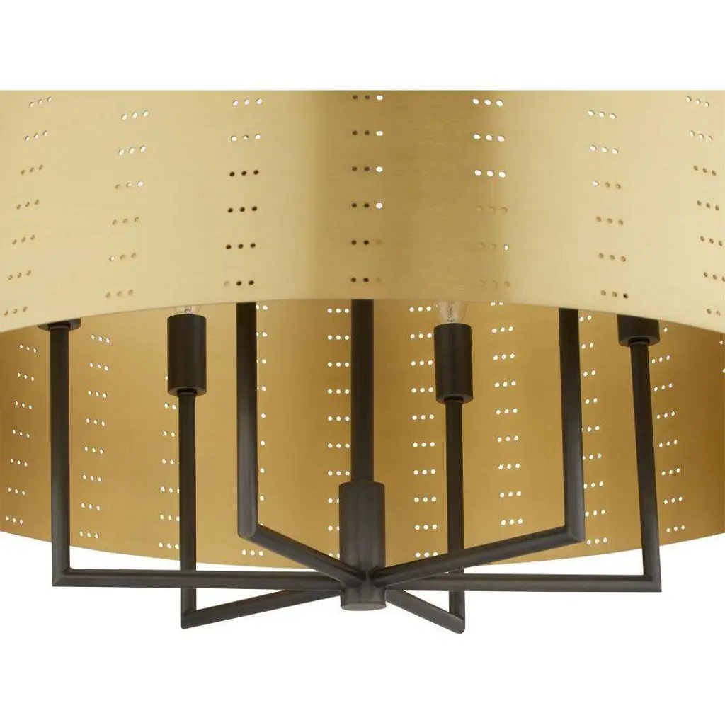 We perforated the Felipe to cast subtle shadows for a lace effect. Architecturally inspired, it juxtaposes an antique brass-plated iron shade with English bronze-plated iron arms and pipe. Damp-rated, although limited covered outdoor areas may affect finish.