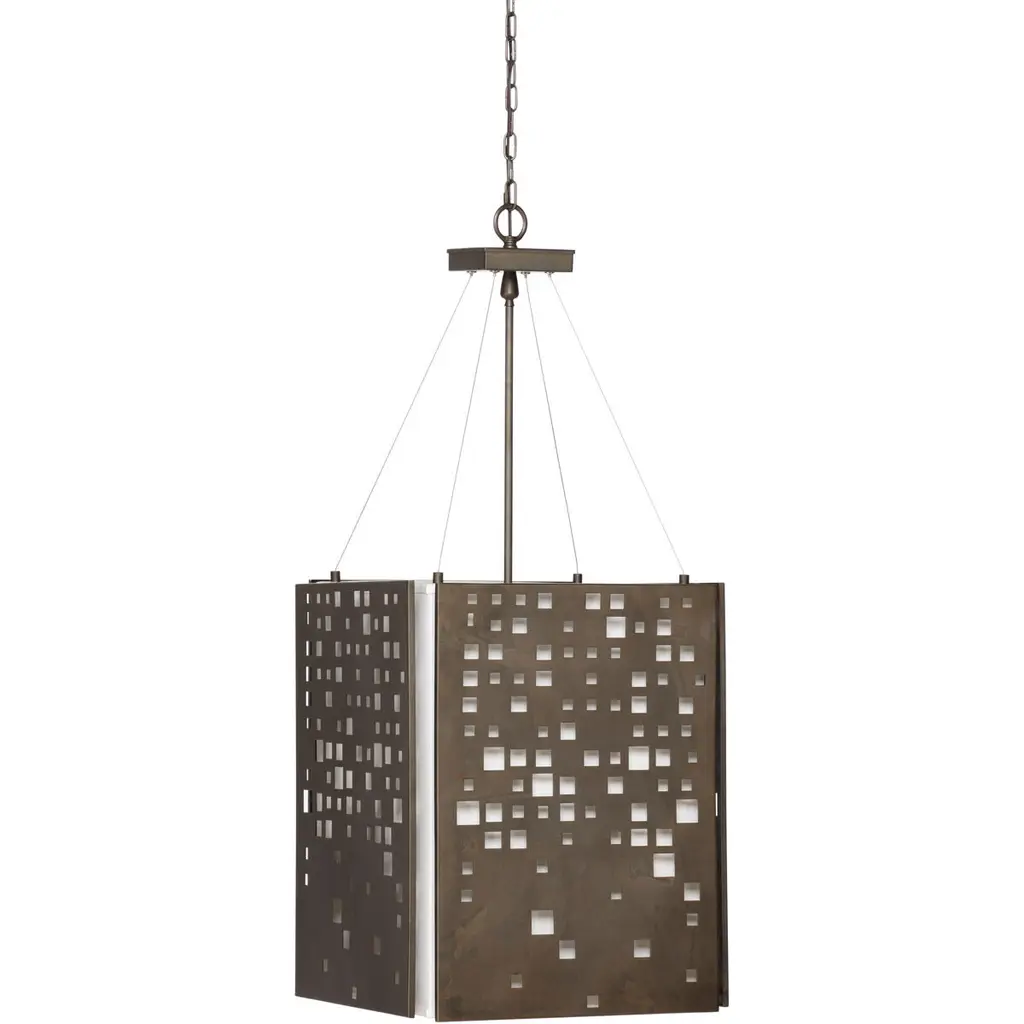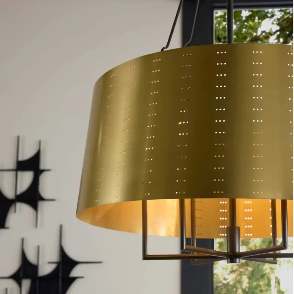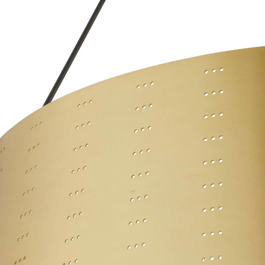 We perforated the Felipe to cast subtle shadows for a lace effect. Architecturally inspired, it juxtaposes an antique brass-plated iron shade with English bronze-plated iron arms and pipe. Damp-rated, although limited covered outdoor areas may affect finish.